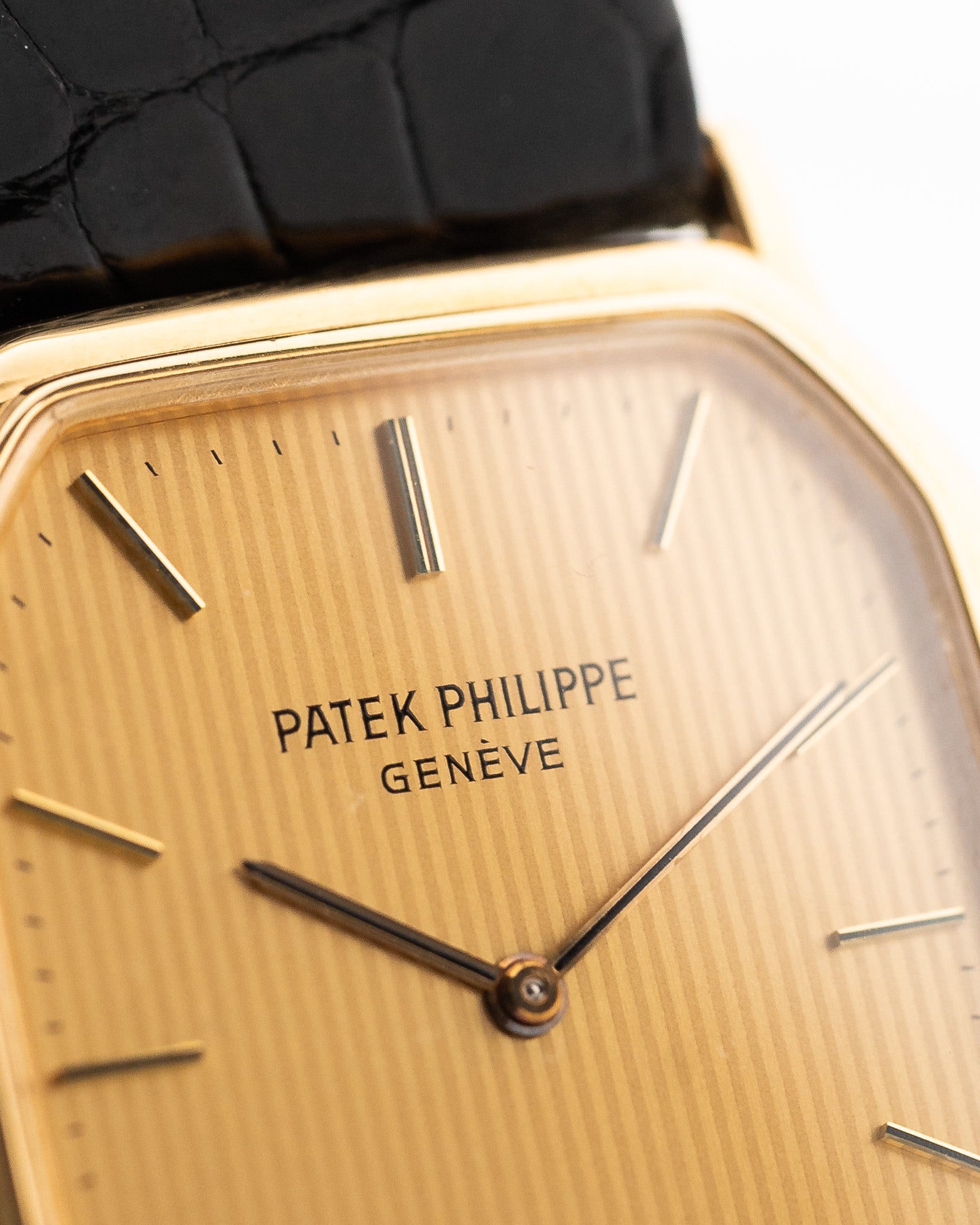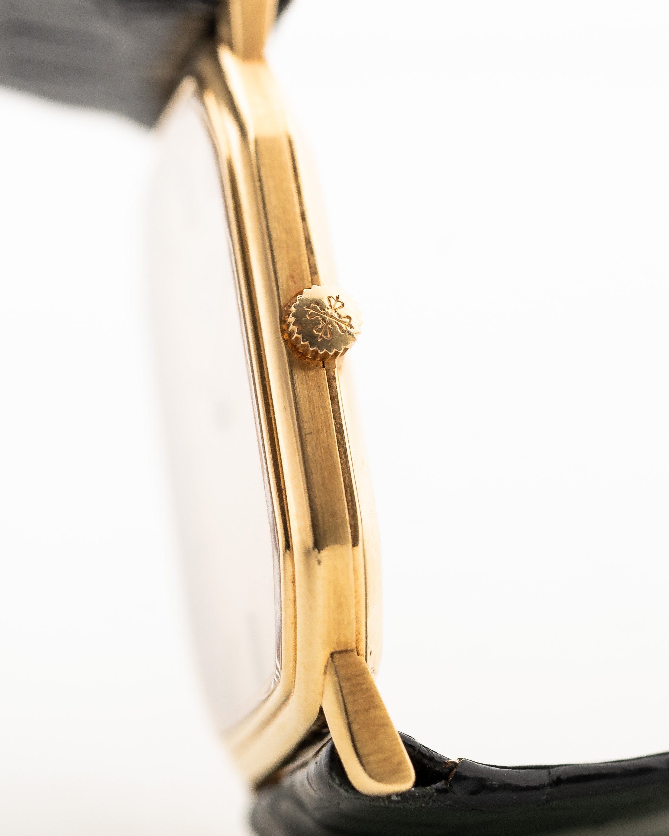 Qui abbiamo un'eccellente rappresentazione degli orologi da abito di Patek Philippes, questa ref. 3760 ha raggiunto tutte le note più alte con una cassa rettangolare in oro giallo 18 carati, anse corte e tornite, un meraviglioso e pulito quadrante Sigma con carta da parati a righe color oro, indici e lancette a bastone con intarsi in onice.