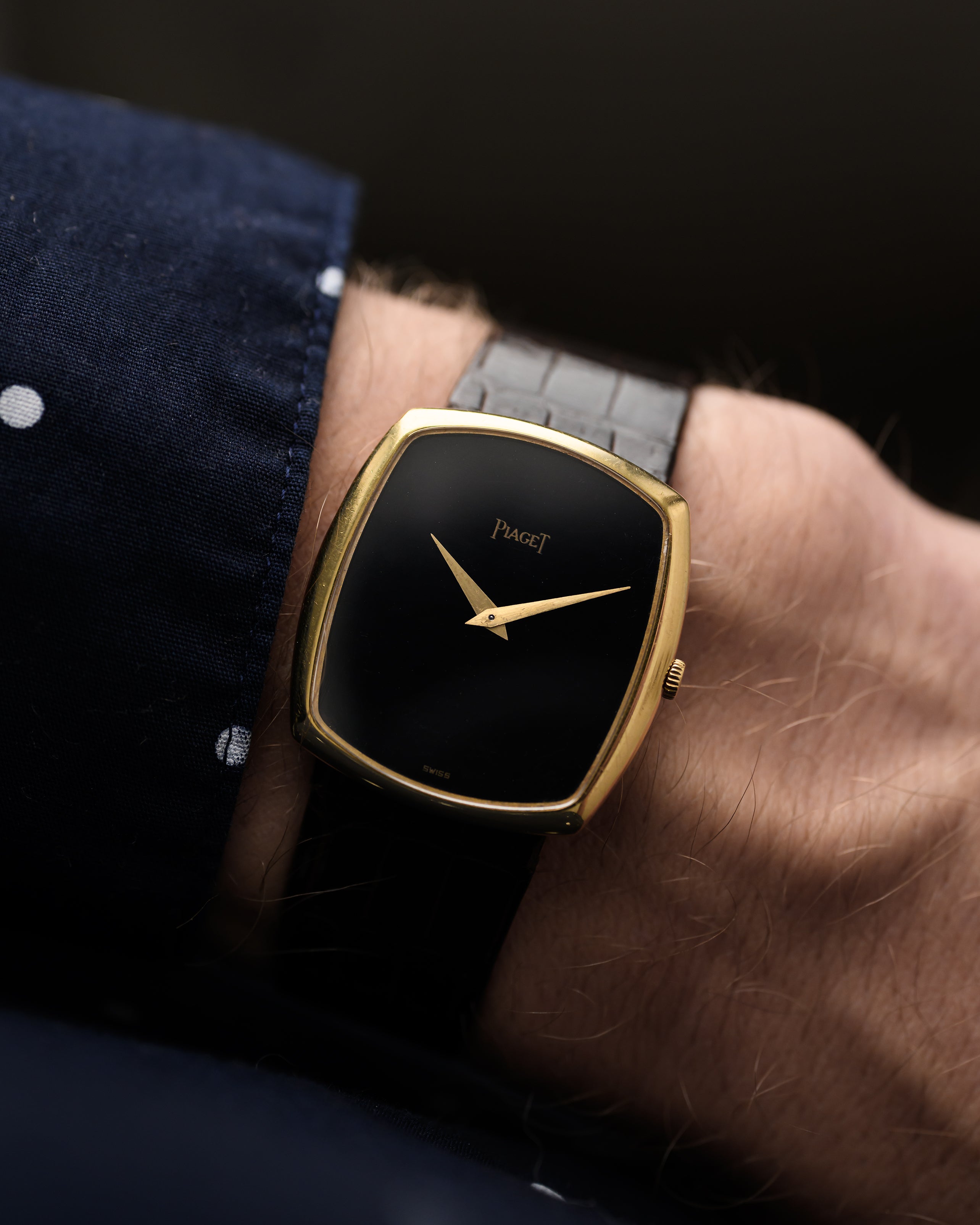 La sua sottigliezza non è stata solo un risultato tecnico, ma ha anche permesso alla manifattura di montare quadranti in pietre dure, mantenendo un profilo sottile, come questo impeccabile quadrante nero lucido.