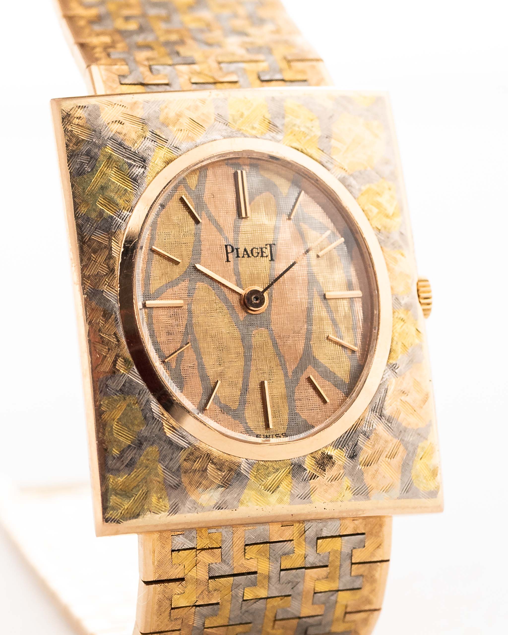 Questo Piaget ci ha lasciato senza fiato a prima vista. Queste forme geometriche combinate con il bracciale in oro 18 carati forgiato, la cassa e il quadrante composto da elementi in oro bianco, giallo e rosa sono uno dei più rari da trovare. La corona e gli indici a bastone con il classico logo Piaget completano questo pezzo d'arte.