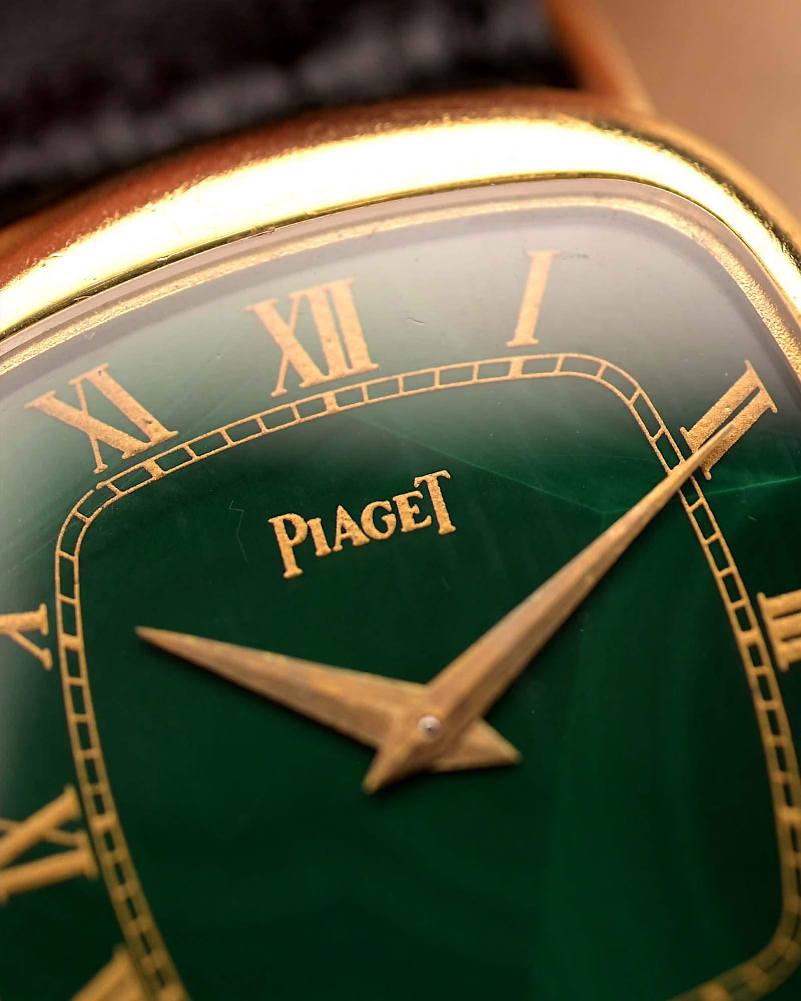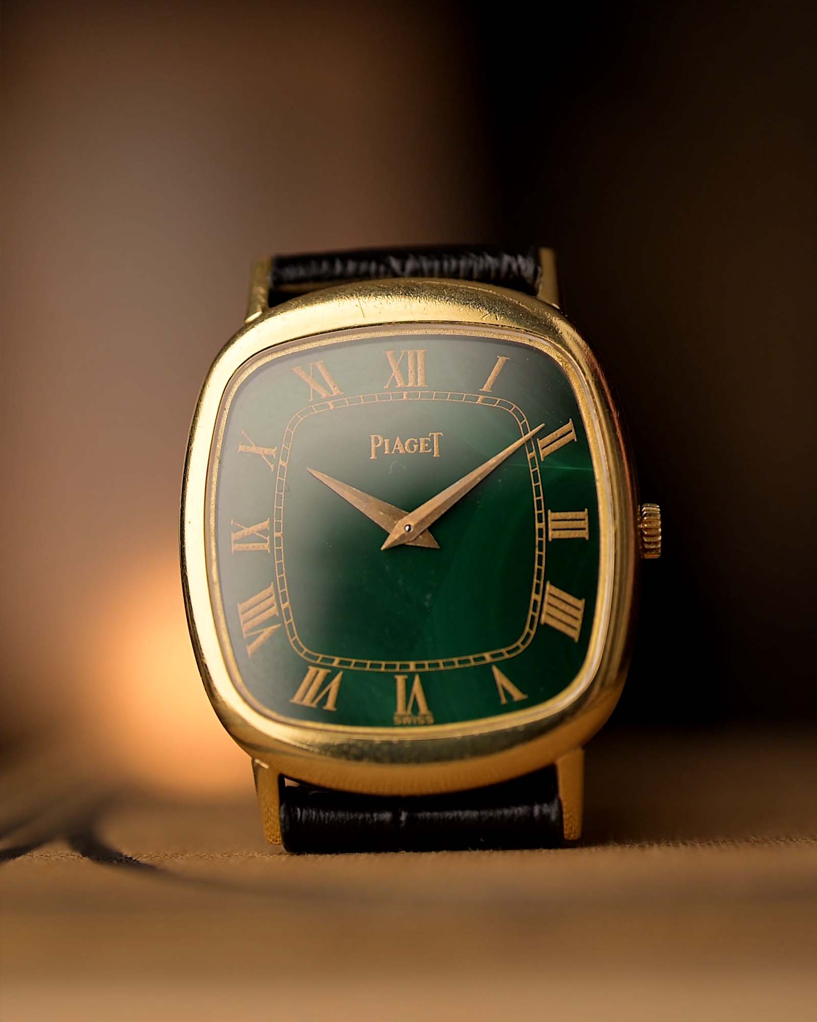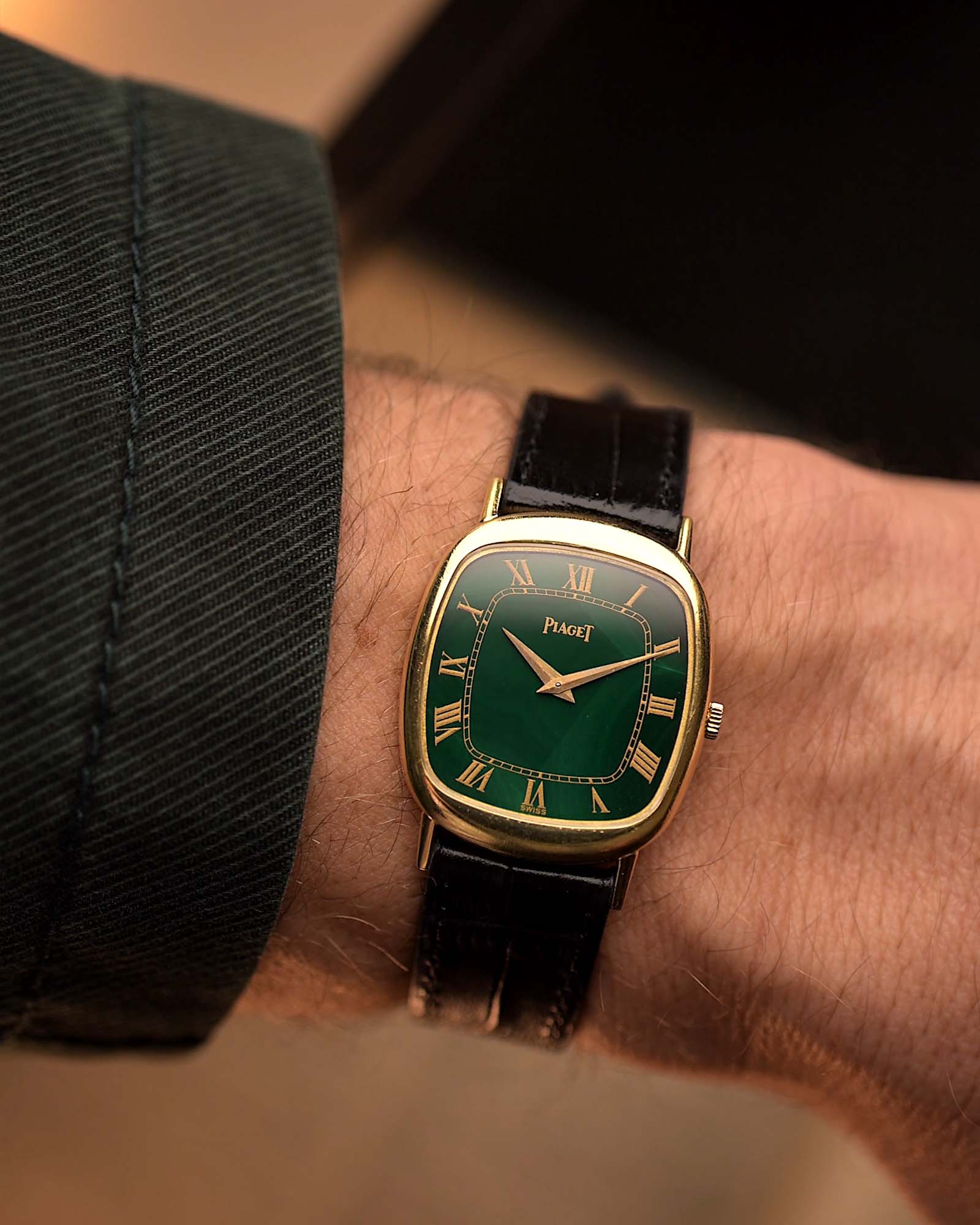 Il quadrante in malachite naturale è intatto e dalla forma intramontabile, piacevole al tatto e discretamente elegante: questo modello racchiude lo spirito dell'epoca d'oro di Piaget.
