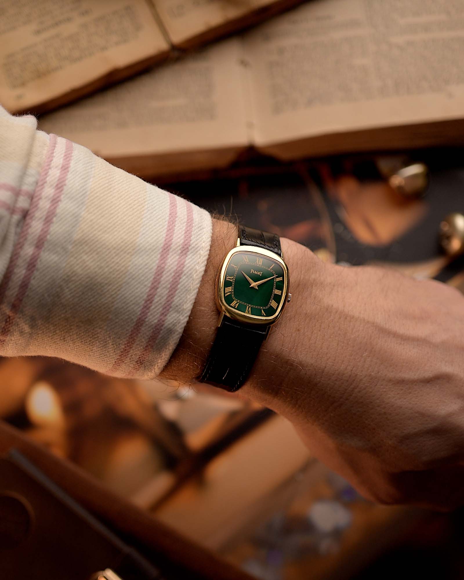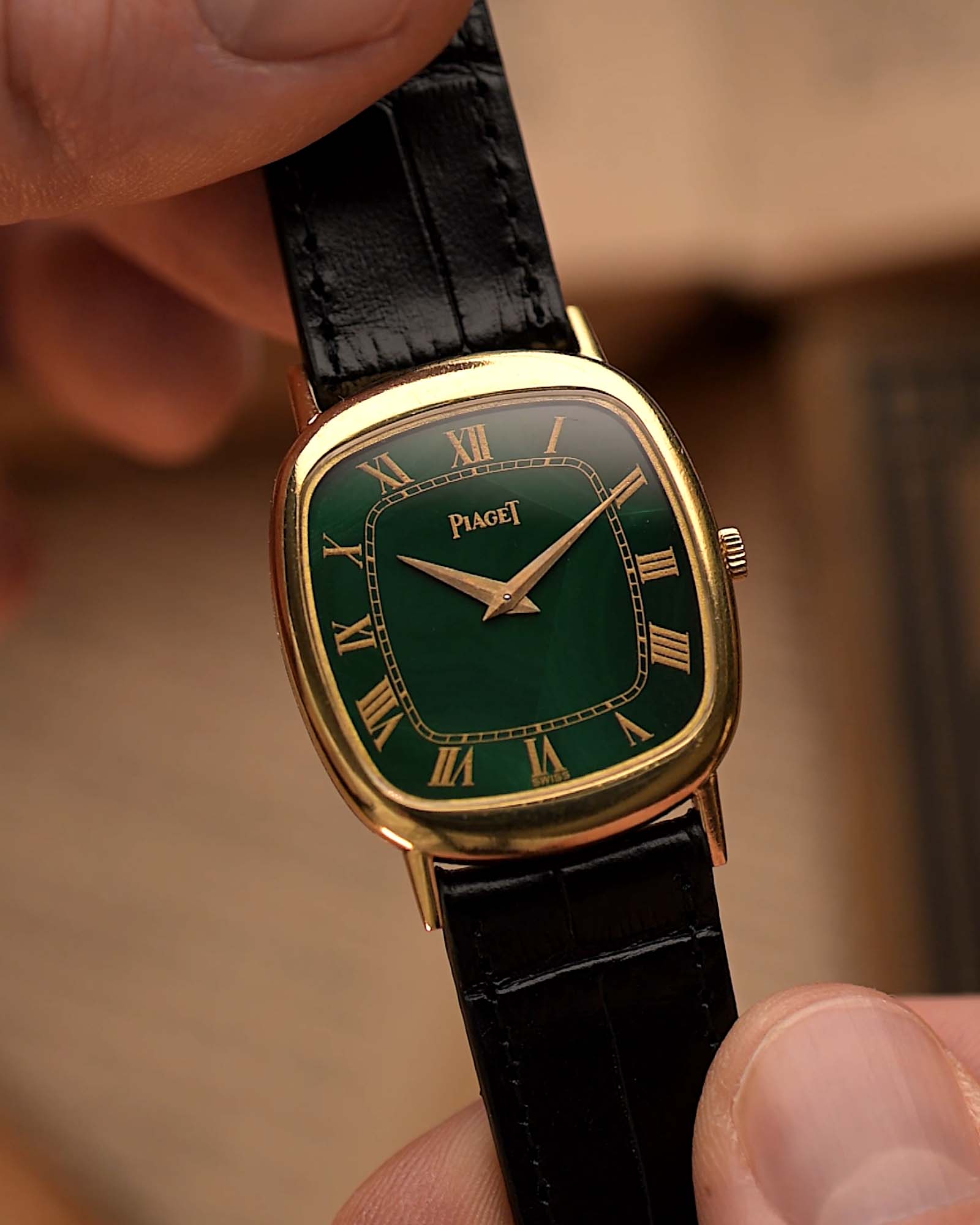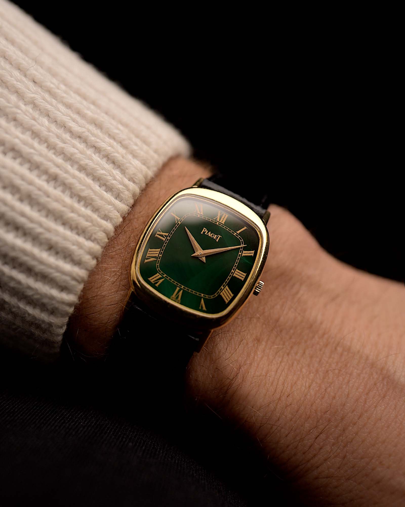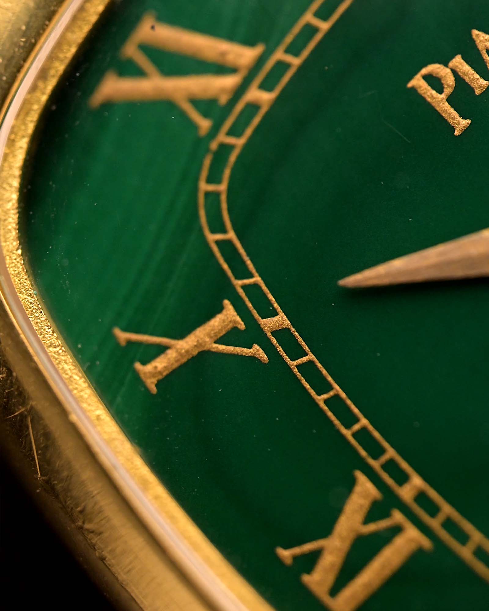 Il quadrante in malachite naturale è intatto e dalla forma intramontabile, piacevole al tatto e discretamente elegante: questo modello racchiude lo spirito dell'epoca d'oro di Piaget.
