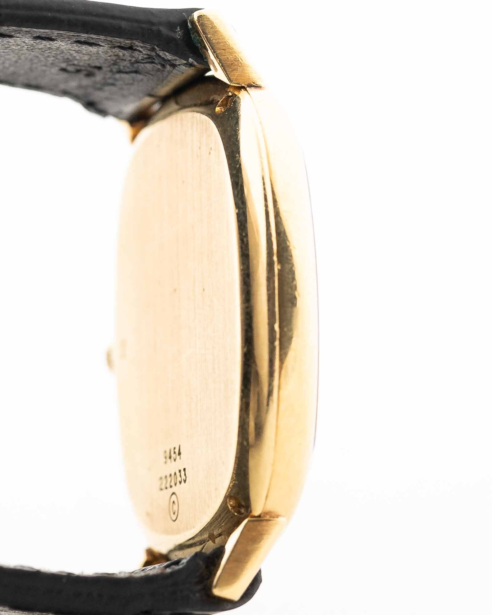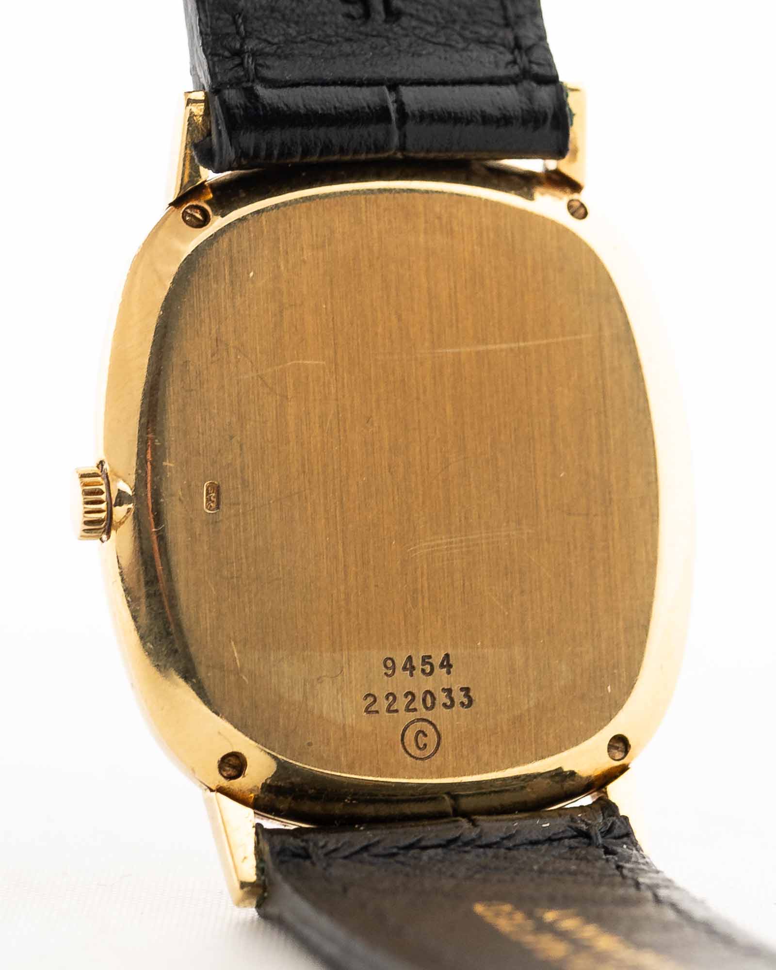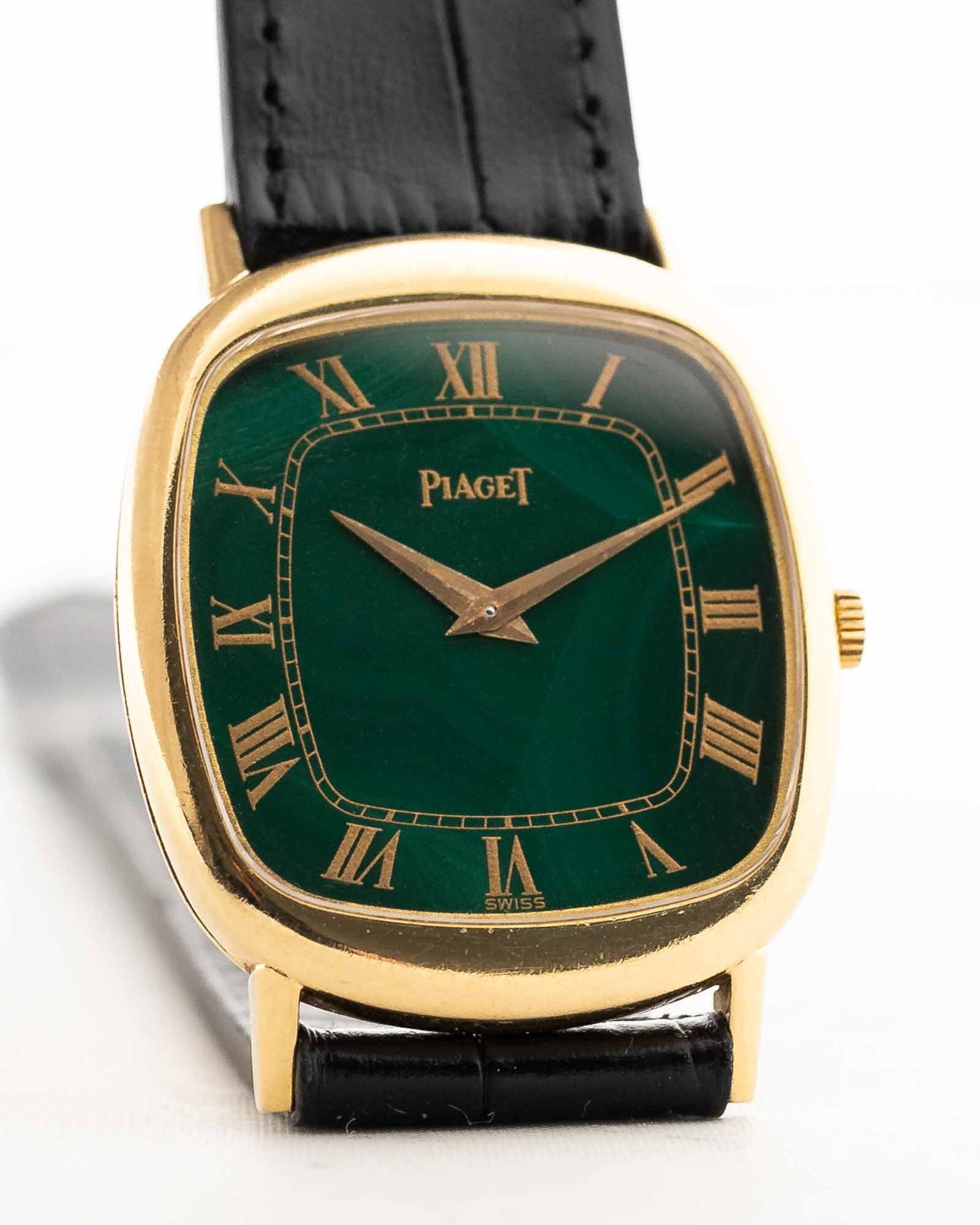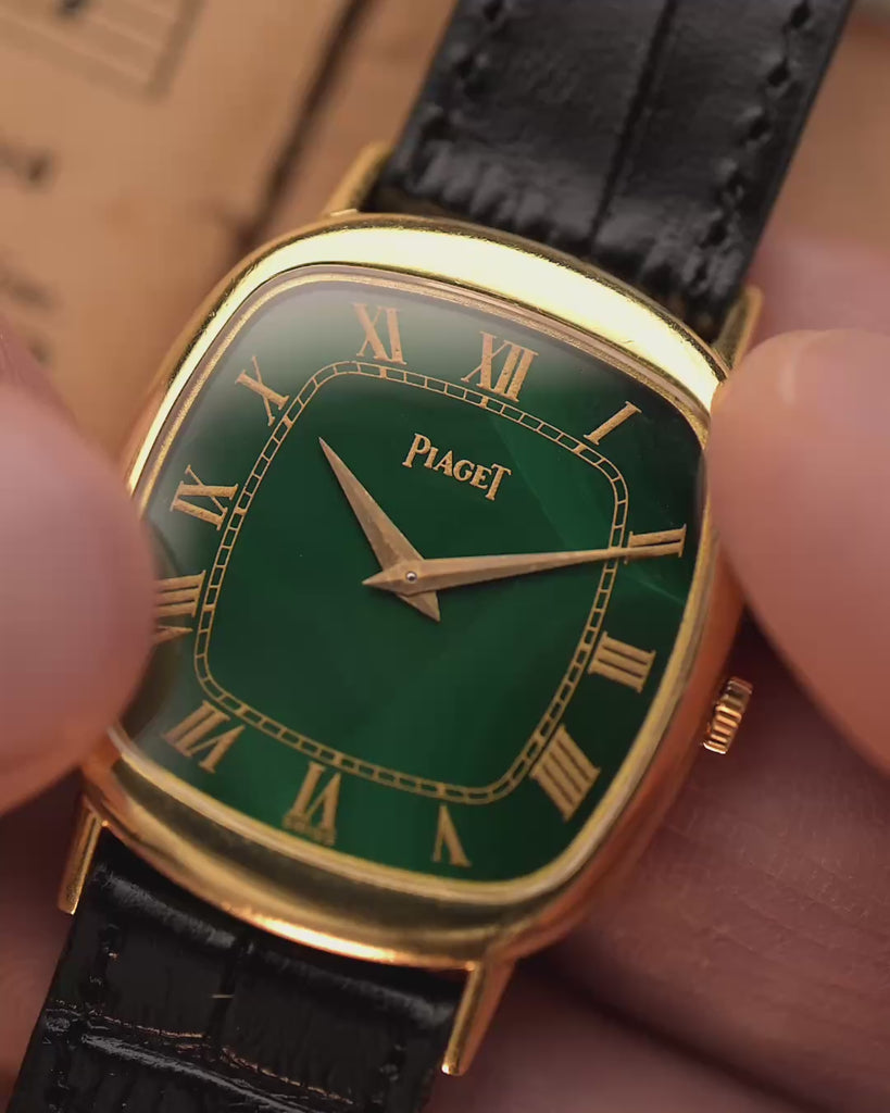 Pochi orologi incarnano l'eleganza degli anni '70 come questo Piaget Ref. 9454: un'elegante creazione a forma di serbatoio realizzata in oro giallo massiccio 18 carati e dotata di un quadrante in malachite naturale che brilla con una profondità stratificata.