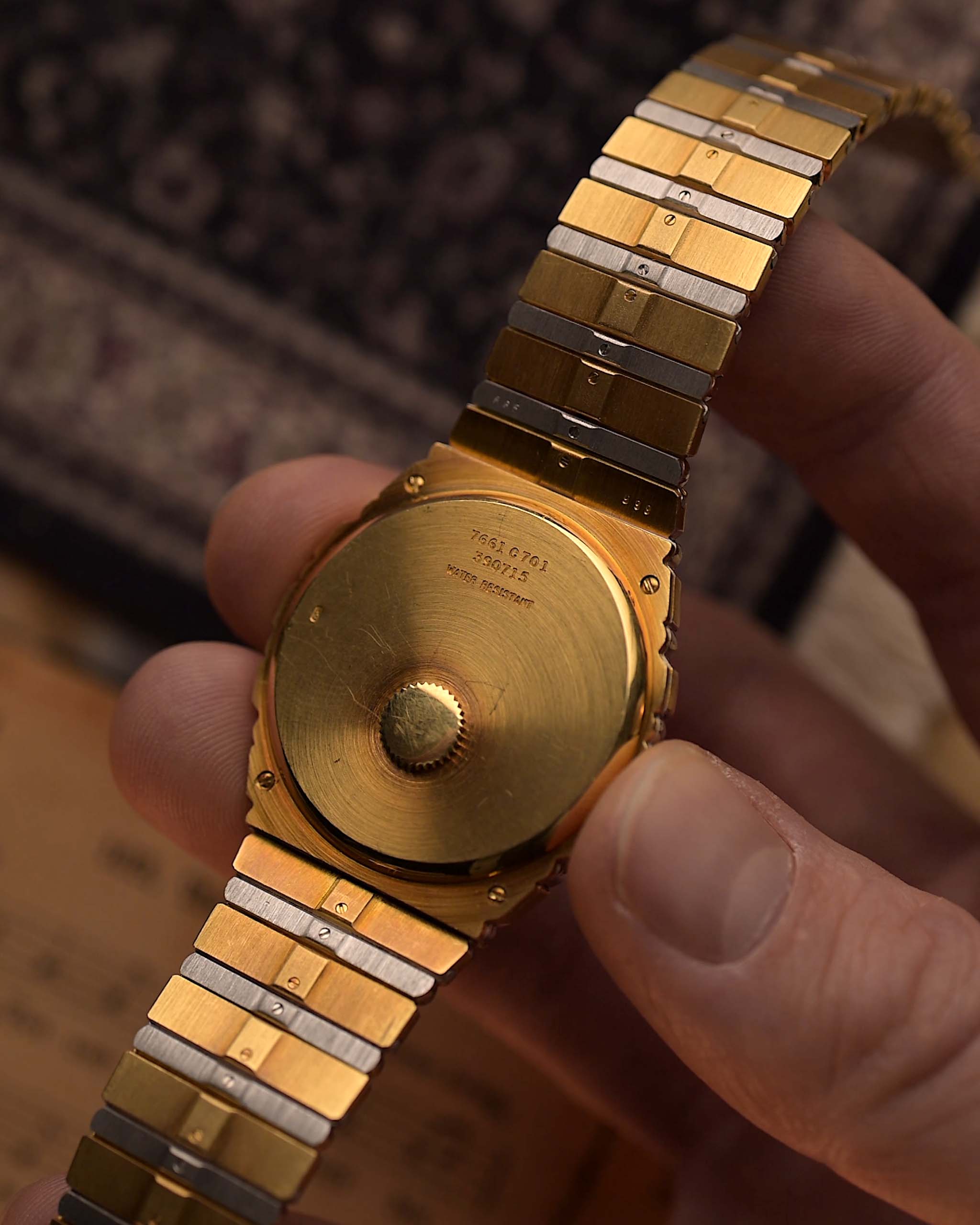 • Cassa in oro giallo e bianco 18 carati con fondello avvitato