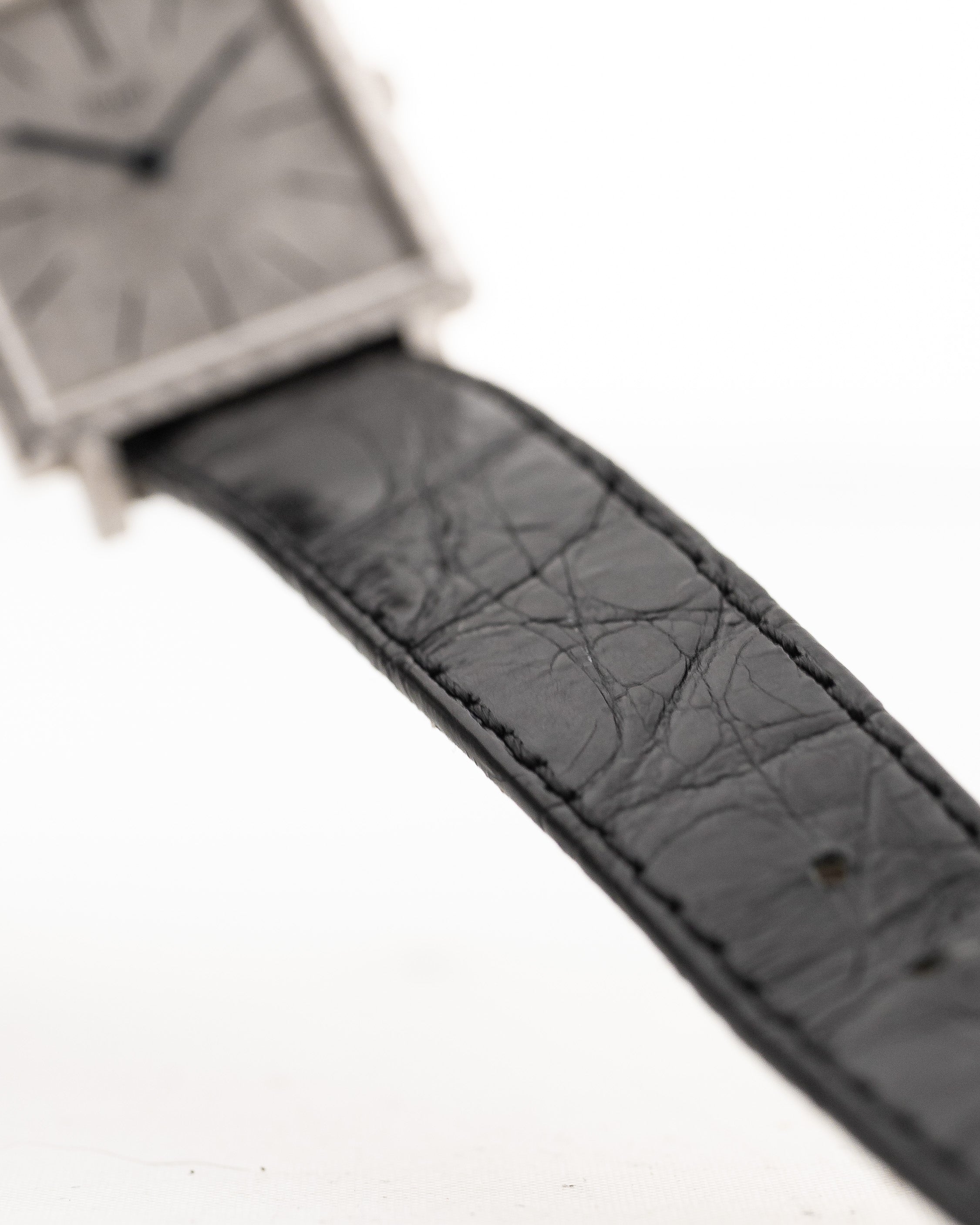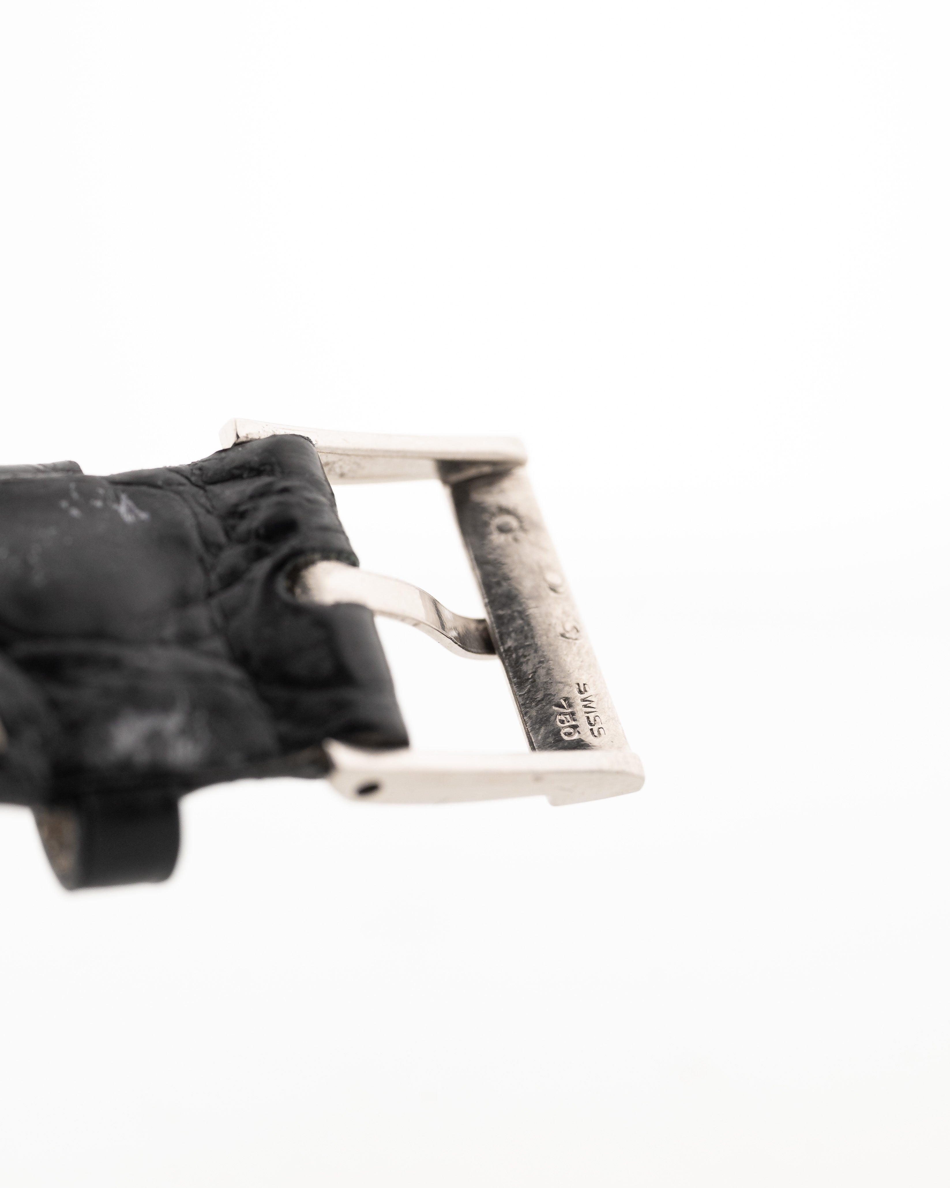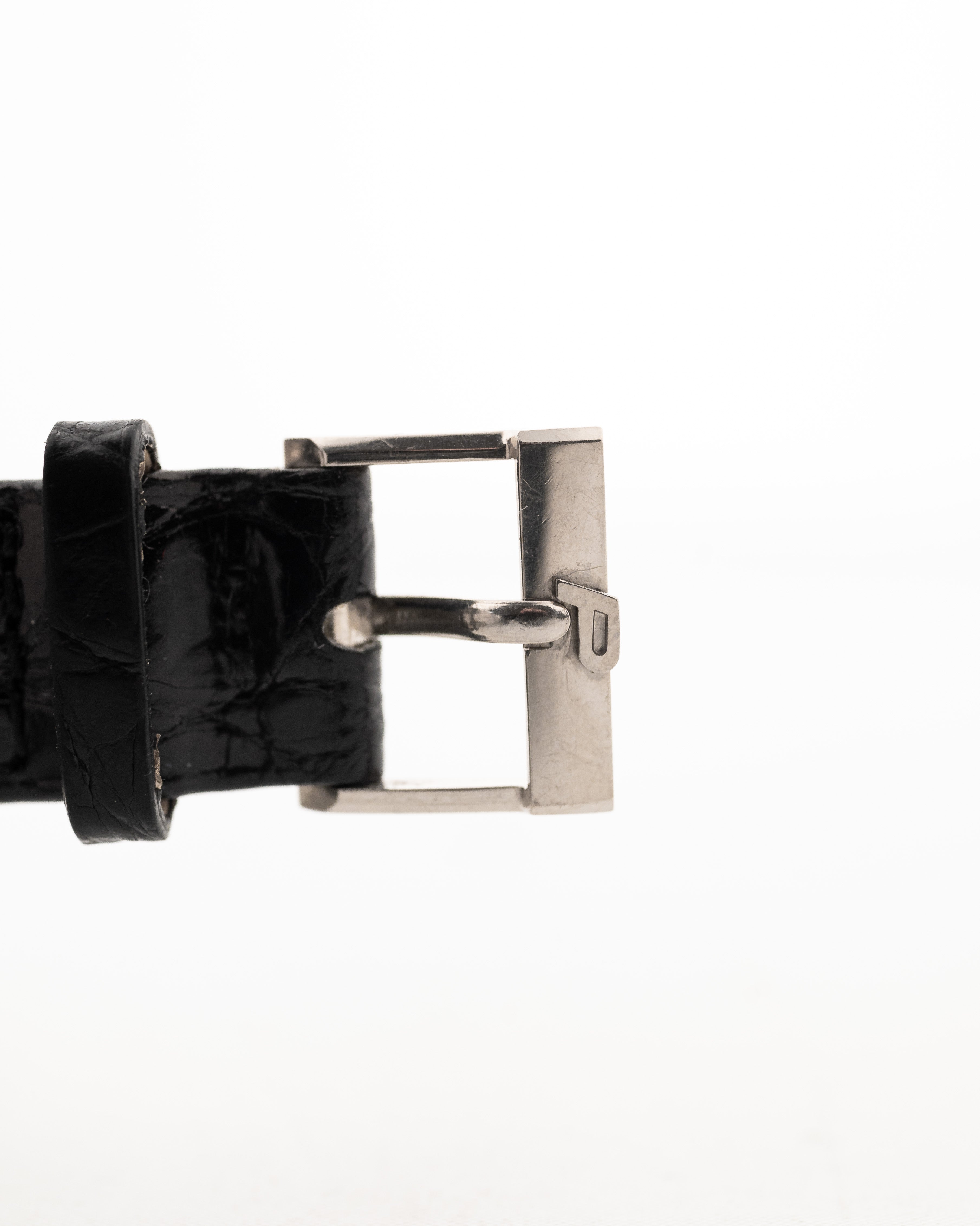 Questo impeccabile Piaget è dotato di quadrante in lino color argento, cassa in oro bianco 18 carati, cinturino in pelle Croco nera e fibbia Piaget in oro bianco 18 carati.