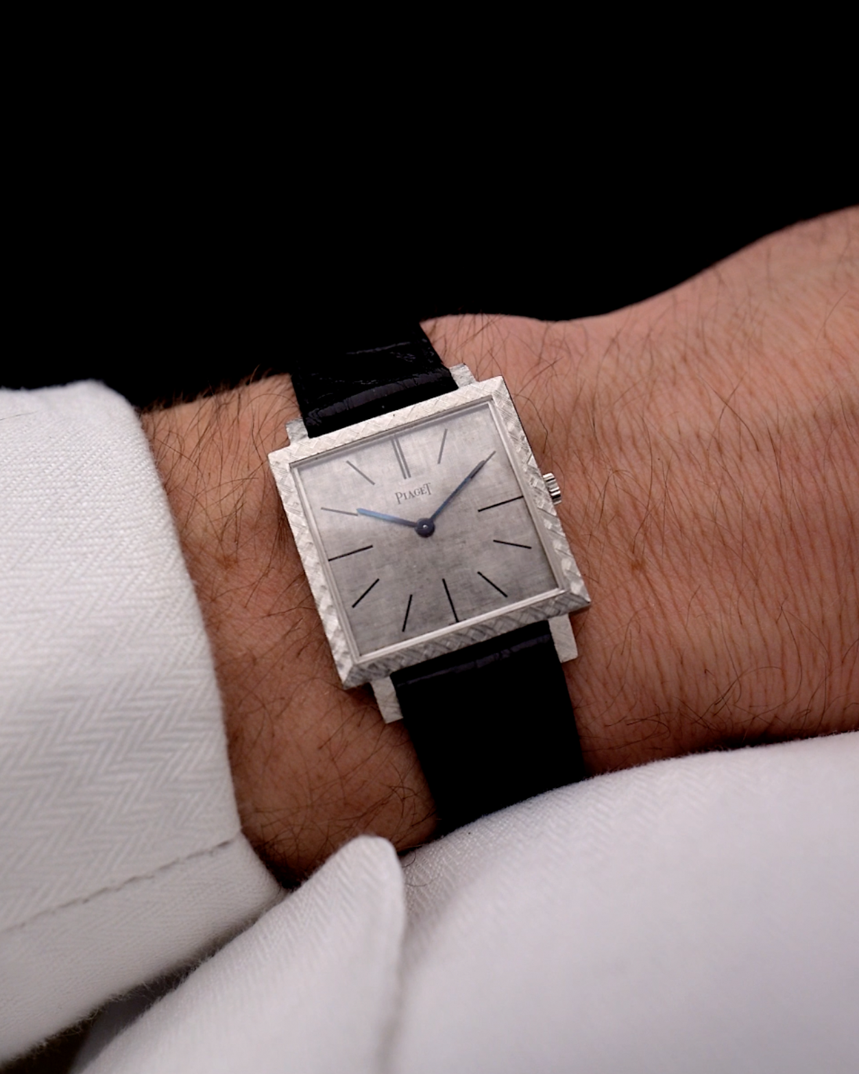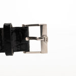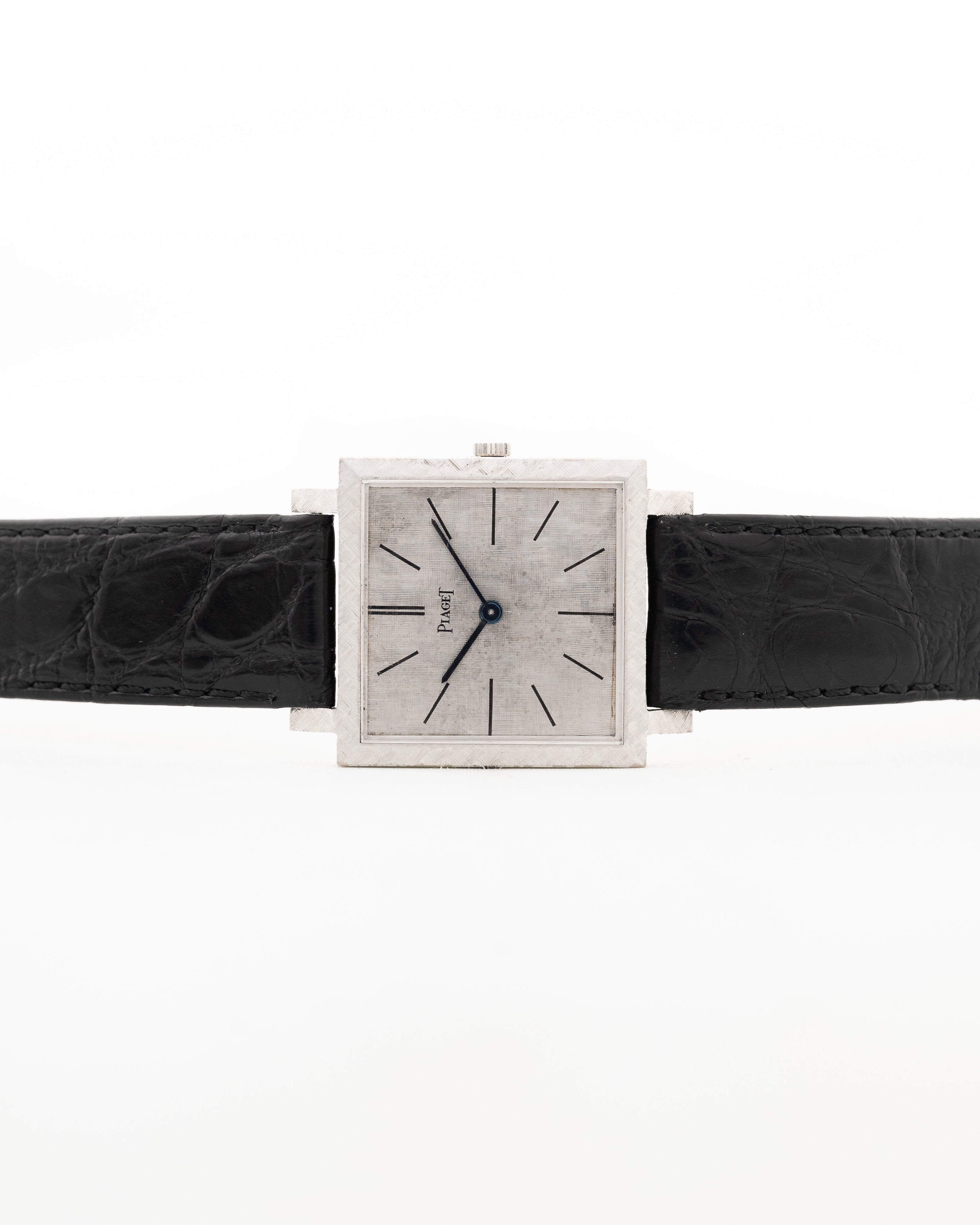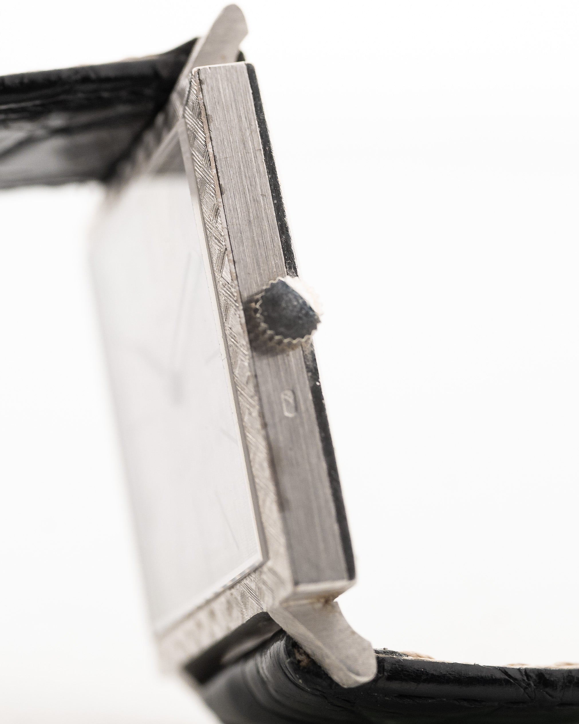 Questo impeccabile Piaget è dotato di quadrante in lino color argento, cassa in oro bianco 18 carati, cinturino in pelle Croco nera e fibbia Piaget in oro bianco 18 carati.