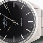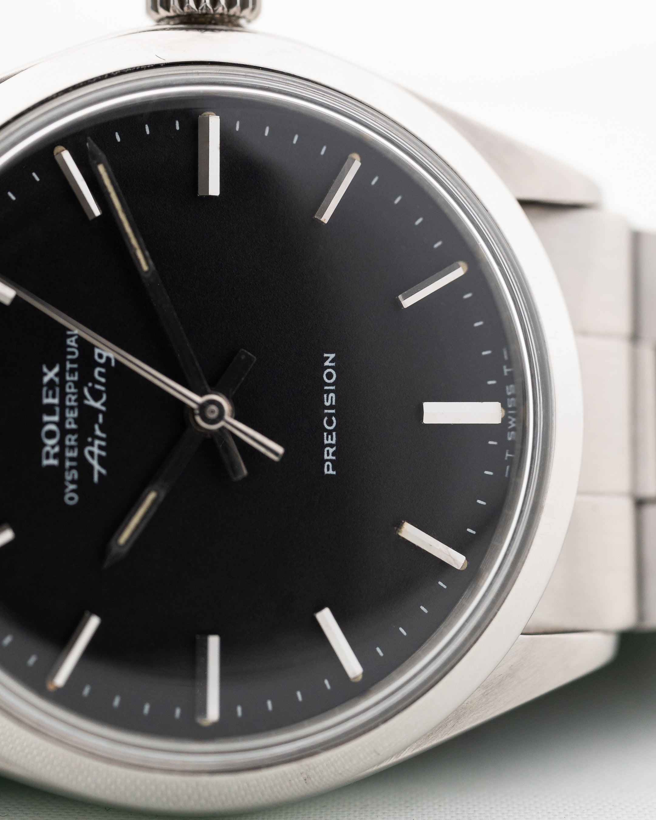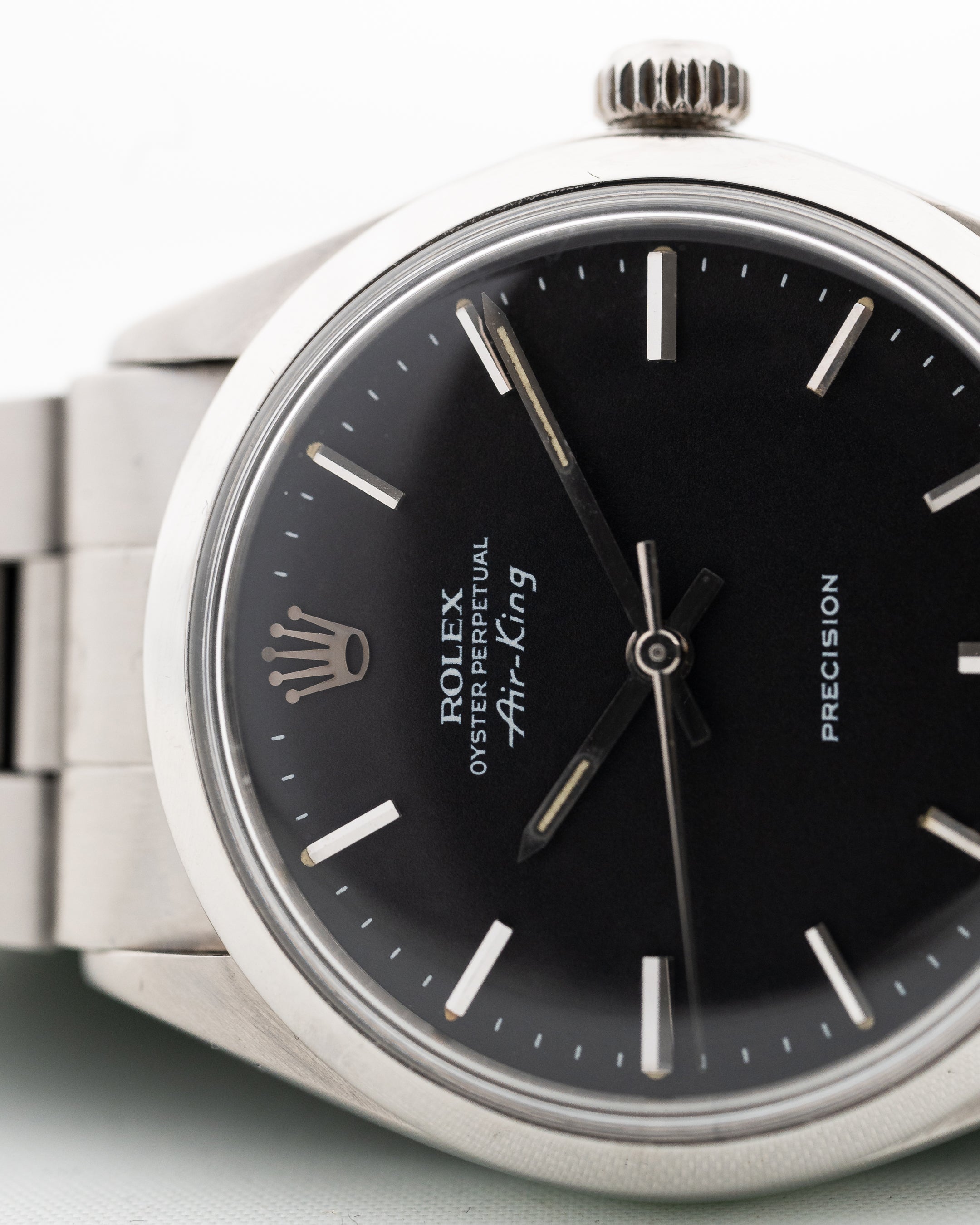 L'Air-King è uno degli ultimi modelli di Rolex che non ha fatto parlare di sé e presenta tutto lo stile classico che si può chiedere alla famiglia Oyster Perpetual. Questa referenza ha fatto della semplicità il suo punto di forza: in questo caso, il quadrante nero opaco e pulito è accentuato da indici applicati per una chiara leggibilità, mentre l'ampia corona di lancette aggiunge un aspetto complessivamente elegante.