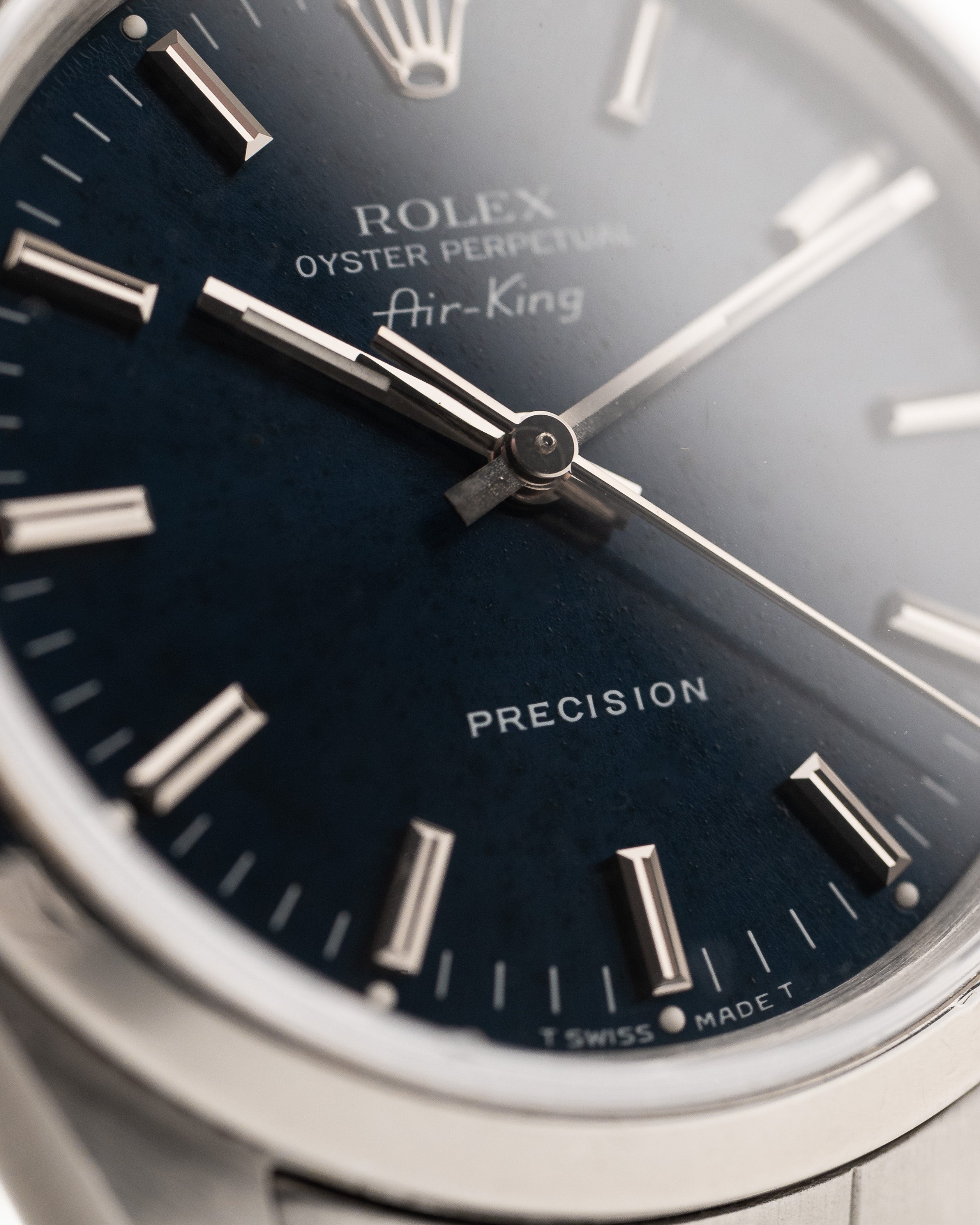 L'Air-King è uno degli ultimi modelli di Rolex che non ha fatto parlare di sé e ha tutto lo stile classico che si può chiedere alla famiglia Oyster Perpetual. Questa referenza ha fatto della semplicità il suo punto di forza: in questo caso, il quadrante è accentuato da indici applicati per una chiara leggibilità e il bracciale a listelli larghi aggiunge un aspetto complessivamente elegante.