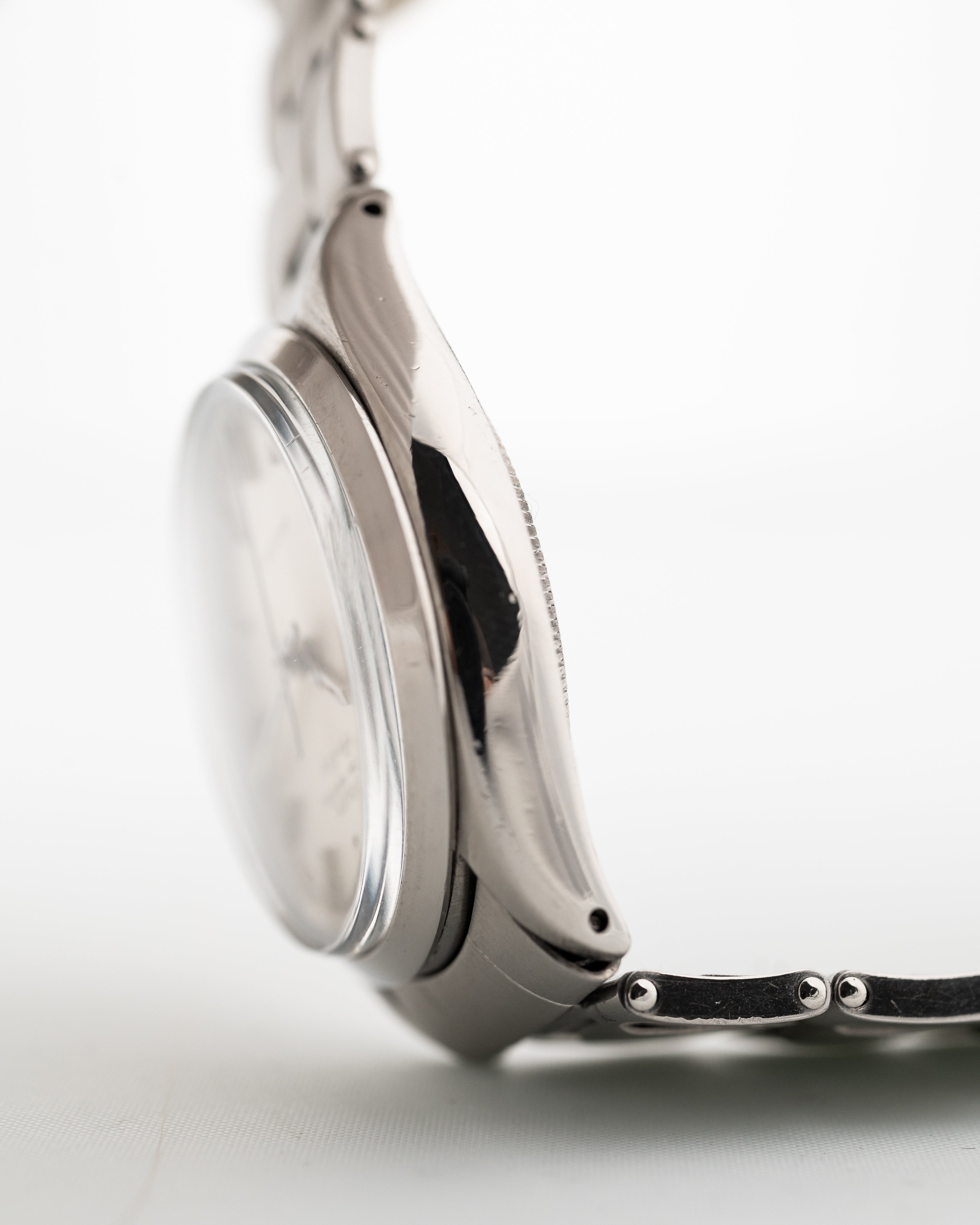L'Air-King è uno degli ultimi modelli di Rolex che non ha fatto parlare di sé e ha tutto lo stile classico che si può chiedere alla famiglia Oyster Perpetual. Questa referenza ha fatto della semplicità il suo punto di forza: in questo caso, il quadrante argentato e pulito è accentuato da indici applicati per una chiara leggibilità, mentre l'ampia corona di lancette aggiunge un aspetto complessivamente elegante.