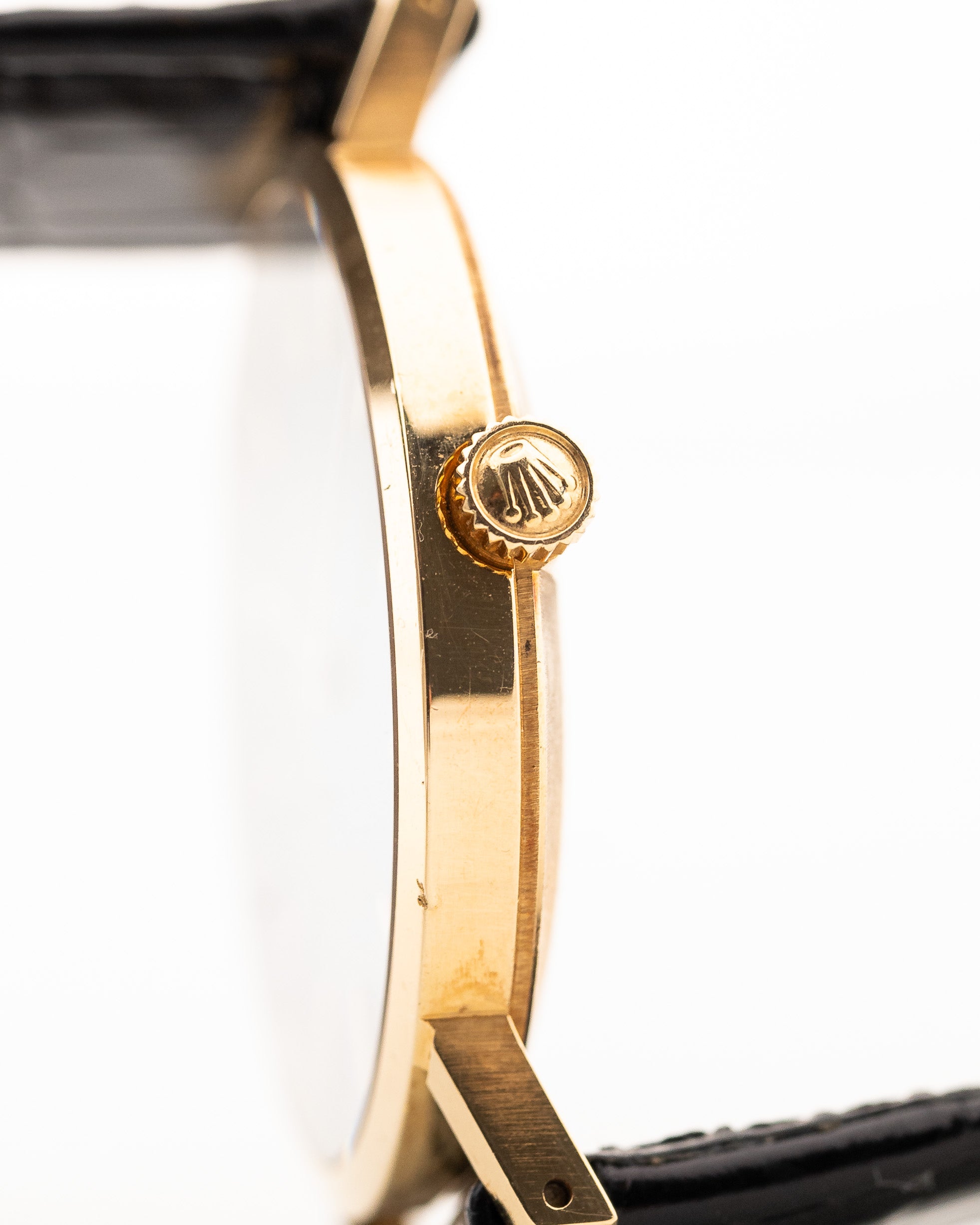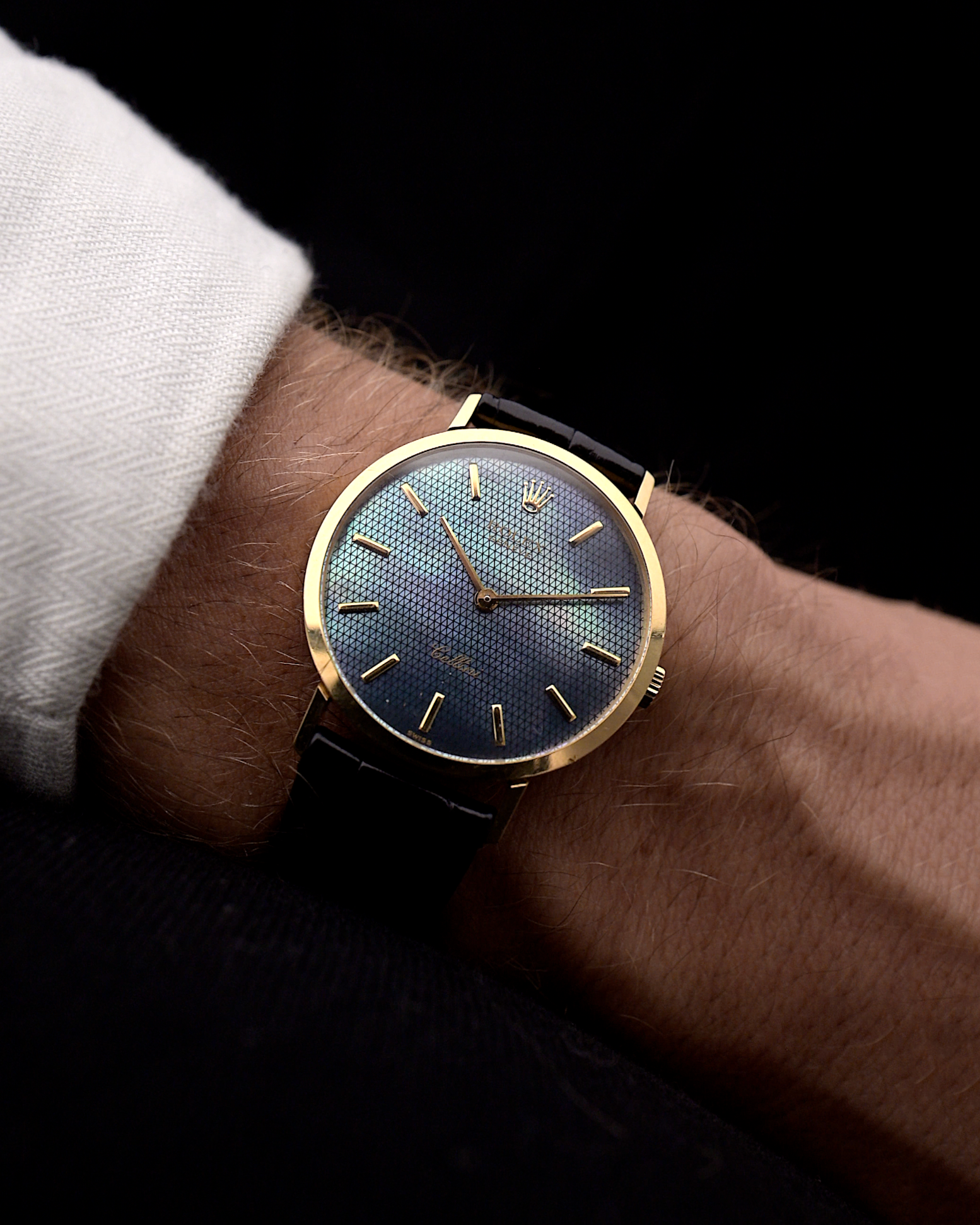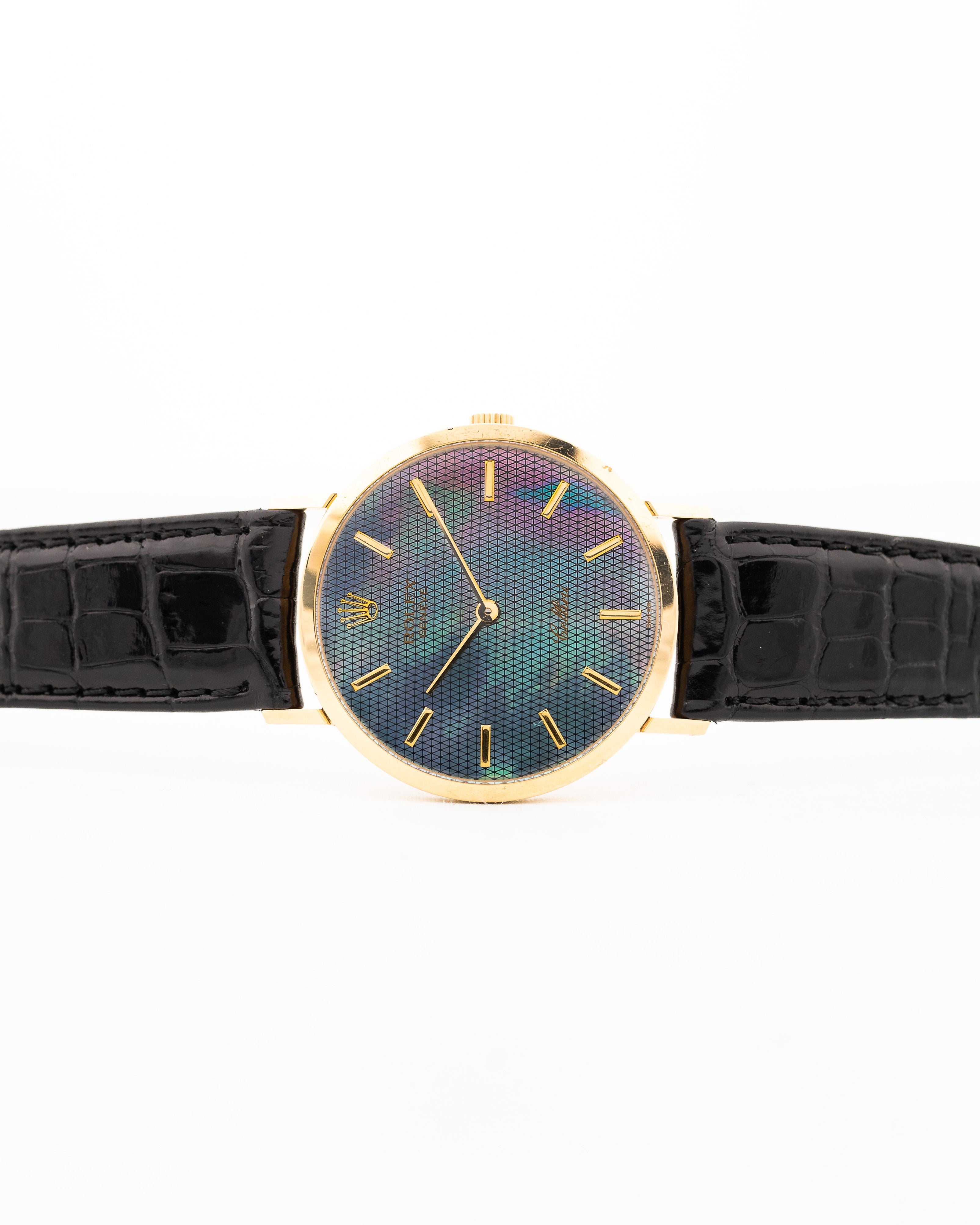 La linea Rolex Cellini mette in mostra il lato più elegante di Rolex rispetto ai suoi più noti modelli sportivi. La nostra versione Ref. 4112 è dotata di una cassa in oro giallo 18k e di un quadrante in madreperla tahitiana unico e molto raro, con un design pulito del quadrante calatrava.