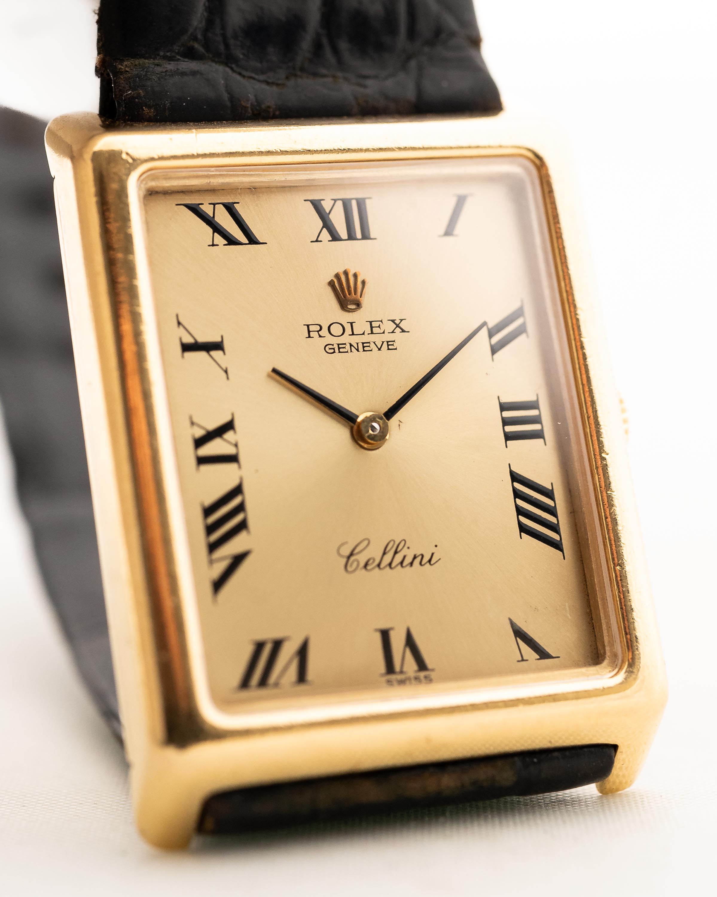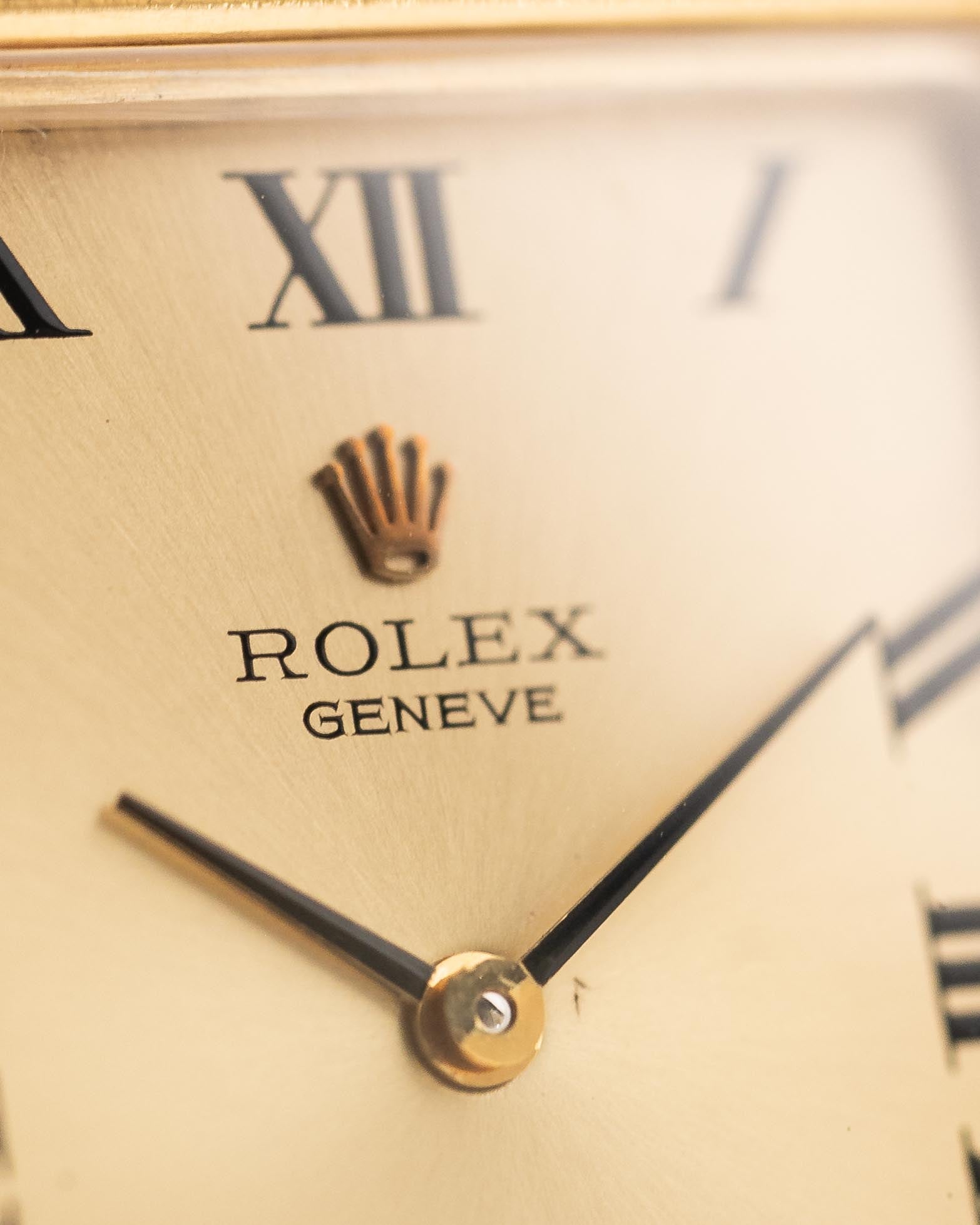 La linea Rolex Cellini mette in mostra il lato più elegante di Rolex rispetto ai suoi più noti modelli sportivi. Questa versione è dotata di una cassa quadrata in oro giallo 18k, una forma insolita per Rolex.