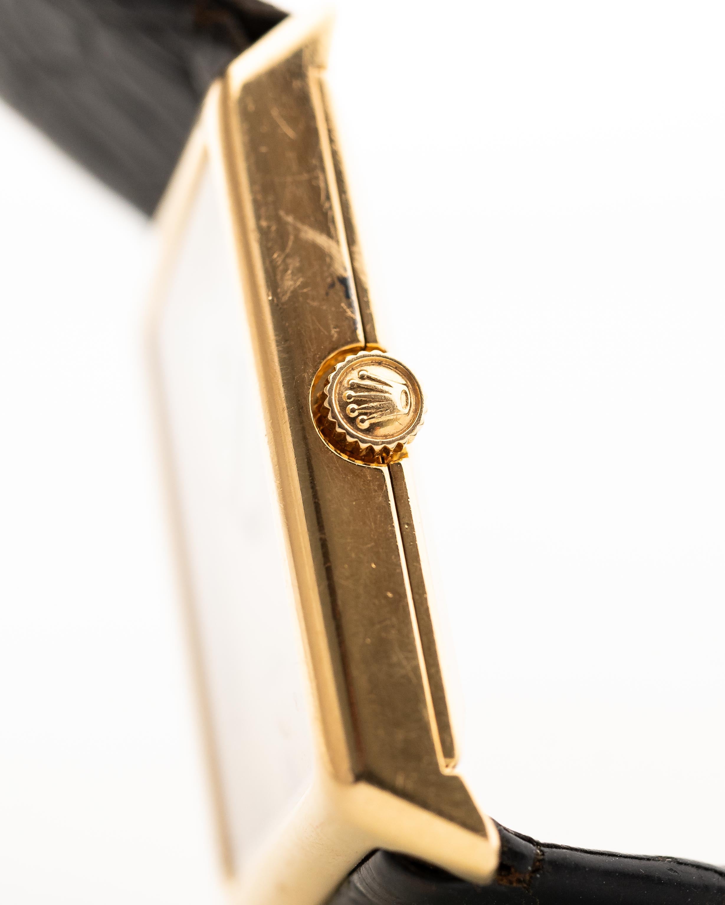 Questo modello è piuttosto versatile, in quanto può essere comodamente indossato in contesti casual o in abito da sera. La forma rettangolare con quadrante color oro e numeri romani lo rende di gran classe. La ciliegina sulla torta è che viene fornito con il cinturino originale Rolex e la fibbia originale Rolex placcata oro.