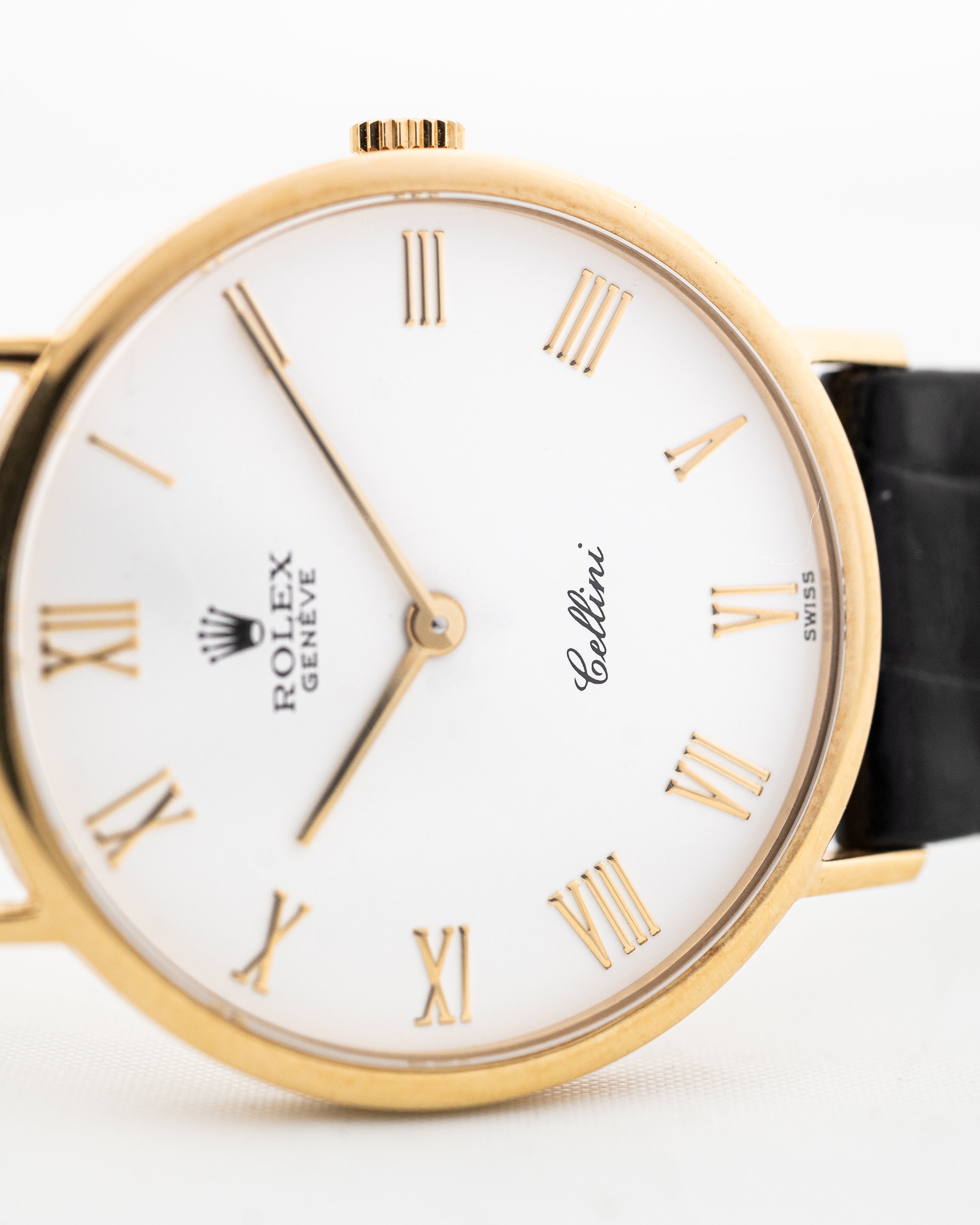 La linea Rolex Cellini mette in mostra il lato più elegante di Rolex rispetto ai suoi più noti modelli sportivi. La nostra versione Ref. 5112 è dotata di una cassa in oro giallo 18k e di un bellissimo e rarissimo quadrante bianco senza difetti con numeri romani dorati.
