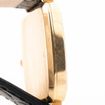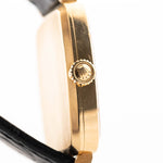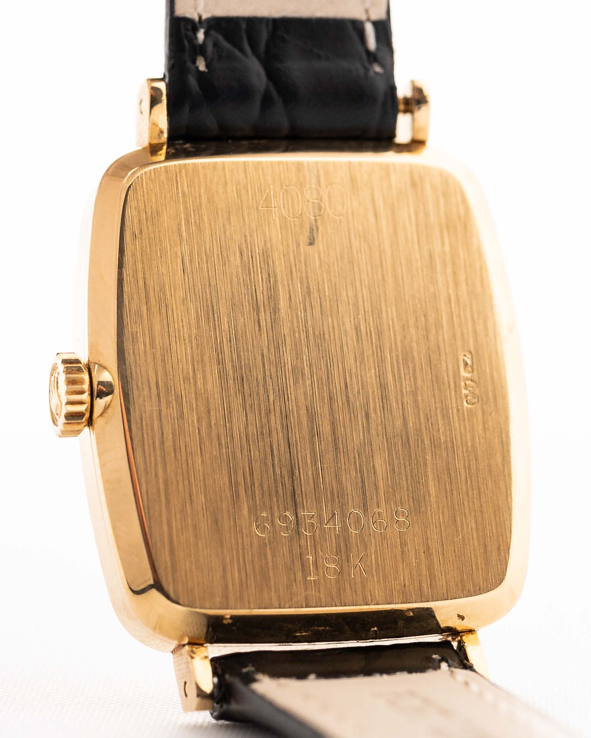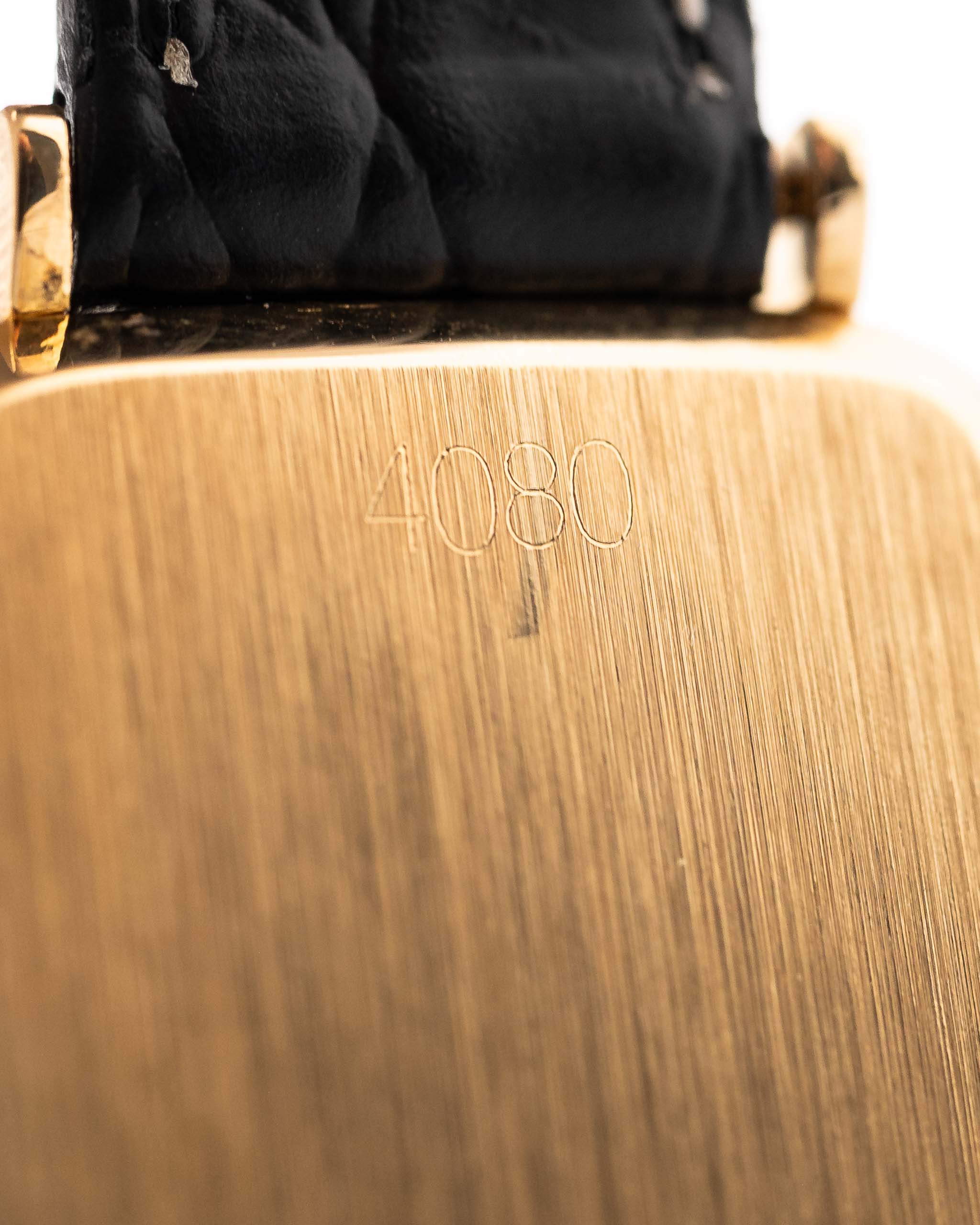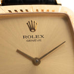 Rolex Cellini 4080 Rettangolare d'epoca del 1981. 23 mm con cassa in oro giallo 18 carati, movimento a carica manuale, quadrante dorato e cinturino in pelle.