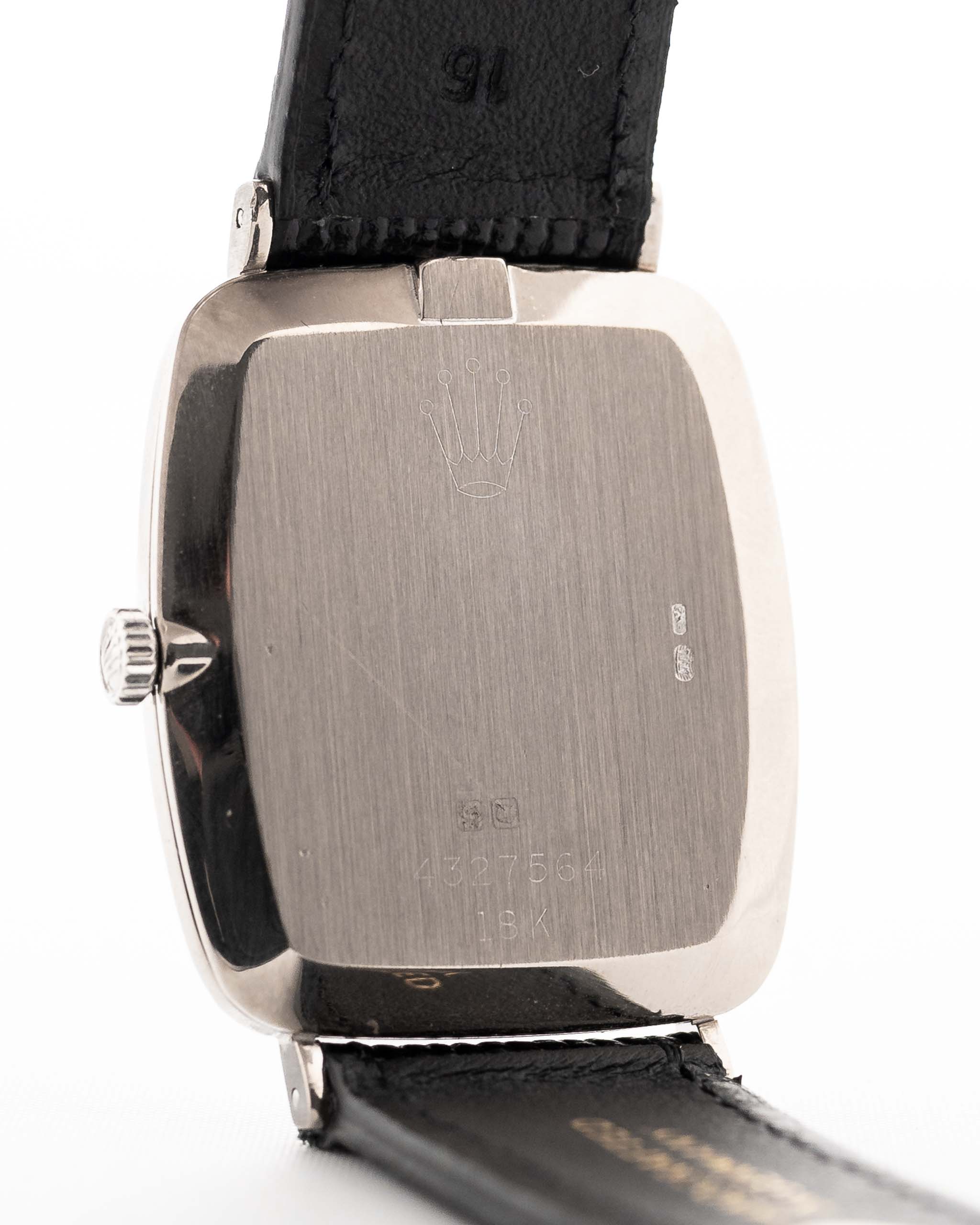 La linea Rolex Cellini riflette la sobria eleganza del marchio - un mondo a parte rispetto ai suoi iconici modelli sportivi. Questa Ref. 4087, realizzata in oro bianco massiccio 18 carati, presenta una rara cassa rettangolare che la distingue dalla maggior parte dei modelli Rolex dell'epoca.