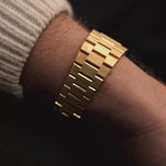 Abbinato al bracciale President originale in oro giallo 18 carati, l'orologio raggiunge una presenza senza soluzione di continuità, simile a un gioiello, al polso. Il quadrante dorato spazzolato orizzontalmente è senza tempo e meravigliosamente minimale, e ricorda le tonalità calde preferite negli orologi d'alta gamma dei primi anni '80, tra cui il famoso Patek Ellipse dell'epoca.