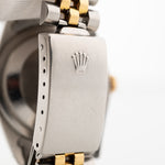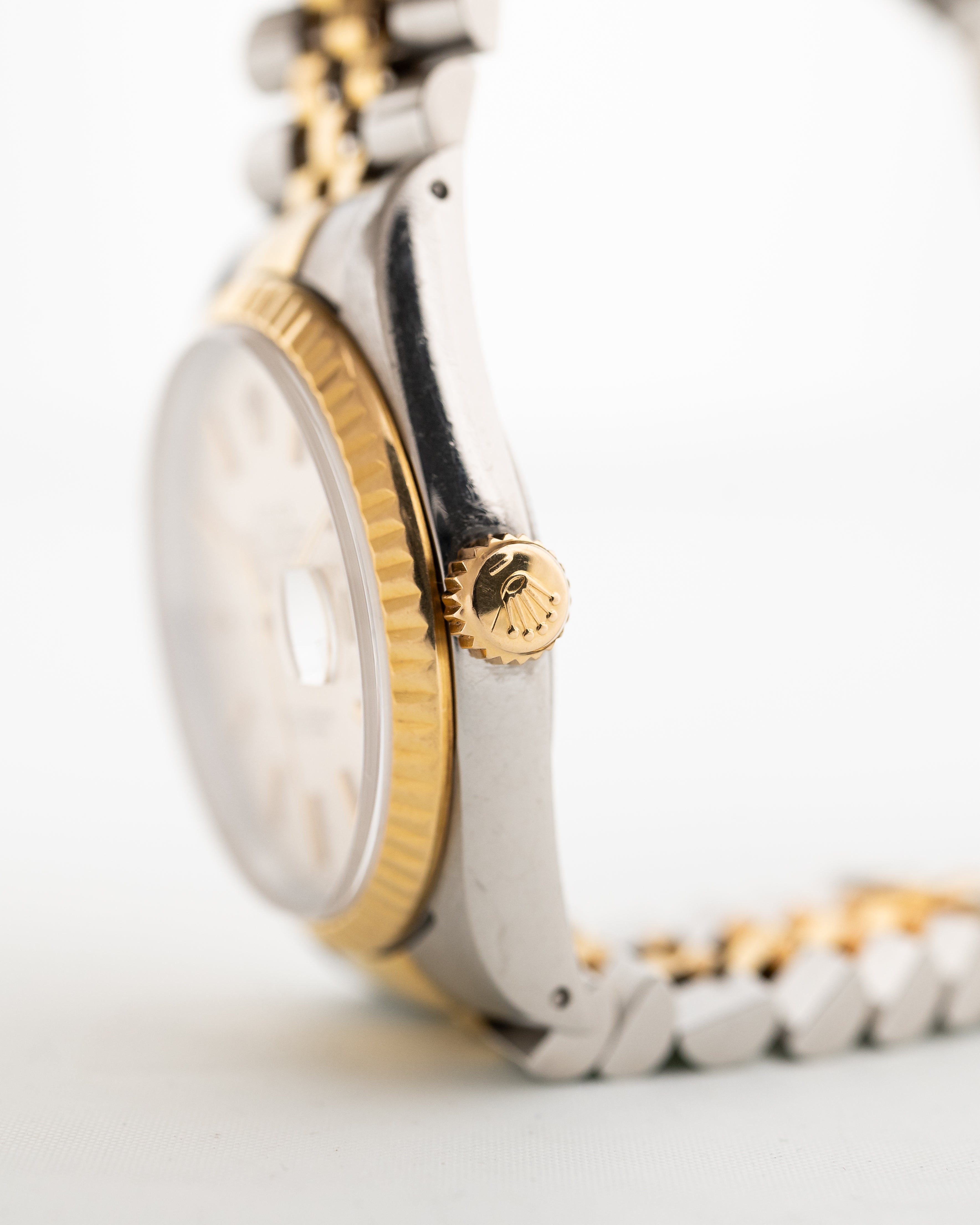 Questo particolare pezzo del 1991 si distingue per la lunetta e la corona scanalate in oro giallo, una cassa robusta con bordi affilati e un quadrante argentato pulito in condizioni impeccabili.
