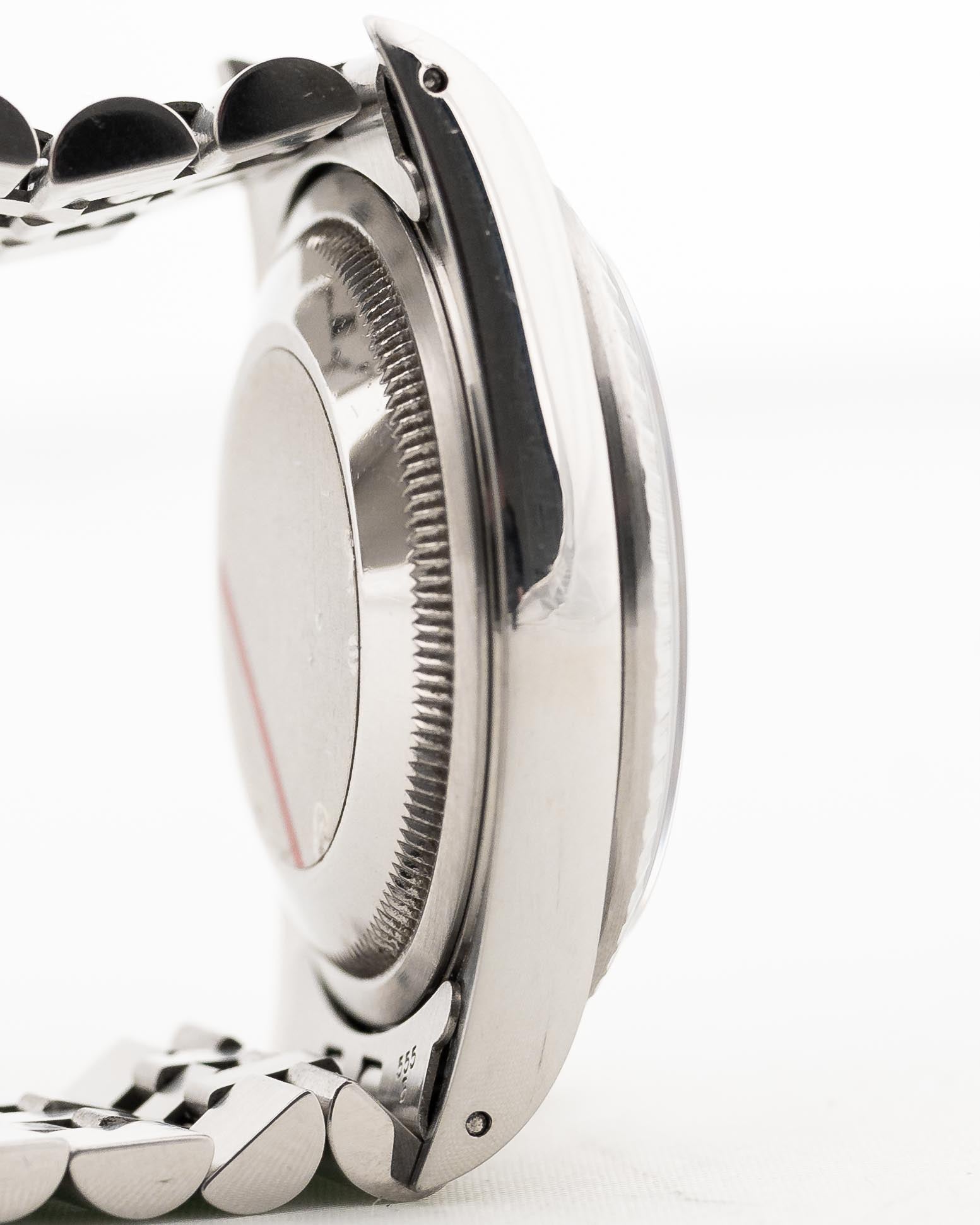 Questo particolare esemplare del 1990 si distingue per il quadrante blu oceano profondo con effetto sunburst in condizioni eccezionali, con lume uniformemente invecchiato e una cassa molto robusta con lunetta tornita.