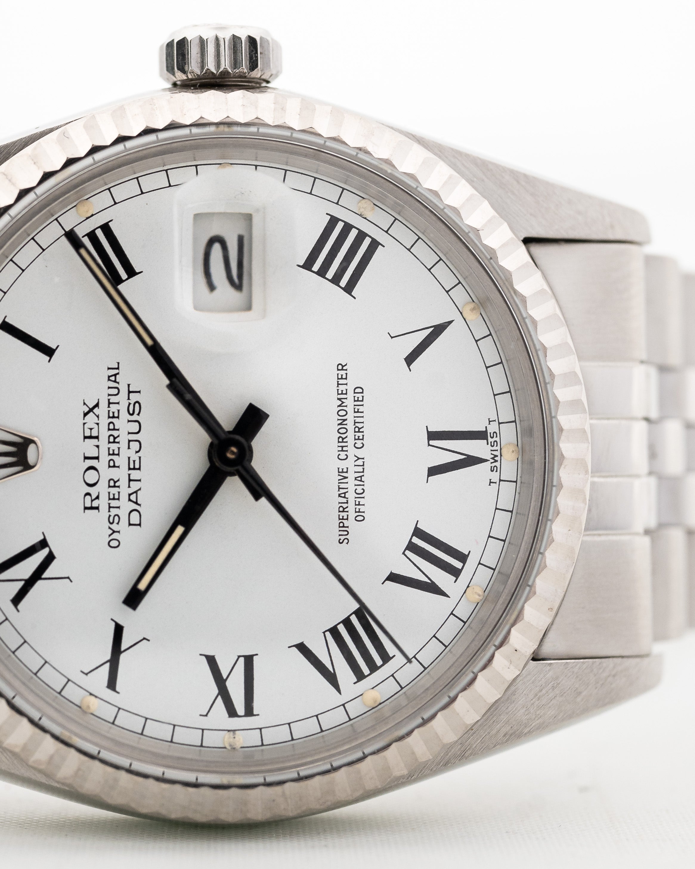 Questo particolare pezzo del 1984 si distingue per la lunetta scanalata in oro bianco, un rarissimo e impeccabile quadrante Buckley bianco e una cassa molto robusta con bordi taglienti in condizioni eccezionali.