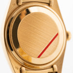 Nella sua essenza, la ref. 18038 è la quintessenza del Day-Date, con la classica configurazione del quadrante omonimo, la cassa in oro massiccio da 36 mm e la lunetta scanalata. Questa versione aggiornata, tuttavia, presenta una nuova costruzione impermeabile, ora progettata per essere resistente all'acqua fino a 100 metri, oltre a un vetro zaffiro per una migliore resistenza ai graffi. Per quanto riguarda il quadrante, questa referenza offriva un'ampia varietà di configurazioni, ma rispetto ai suoi predecessori, il bordo del quadrante non era più inclinato verso il basso in stile tortiera, bensì era piatto.