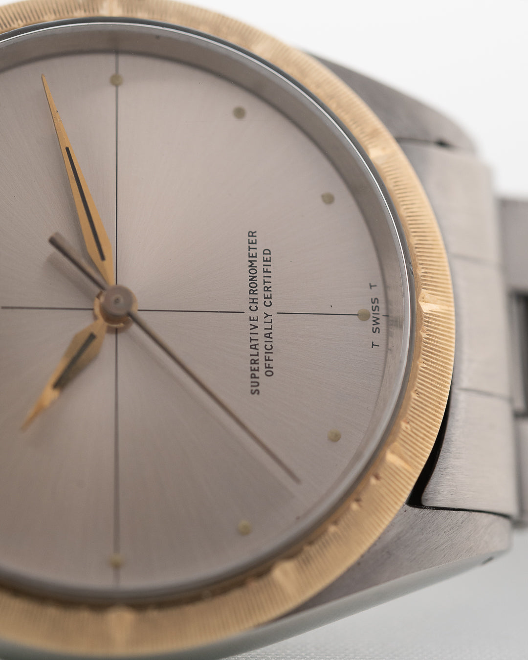 Il Rolex Zephyr è entrato in produzione negli anni '50 con la ref. 6582. Fu presto seguito dalla ref. 1008, che è l'esemplare che abbiamo qui. Lo Zephyr è caratterizzato dal quadrante a croce e dalla lunetta sfaccettata. Lo Zephyr ha un aspetto diverso da qualsiasi altro Rolex mai prodotto.