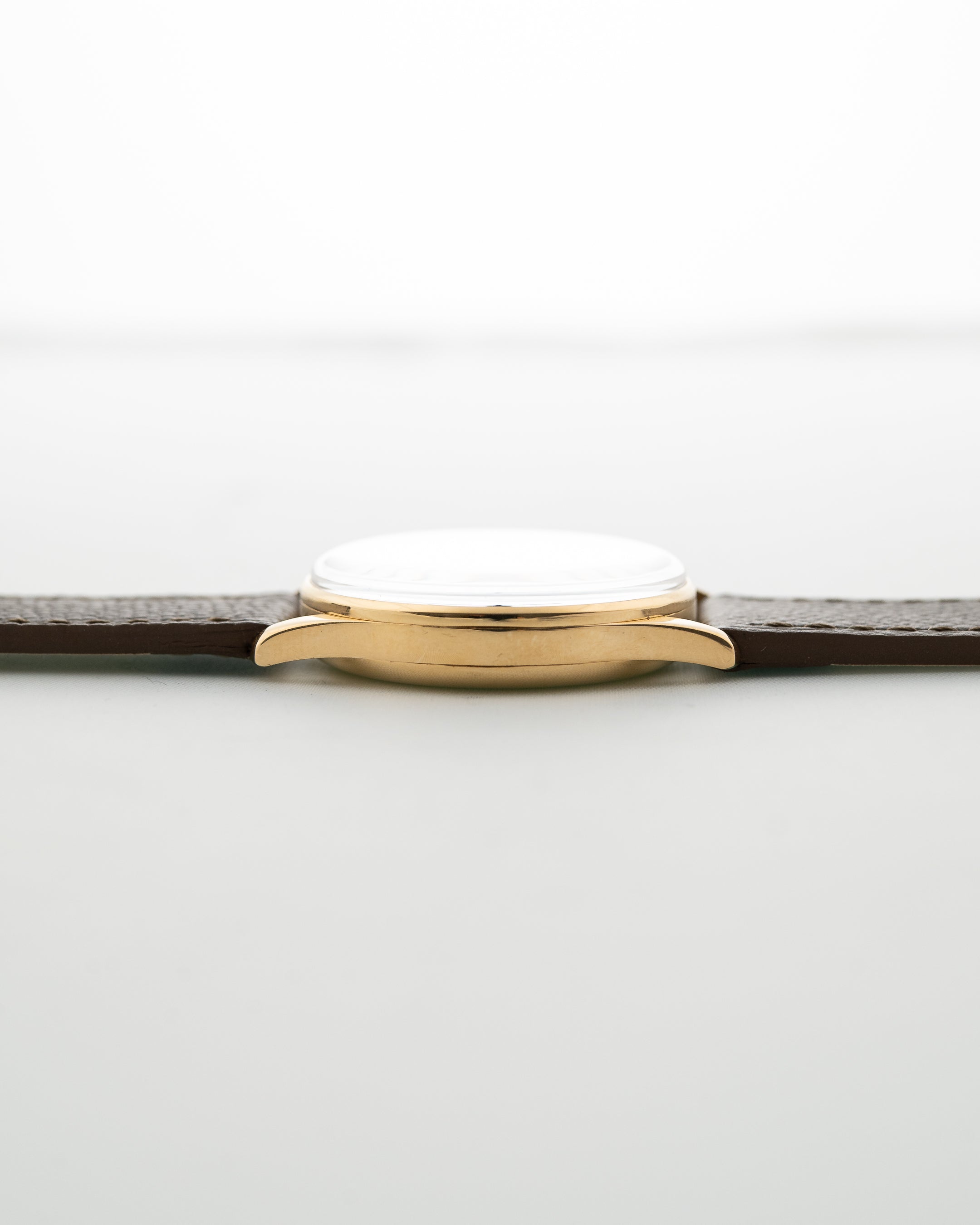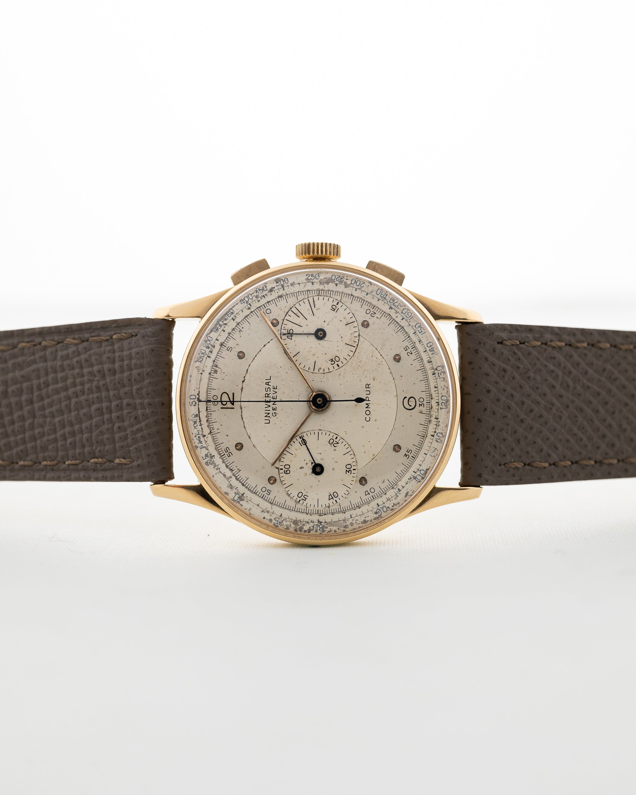 Questo Universal Geneve Compur è un fantastico esempio di ciò che la manifattura faceva così bene negli anni Quaranta. La cassa compatta in oro giallo 18 carati, con pulsanti quadrati, ospita l'apprezzato movimento calibro 285.