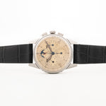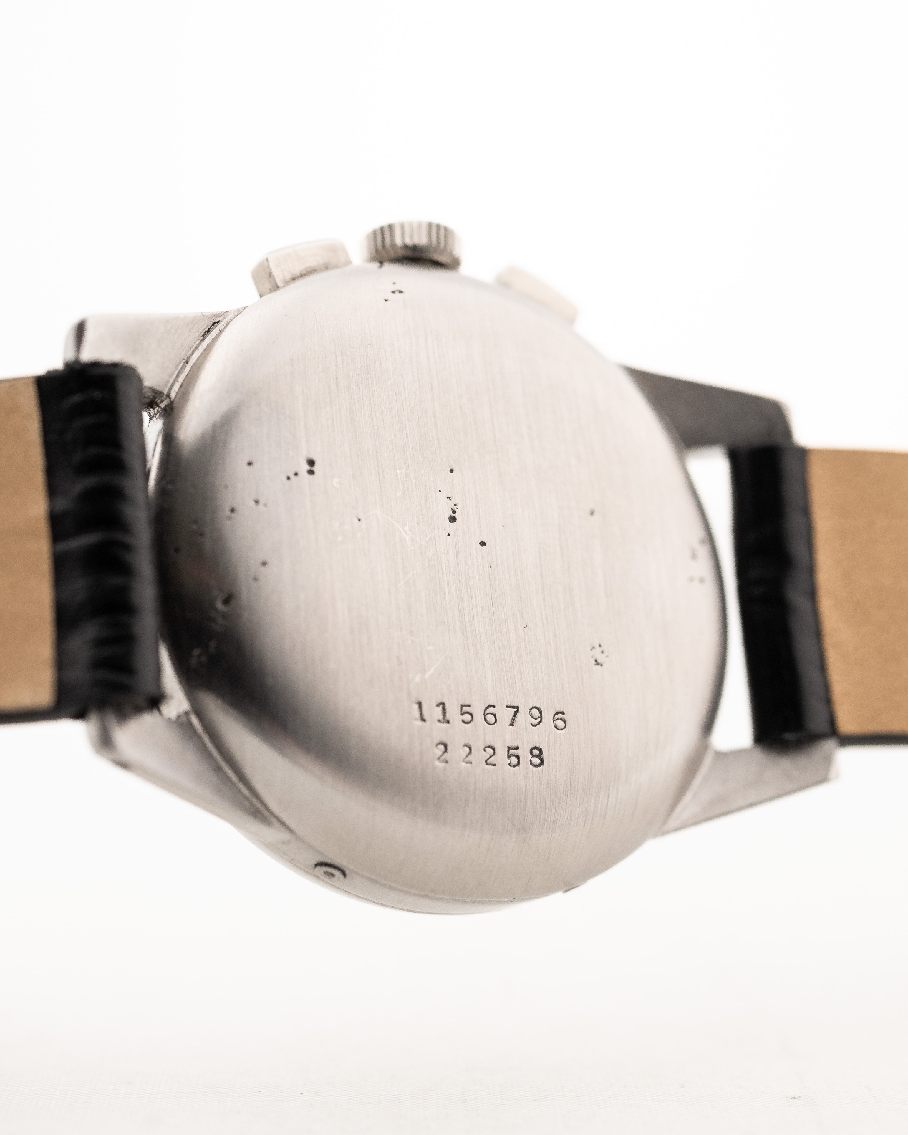 La nostra versione con la referenza 22258 degli anni Cinquanta non è solo un ottimo esempio di questo modello, ma è anche una grande dimostrazione del perché il Tri Compax sia così ricercato. Presenta una splendida cassa in acciaio inossidabile con anse angolate e una disposizione del quadrante da urlo.