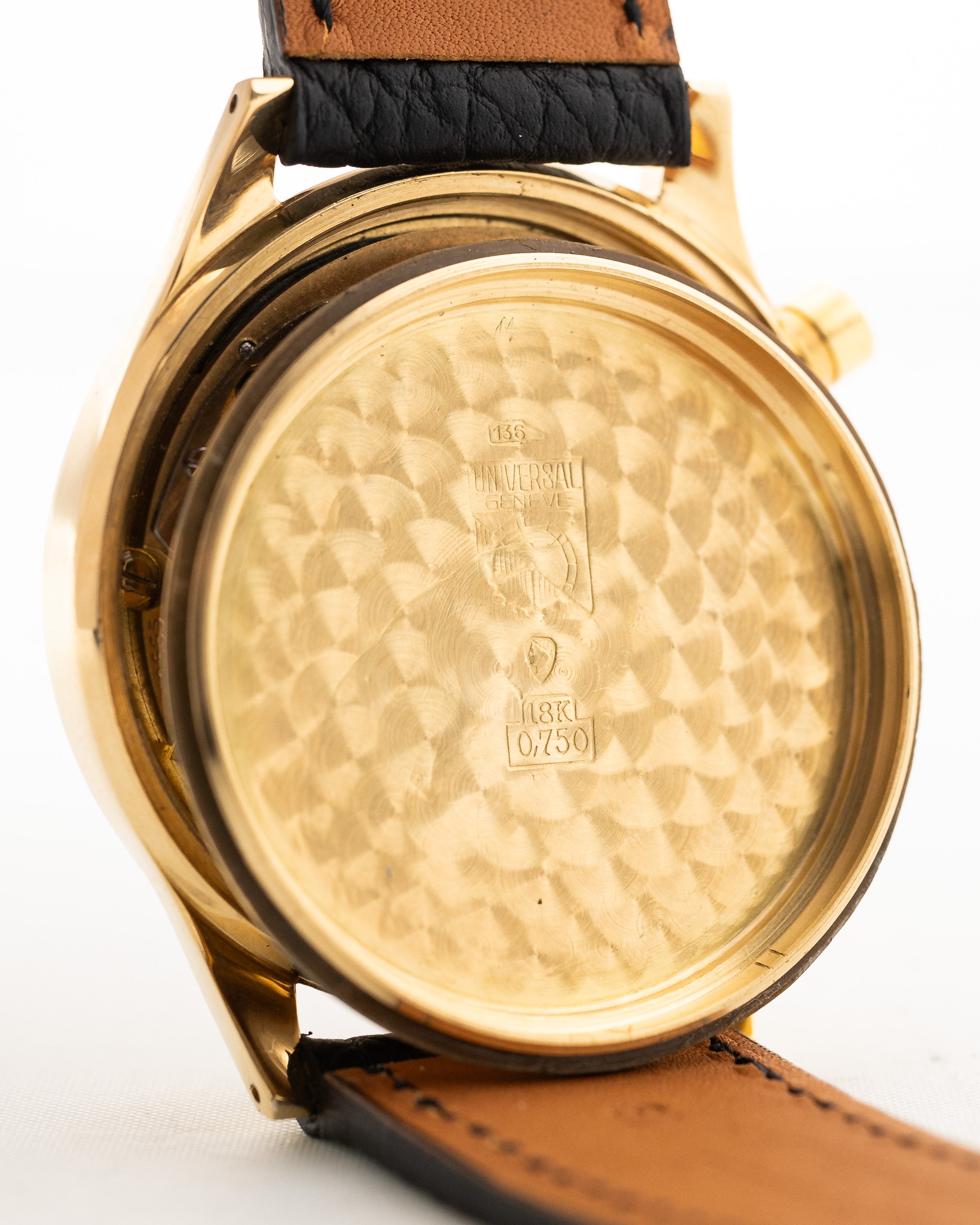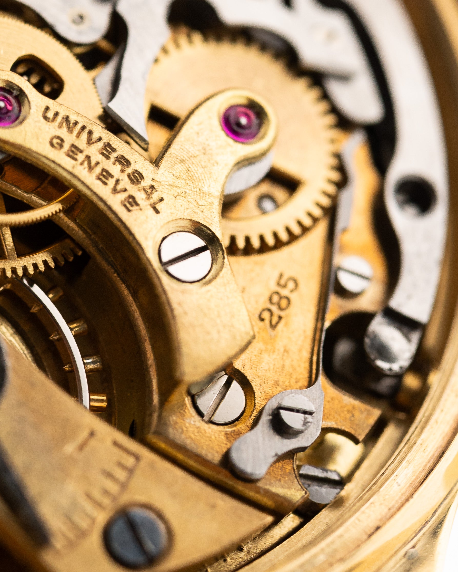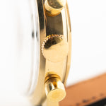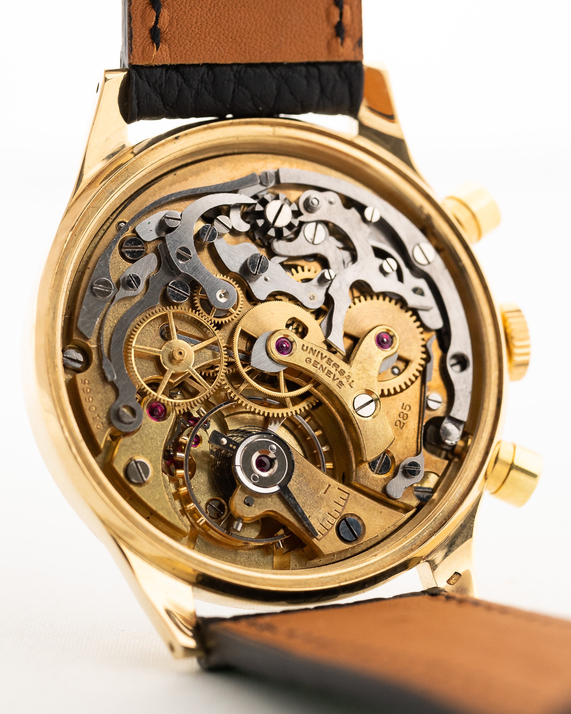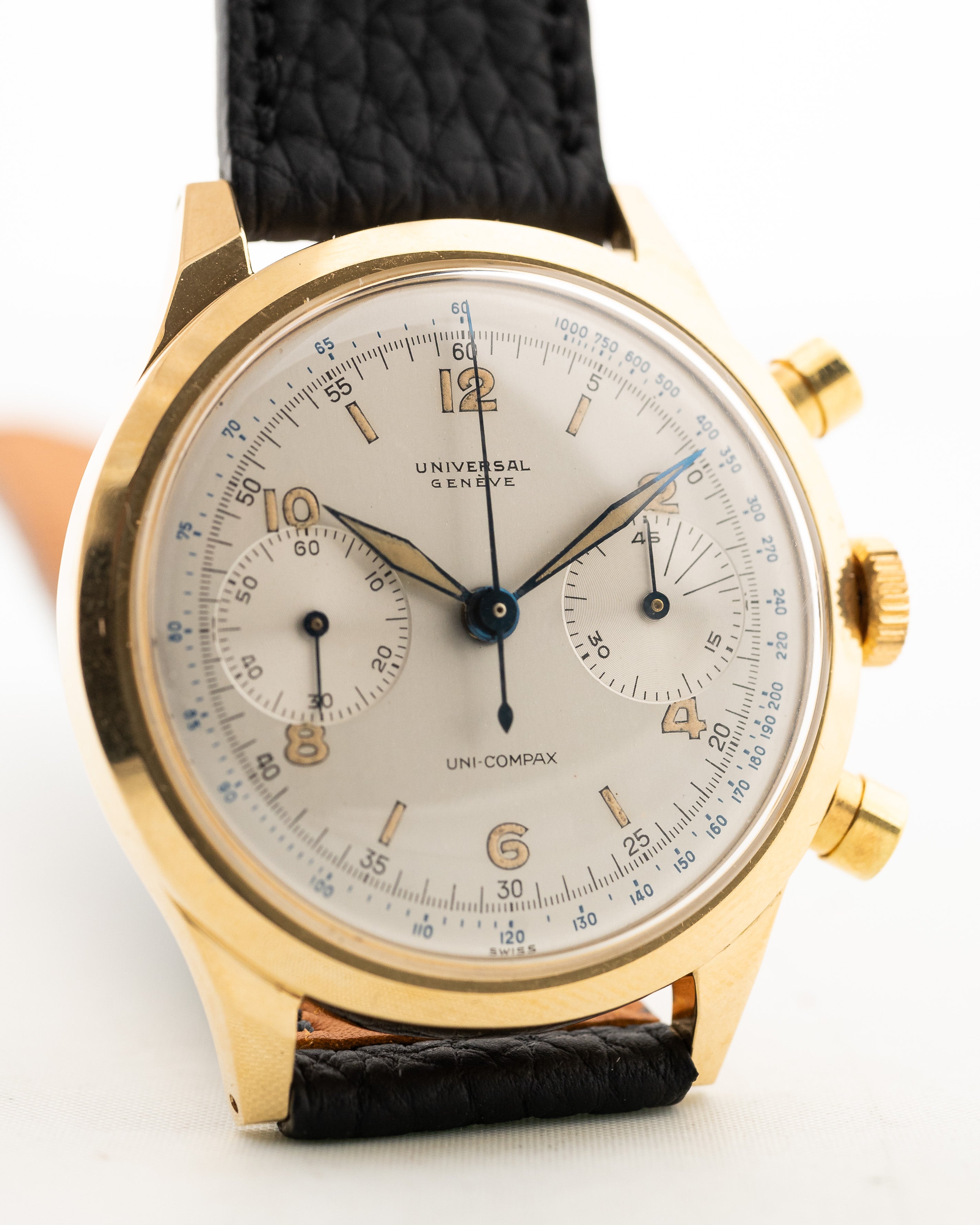 Questo Universal Geneve Uni-Compax è un fantastico esempio di ciò che la manifattura ha fatto così bene negli anni Quaranta. La cassa Jumbo in oro giallo 18 carati, con pulsanti rotondi, ospita l'ambito movimento calibro 285.