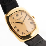 Qui abbiamo un orologio da abito Vacheron Constantin in oro giallo 18 carati, splendidamente rifinito, con un design a cuscino ovale, risalente agli anni Settanta.