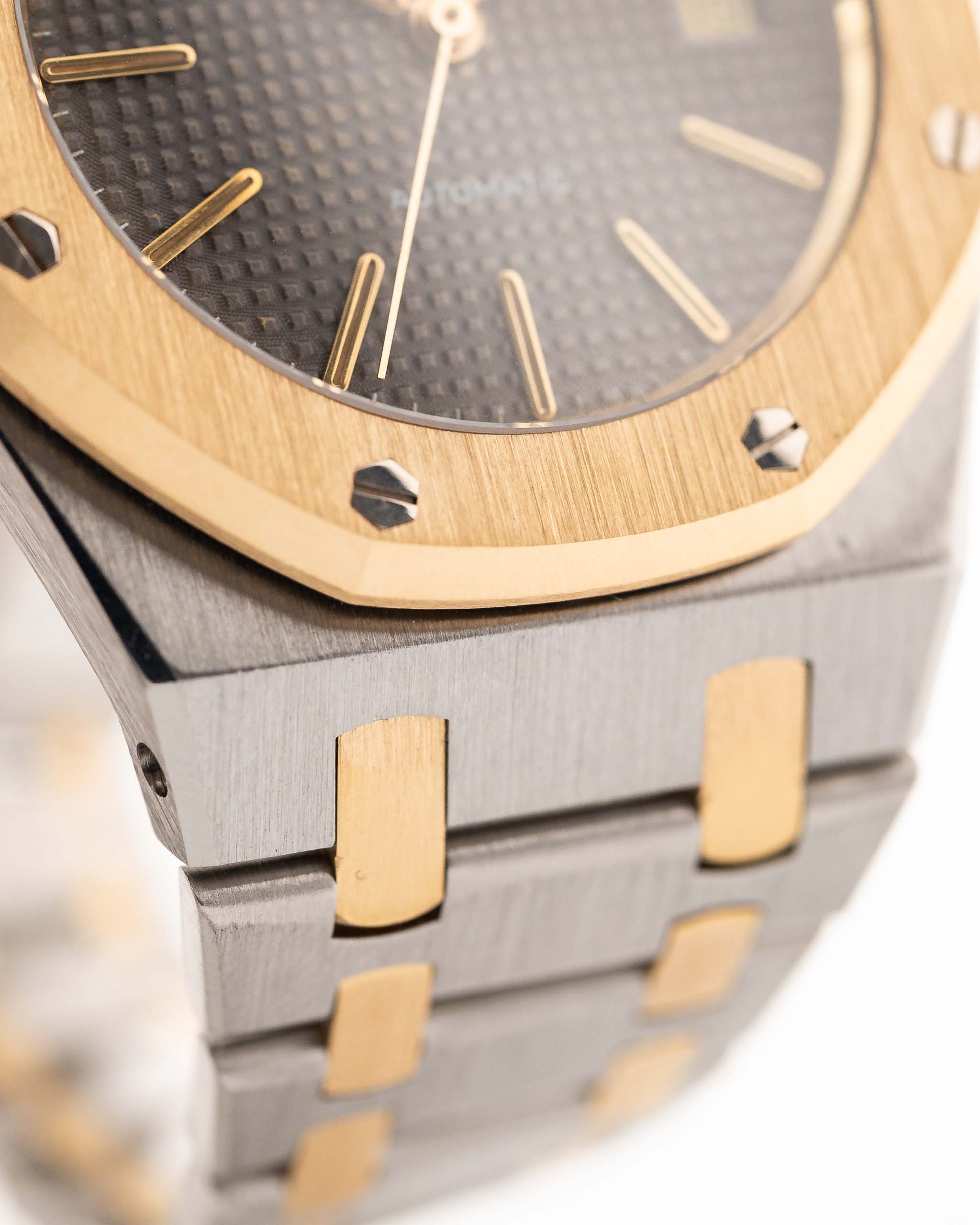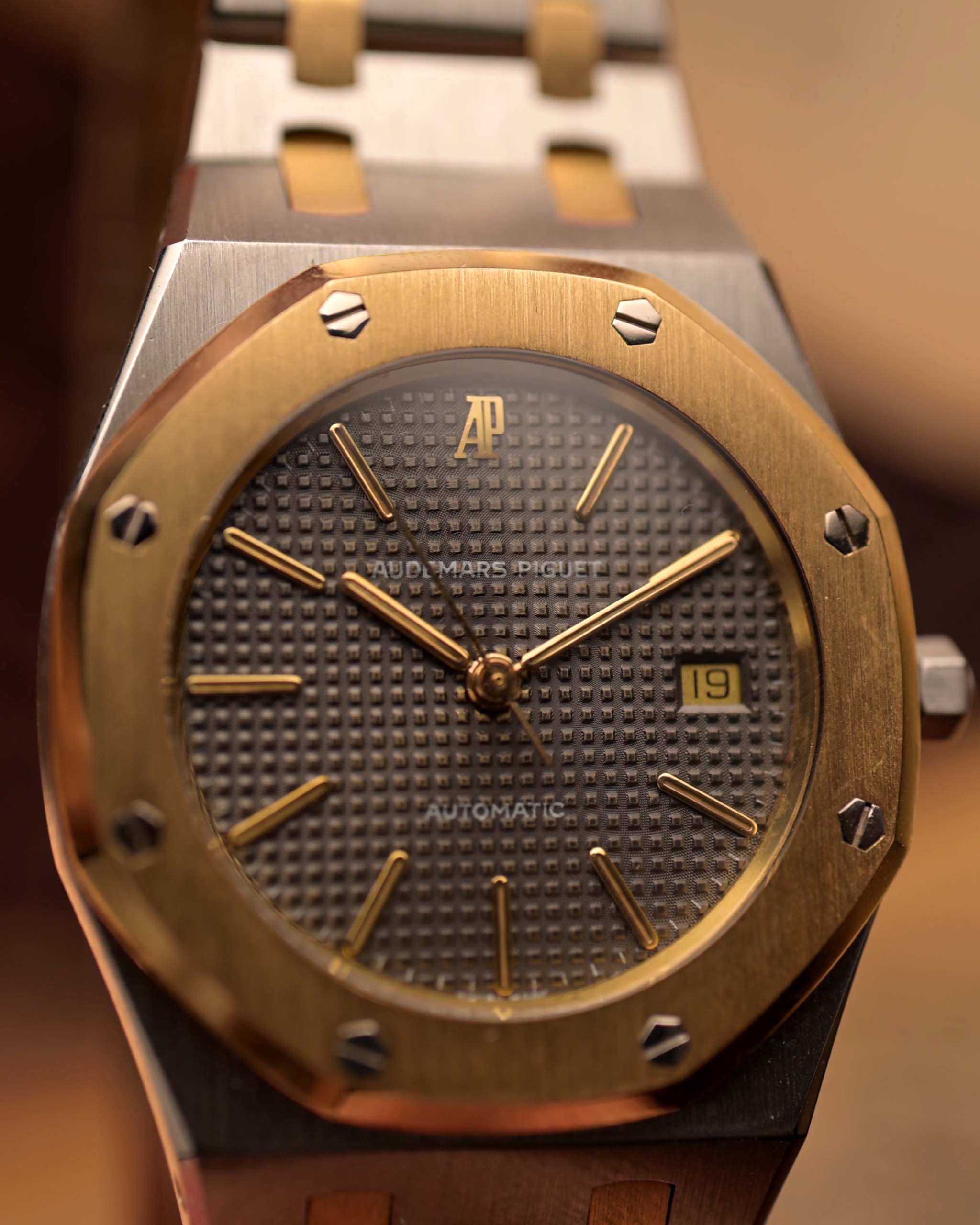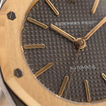 The grey dial with golden accents brings a moody sophistication, while the applied gold AP logo at 12 o’clock gives it that unmistakable pedigree. Slim, refined, and unmistakably Royal Oak — this rare 1980s execution is a wearable icon for collectors who value proportion and heritage.