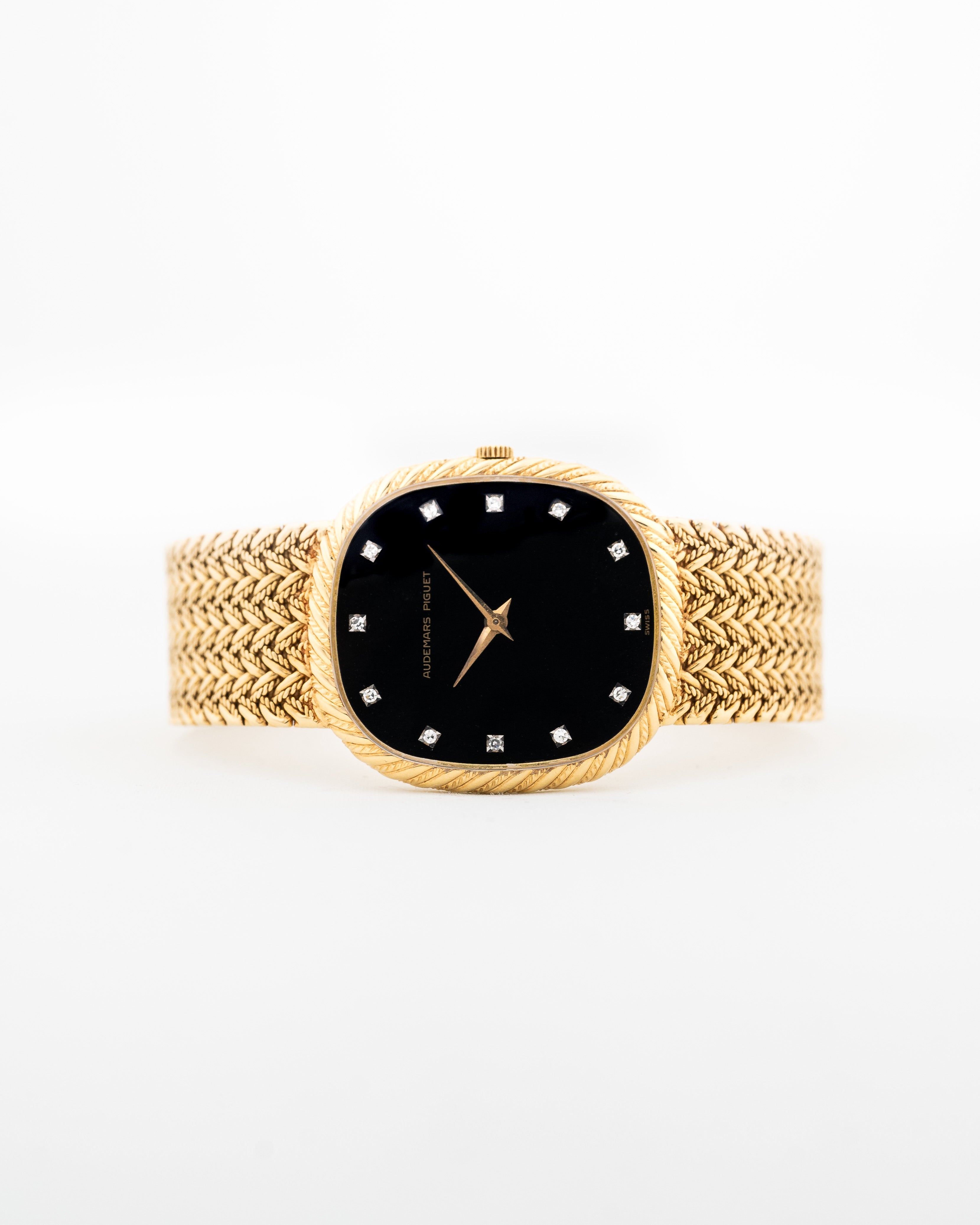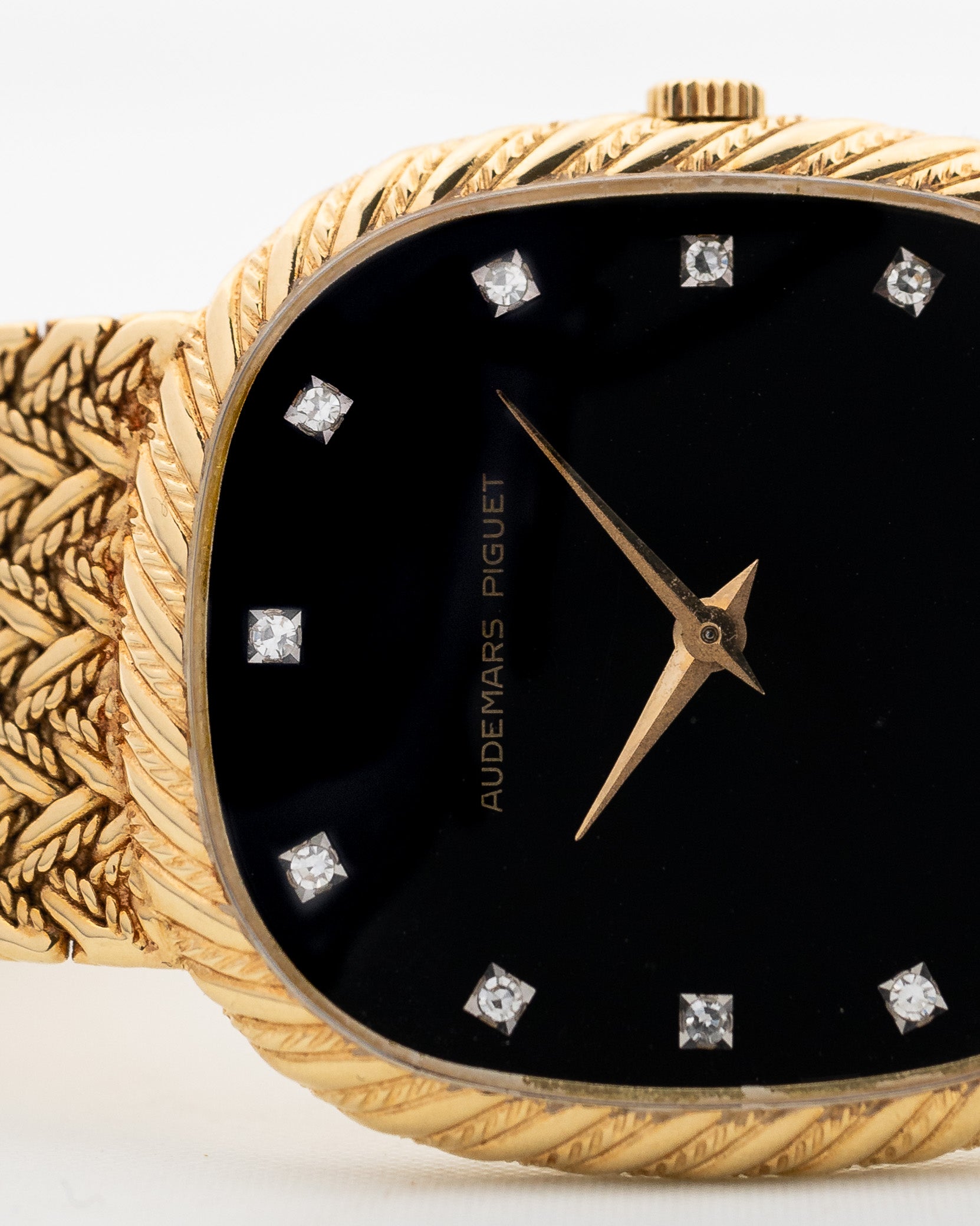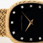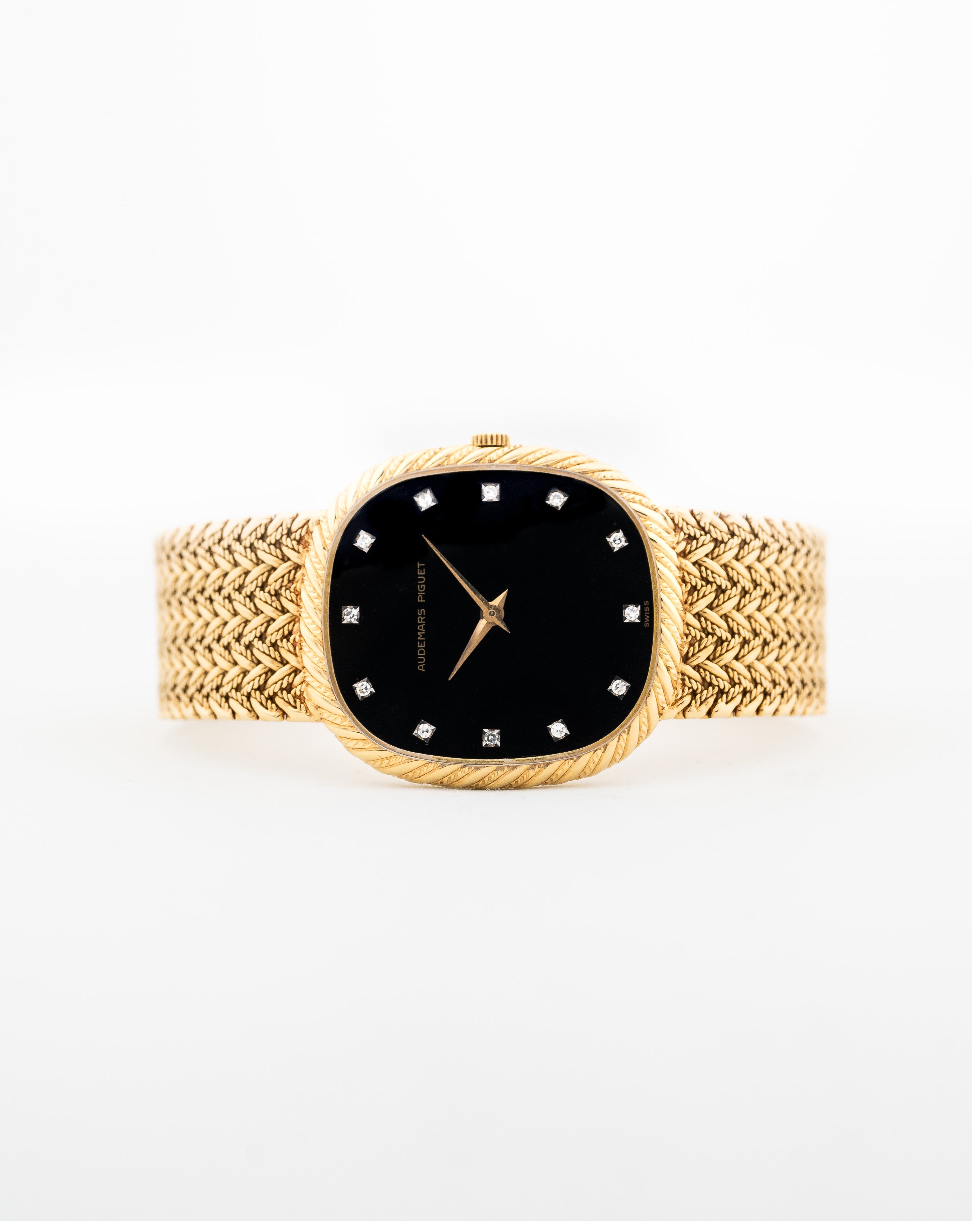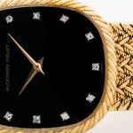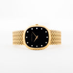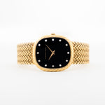 The 18k yellow gold case measuring 28 mm in diameter is in sharp condition and refined with a very unique 18k yellow gold beautifully finished bracelet. The icing on the cake is the rare deep black onyx dial with factory diamond setting.