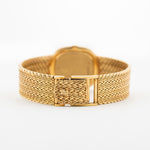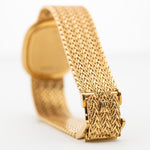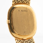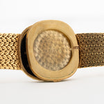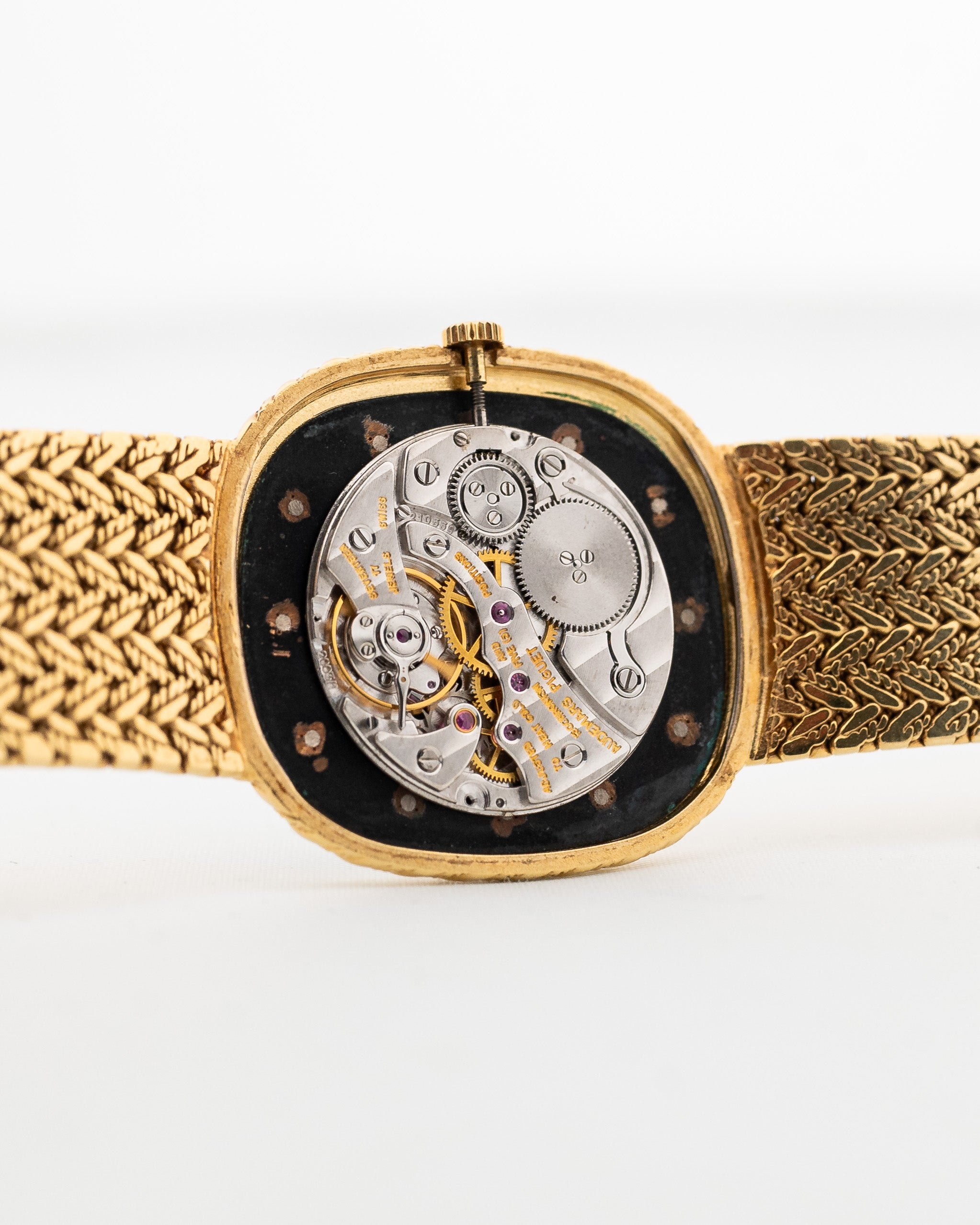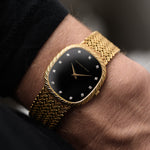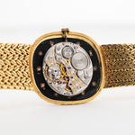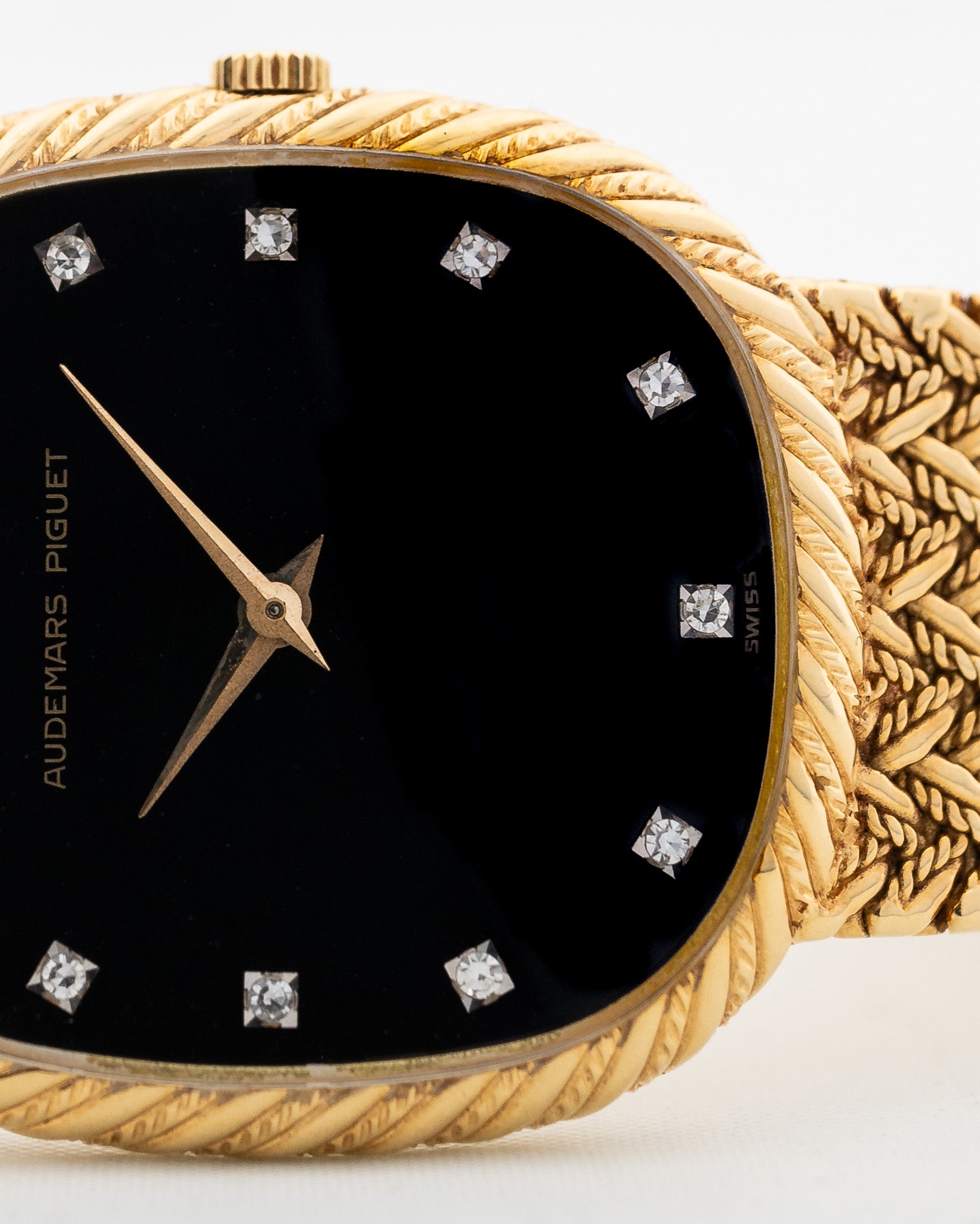 The 18k yellow gold case measuring 28 mm in diameter is in sharp condition and refined with a very unique 18k yellow gold beautifully finished bracelet. The icing on the cake is the rare deep black onyx dial with factory diamond setting.
