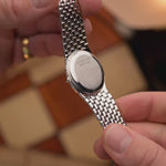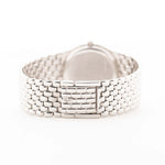 The 31 mm 18k white gold case is paired with a meticulously hand-finished integrated gold bracelet, giving the watch its signature serpentine fluidity — a form that seems to glide effortlessly across the wrist. The black dial, shimmering under different light angles, is adorned with 12 factory-set diamond hour markers, adding quiet opulence to its minimalist character.