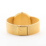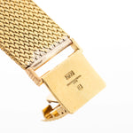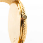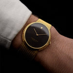 The 18k yellow gold case measuring 34 mm in diameter is in sharp condition and refined with a very unique 18k yellow gold finished bracelet. The icing on the cake is the rare deep black dial.