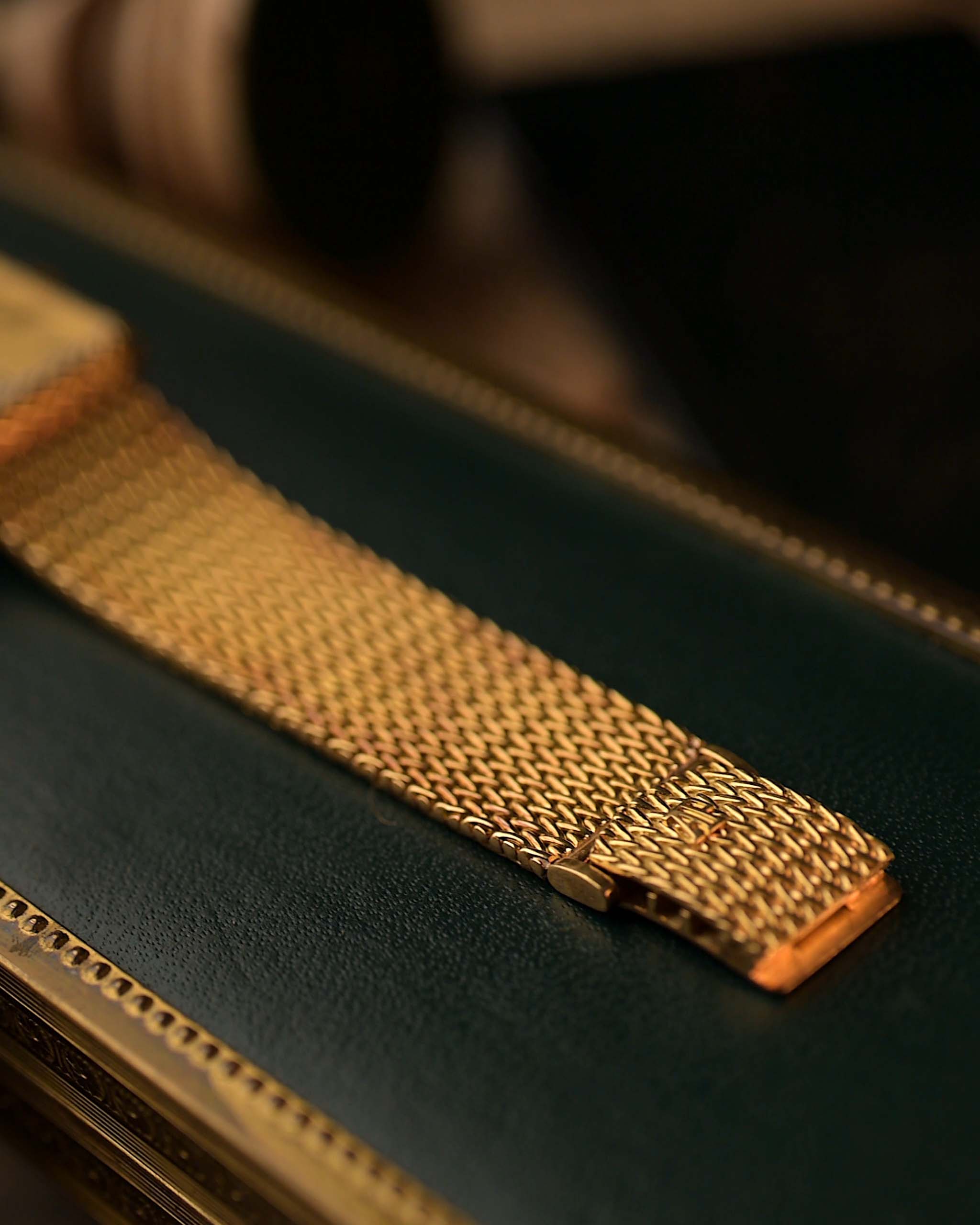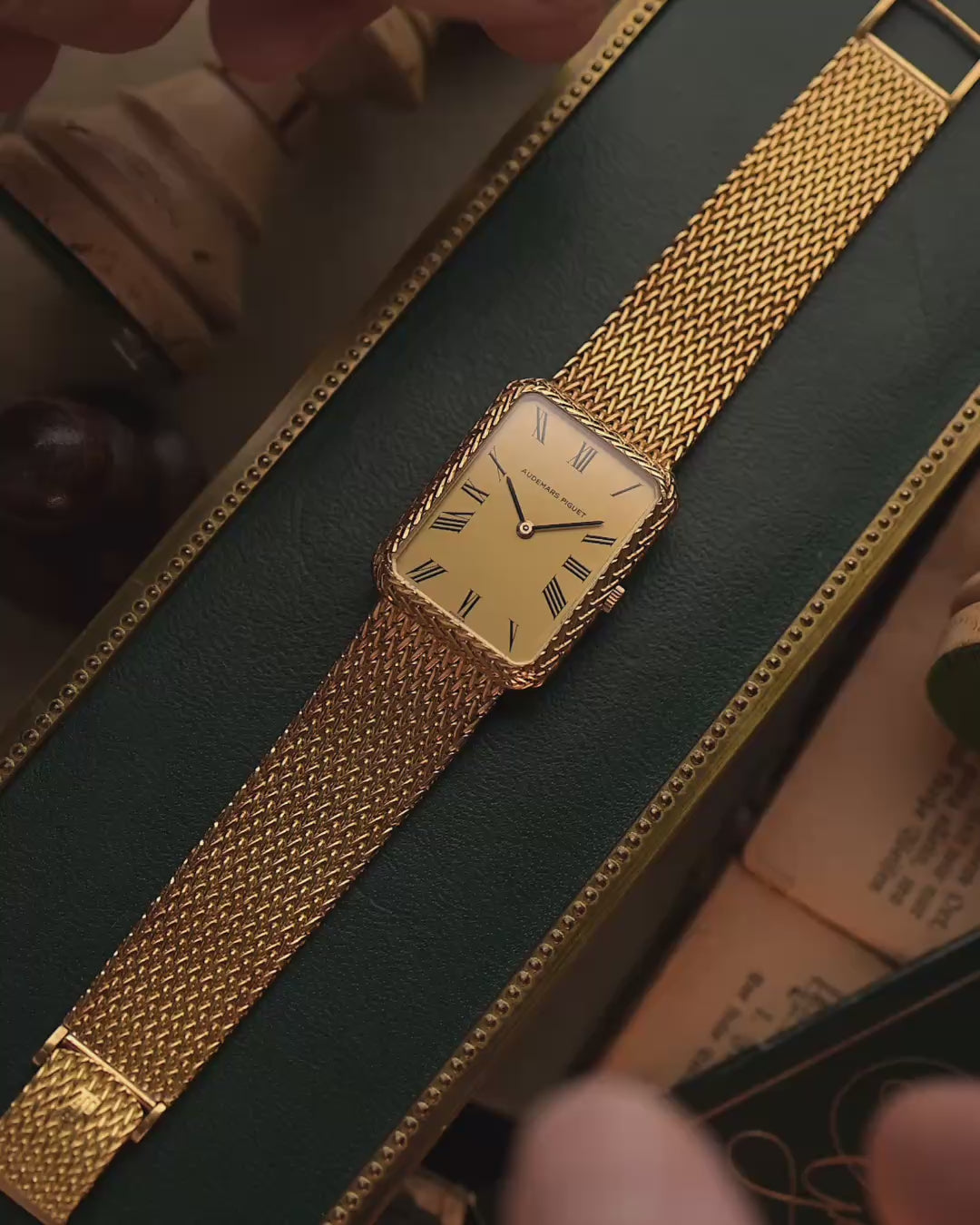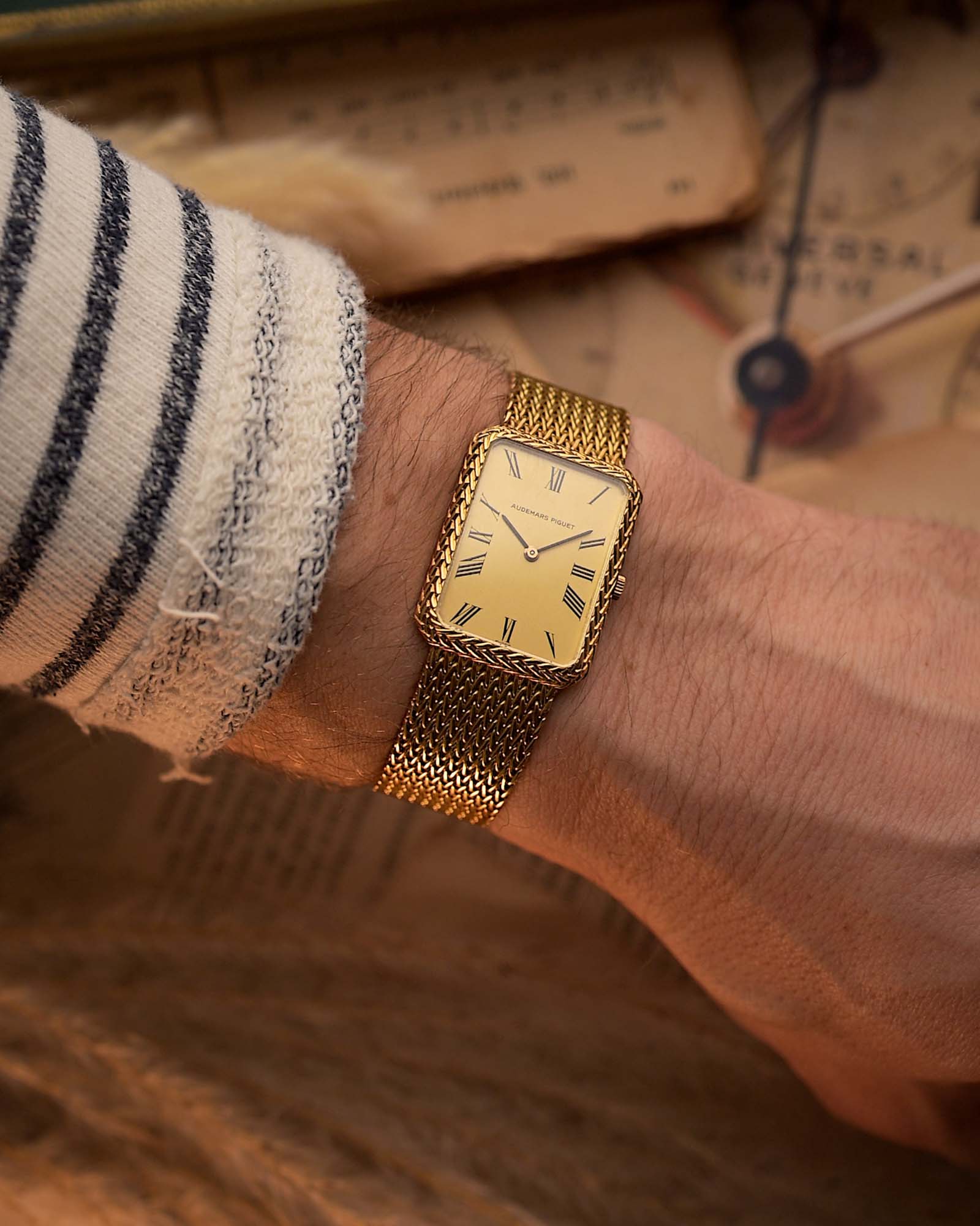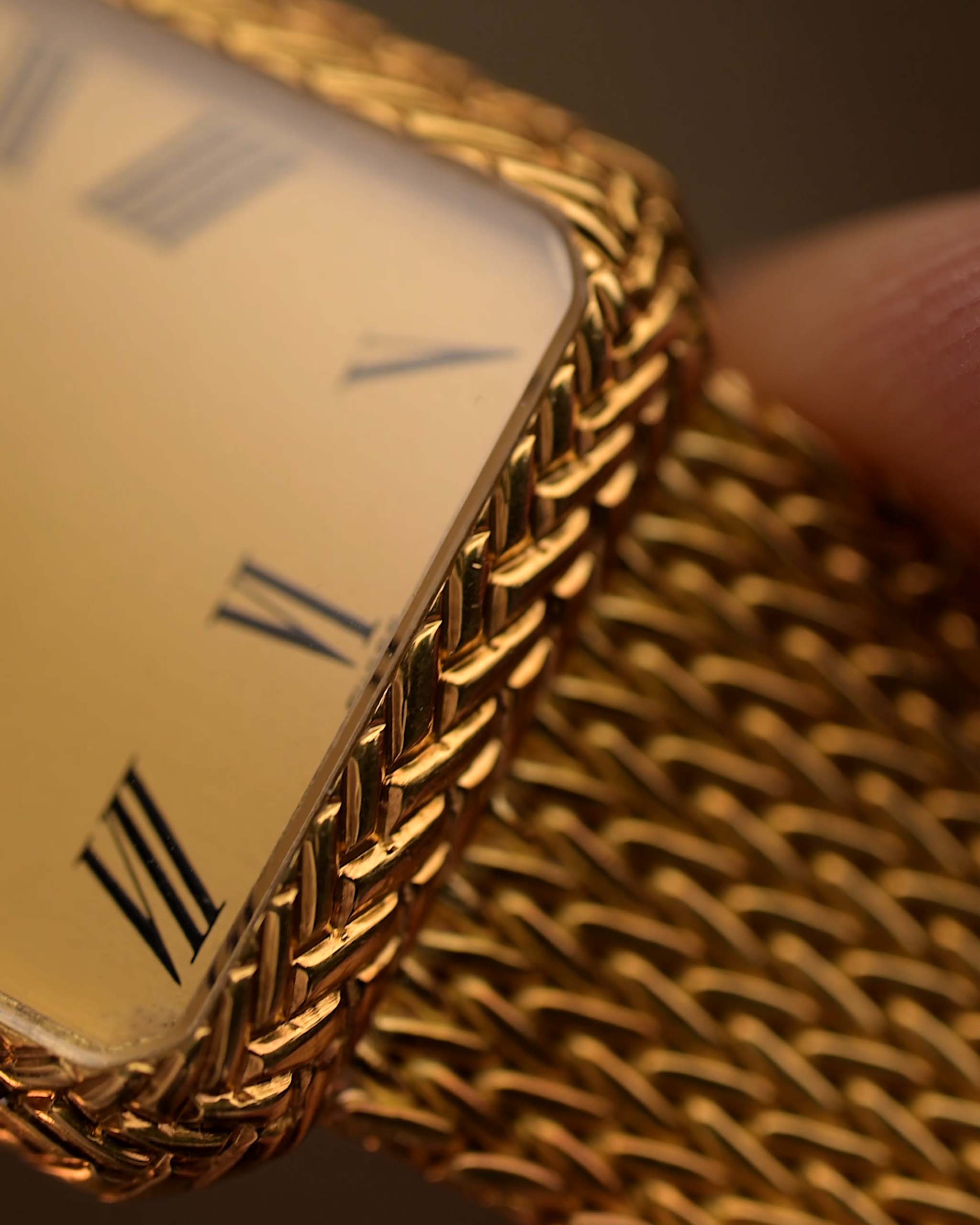 This 1970s Audemars Piguet dress watch stands out with its rare rope designed case, crafted entirely in 18k yellow gold. The interplay of geometry and texture continues with the tank golden dial, featuring black roman numerals.