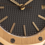 Crafted in stainless steel and 18k yellow gold, this two-tone execution exudes subtle luxury while keeping the industrial spirit of the original intact. The grey tapisserie dial, untouched and in flawless condition, features an applied gold AP logo, luminous stick markers, and matching hands — all showing even, natural aging that enhances its vintage character.
