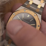 Vintage Audemars Piguet 4100SA Royal Oak Watch from the 1980s on a wrist. 36mm in Stainless Steel & 18k Yellow Gold with Rare flawless grey tapisserie dial, Two-Tone bracelet and Automatic movement.