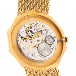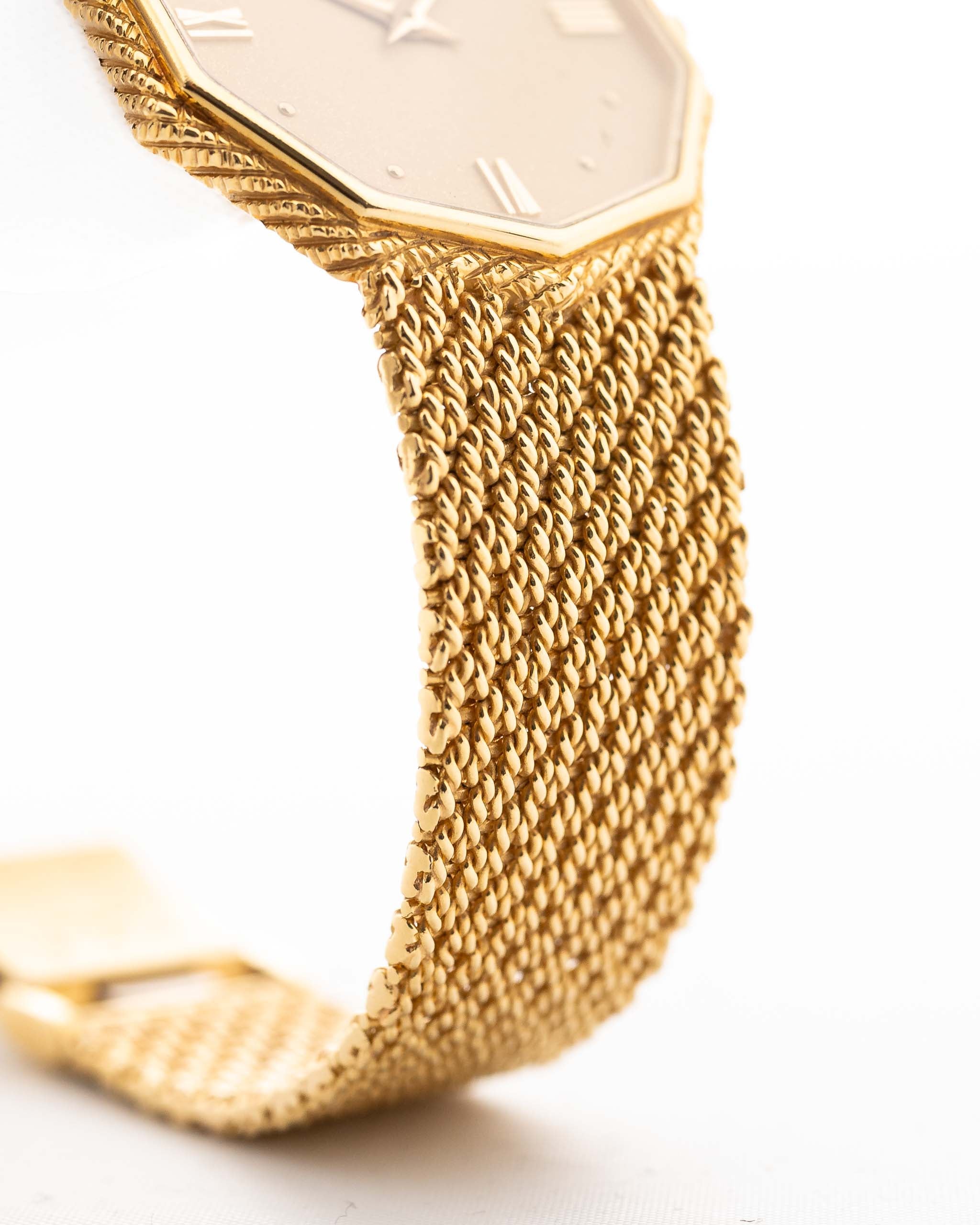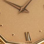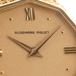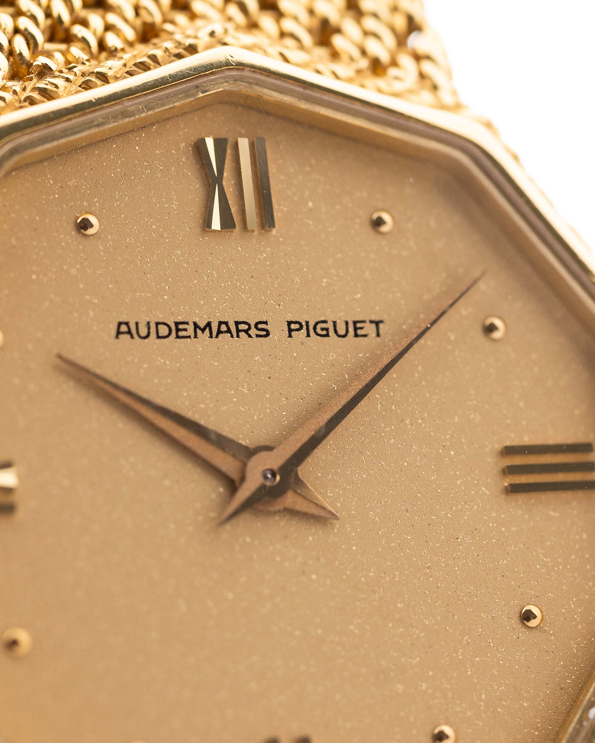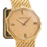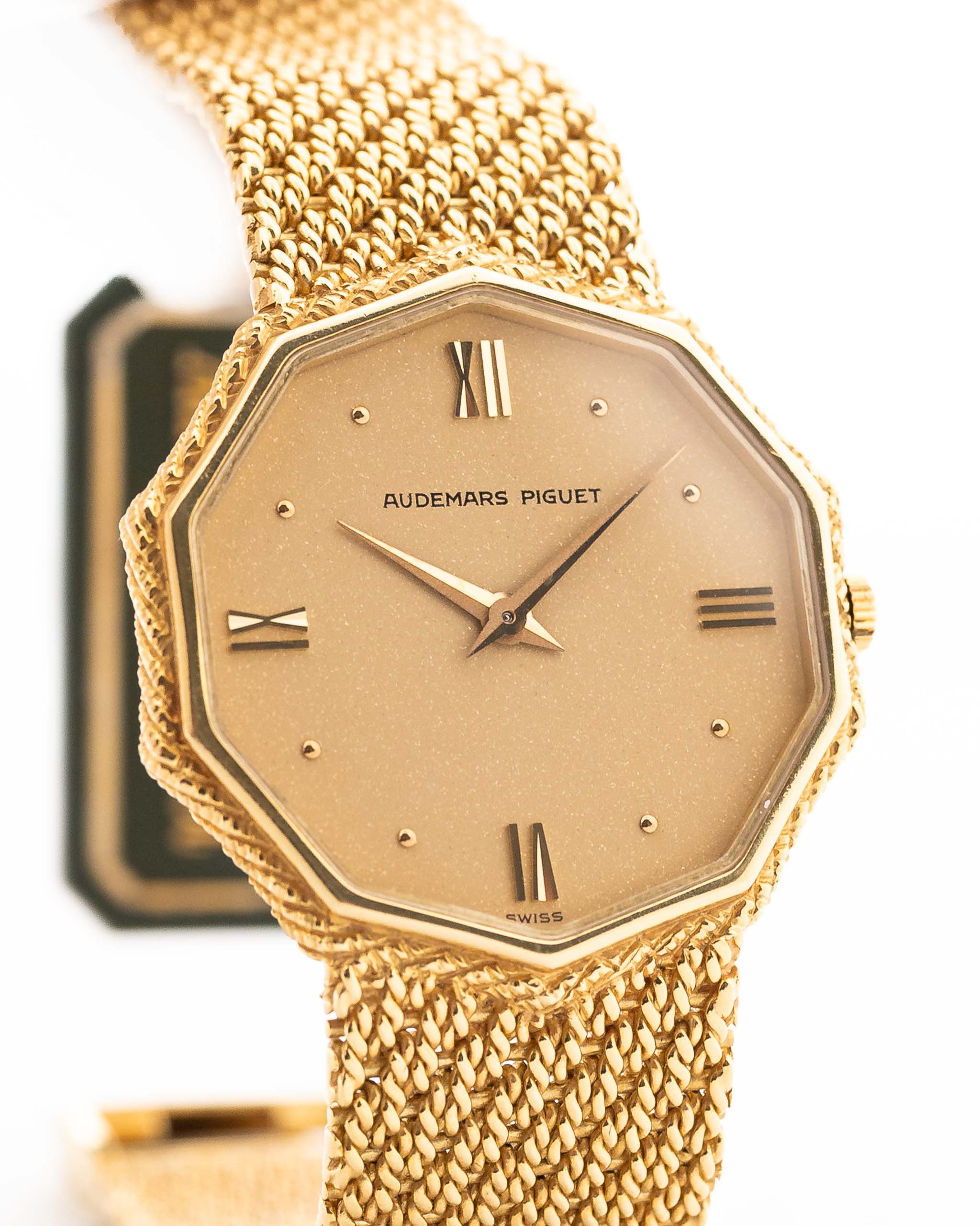 An octagon shaped 18k yellow gold case golden aventurine dial with AP logo. Golden roman twelve, three, six, nine dial layout and alpha handset. The icing on the cake is the very unique 18k yellow gold bracelet with AP logo at the clasp.