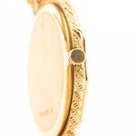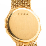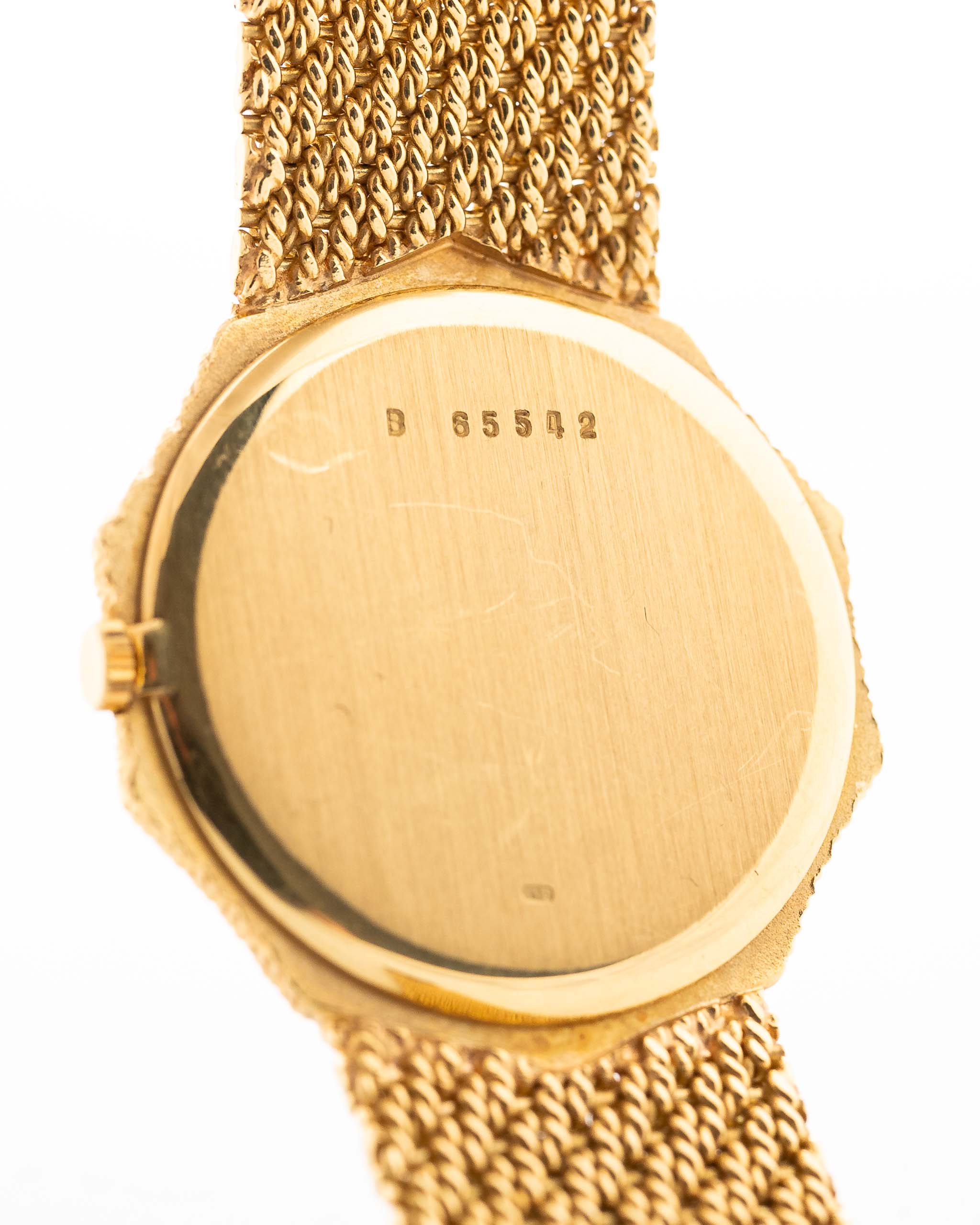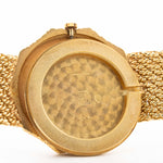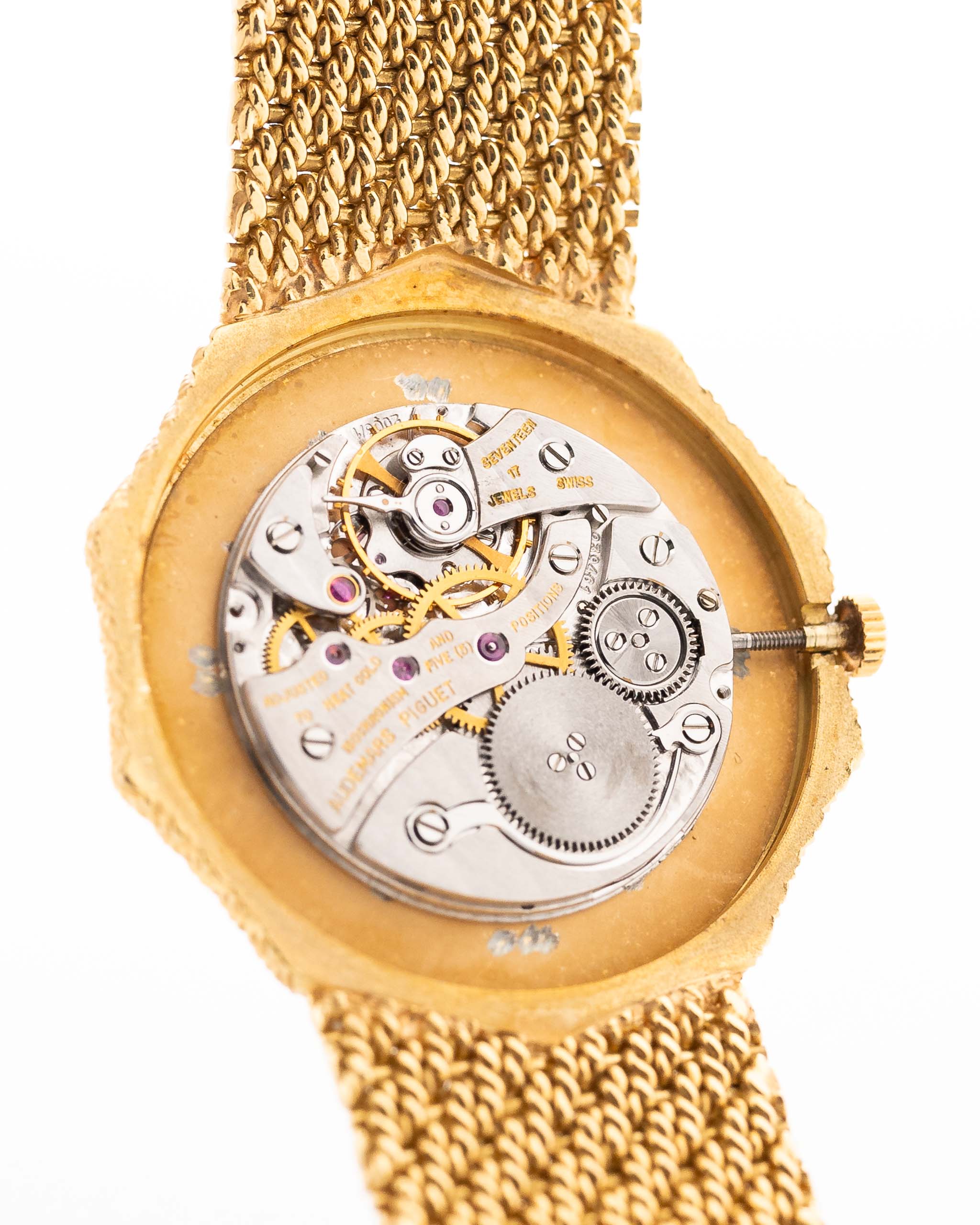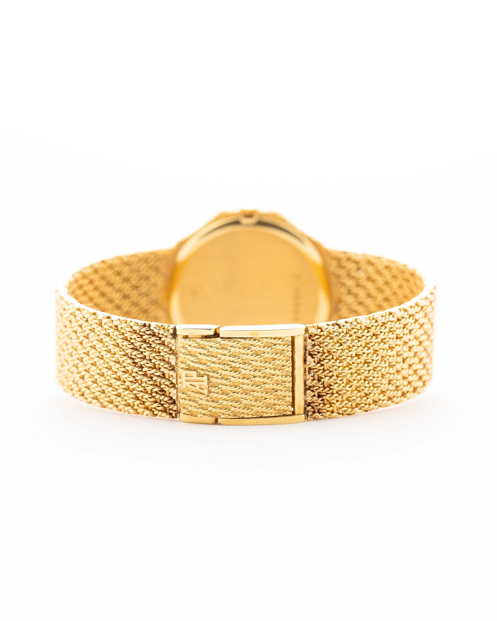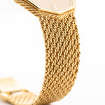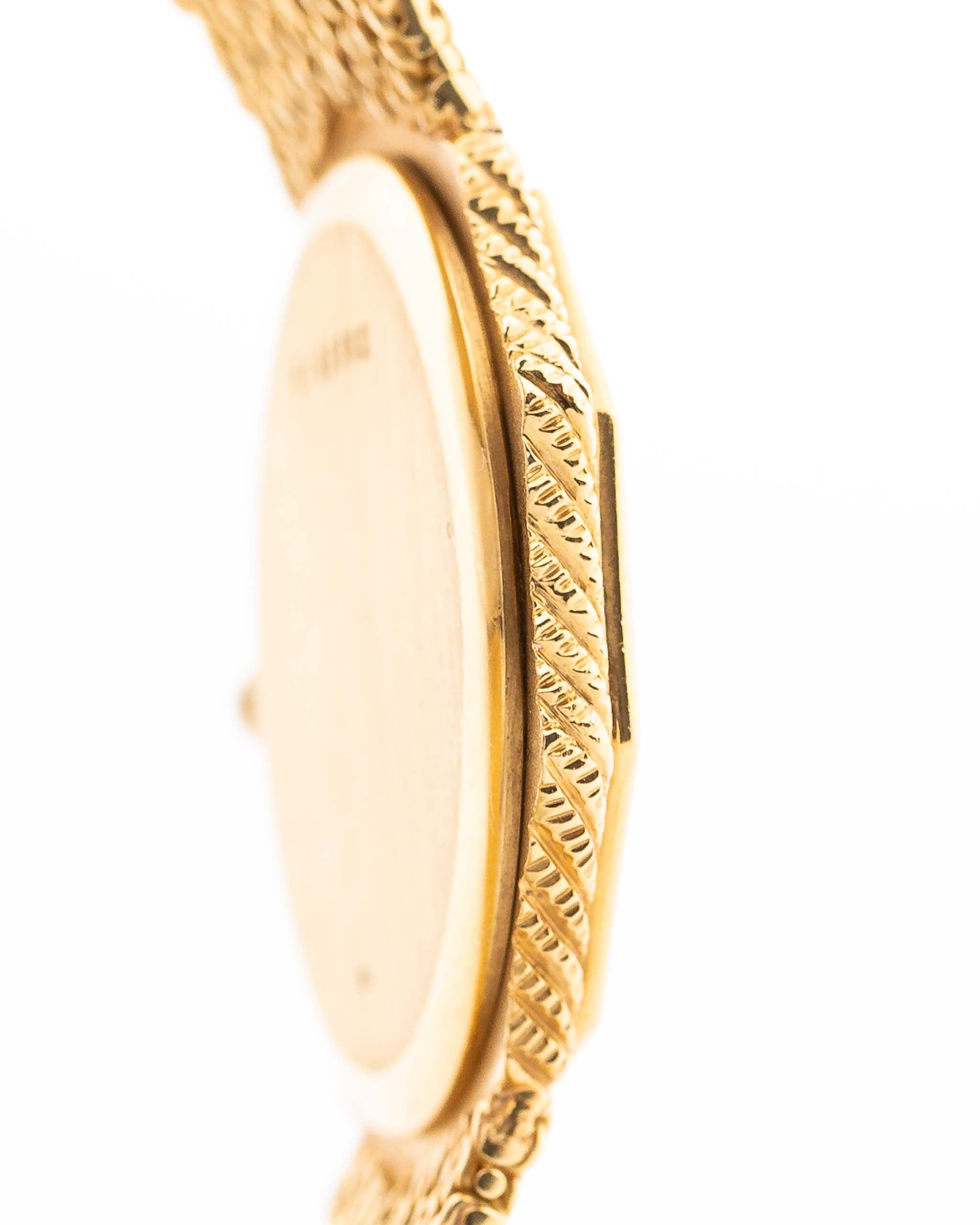 An octagon shaped 18k yellow gold case golden aventurine dial with AP logo. Golden roman twelve, three, six, nine dial layout and alpha handset. The icing on the cake is the very unique 18k yellow gold bracelet with AP logo at the clasp.