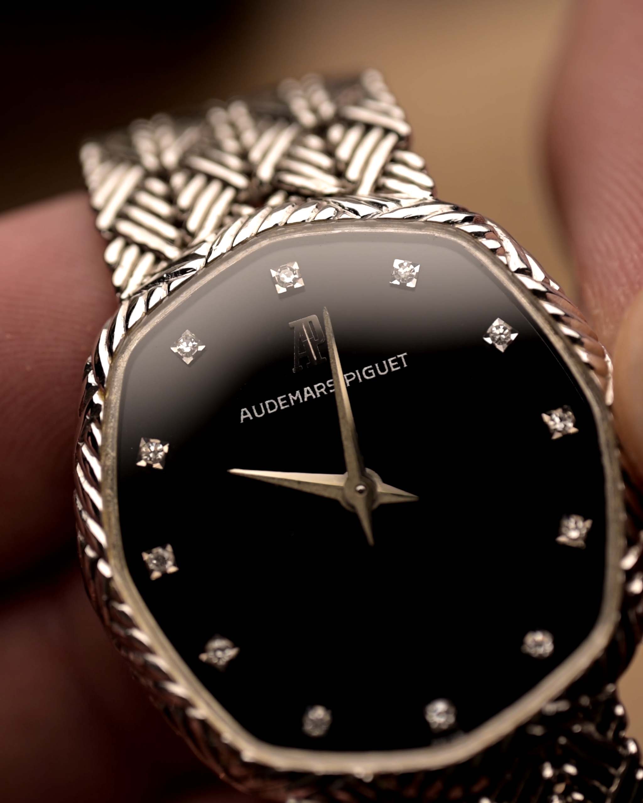 This rare Audemars Piguet from the late 1970s is an exercise in quiet opulence. Crafted entirely in 18k white gold, its unique octagonal-elliptical case houses a flawless black onyx dial punctuated by twelve factory-set diamond indexes — understated luxury at its finest.