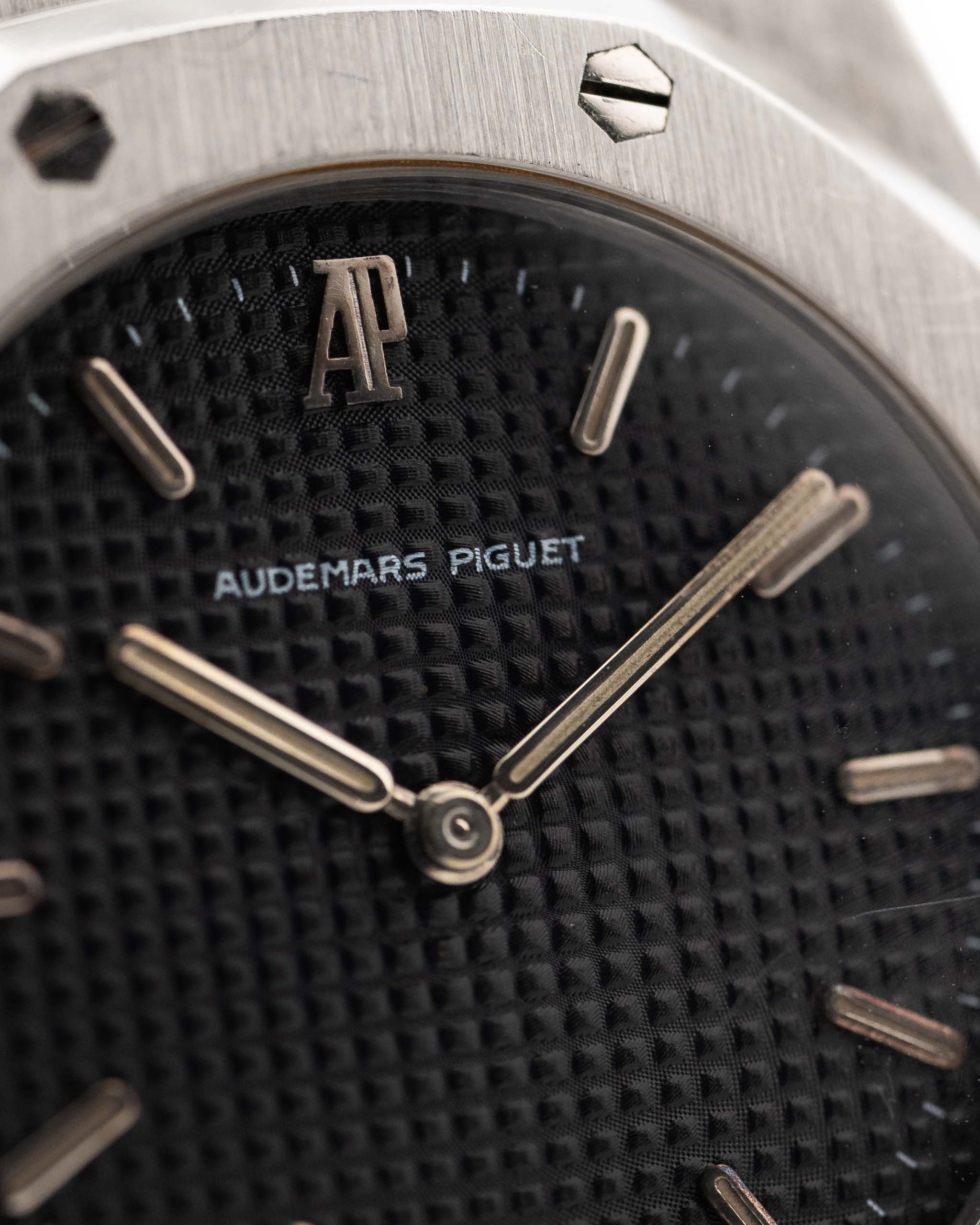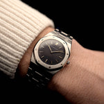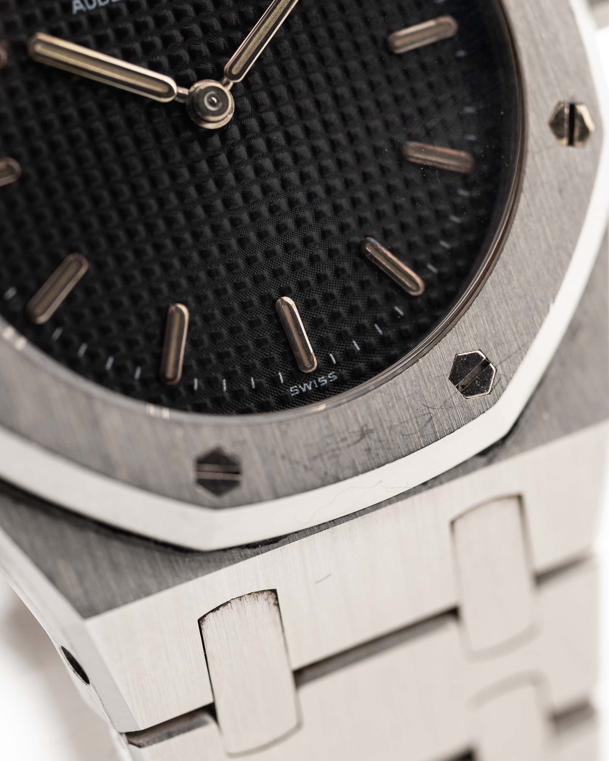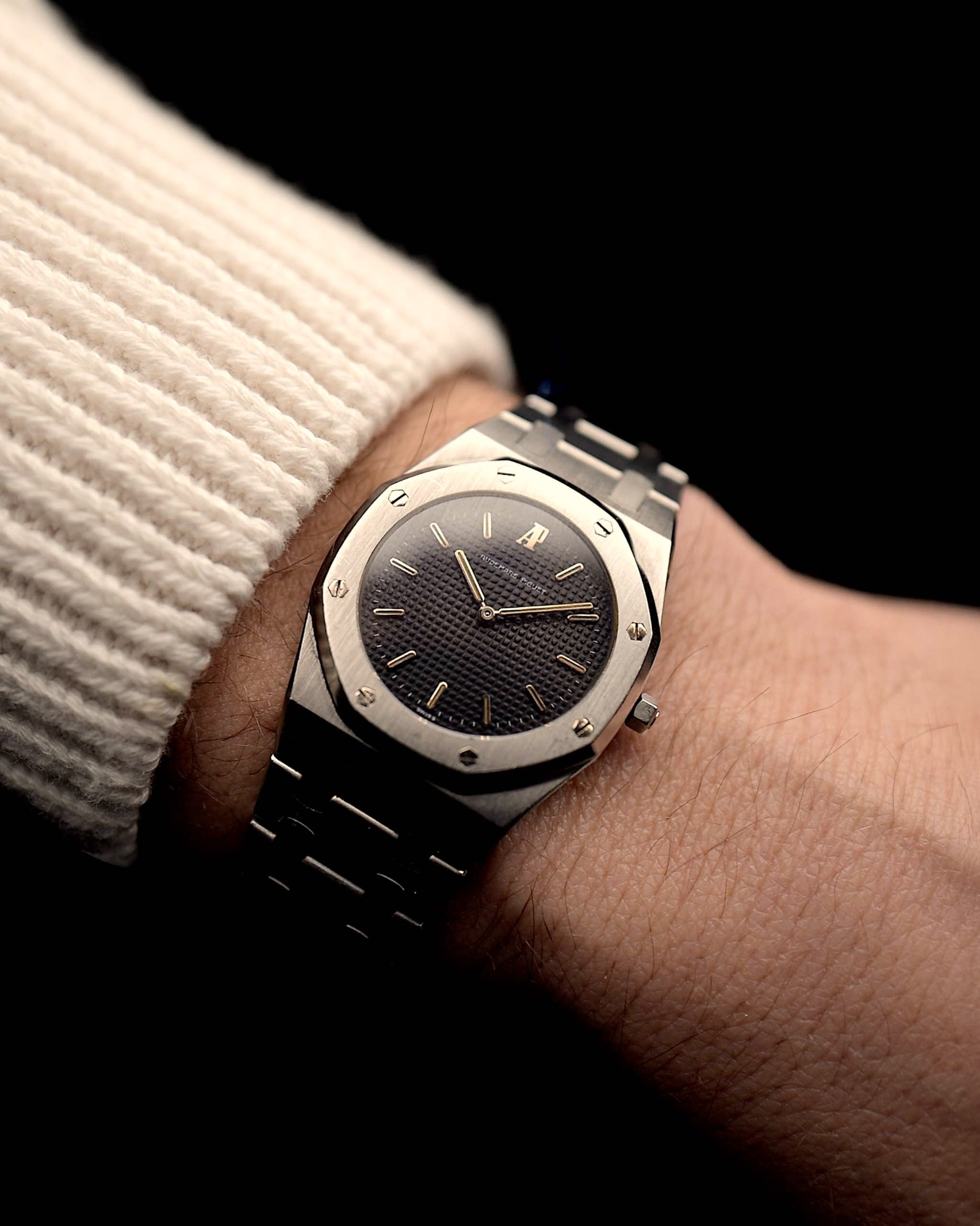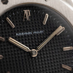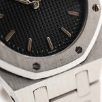Closeup photo of a Vintage Audemars Piguet Royal Oak 6008ST from 1980s on a wrist. Stainless Steel, 30mm with original black tapisserie dial and Quartz movement.