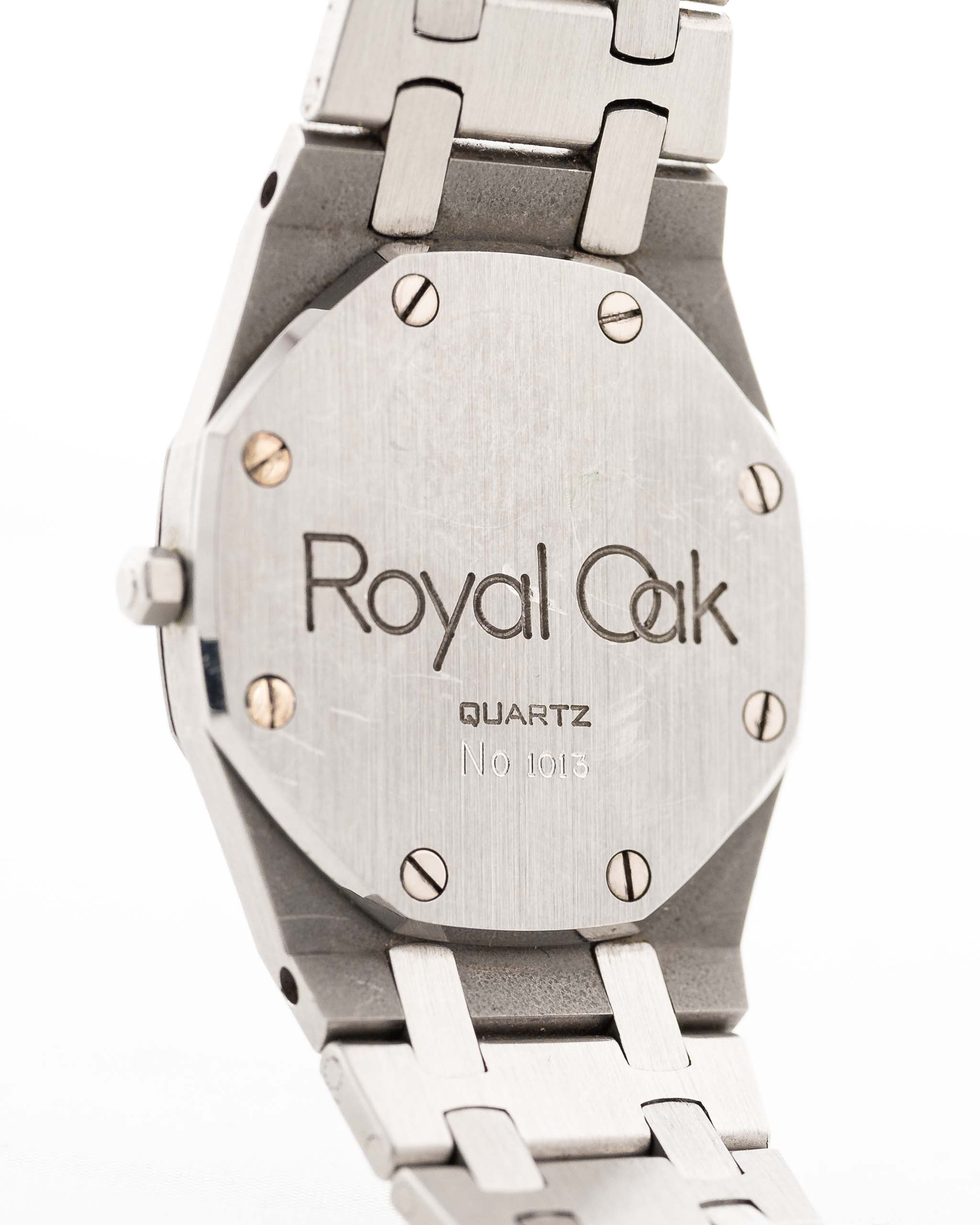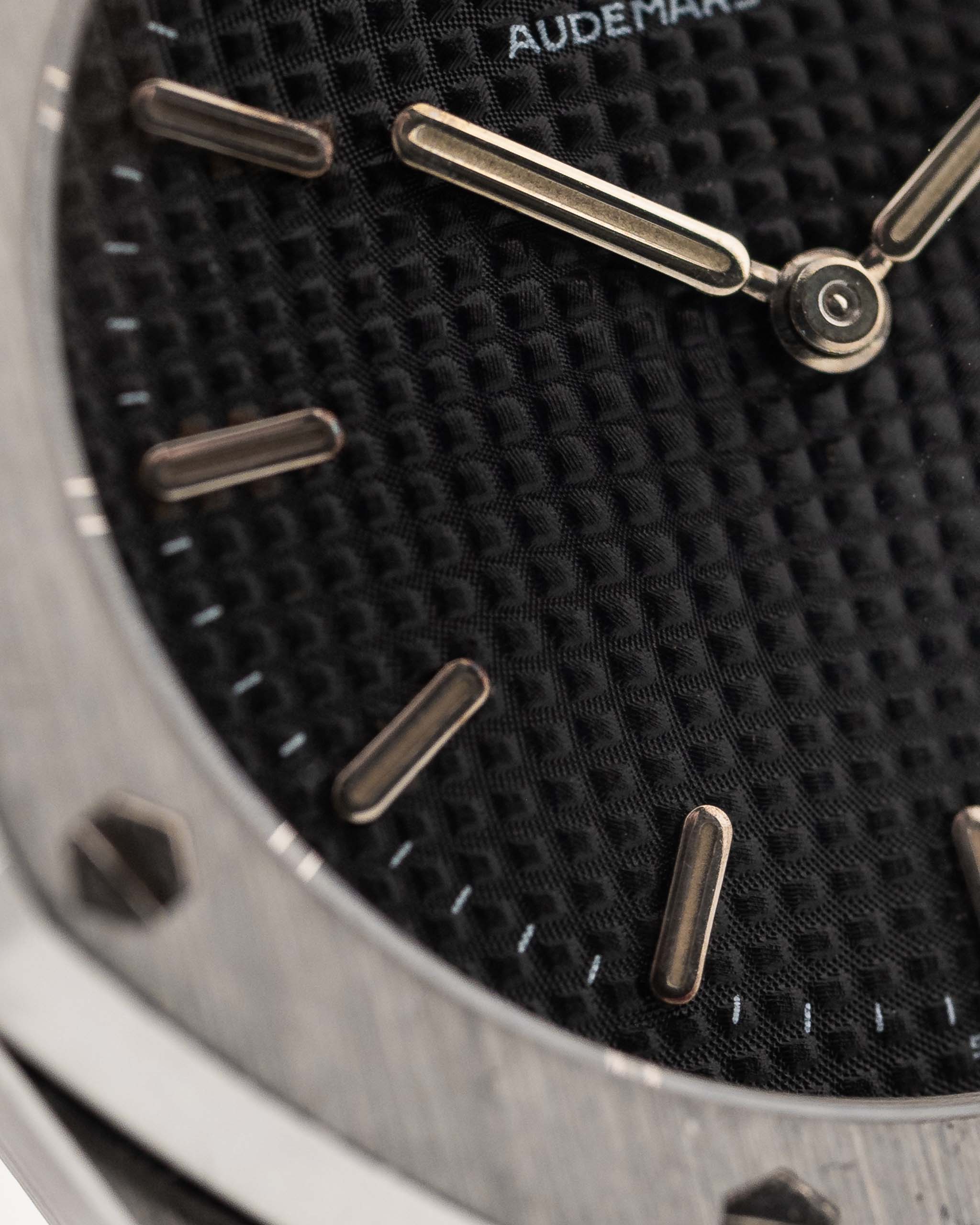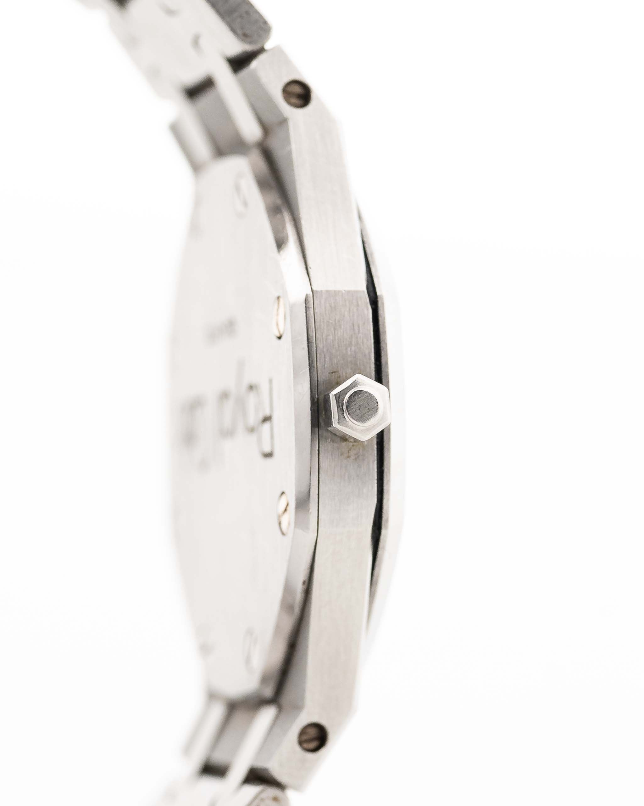 Closeup photo of a Vintage Audemars Piguet Royal Oak 6008ST from 1980s on a wrist. Stainless Steel, 30mm with original black tapisserie dial and Quartz movement.