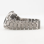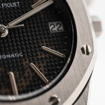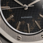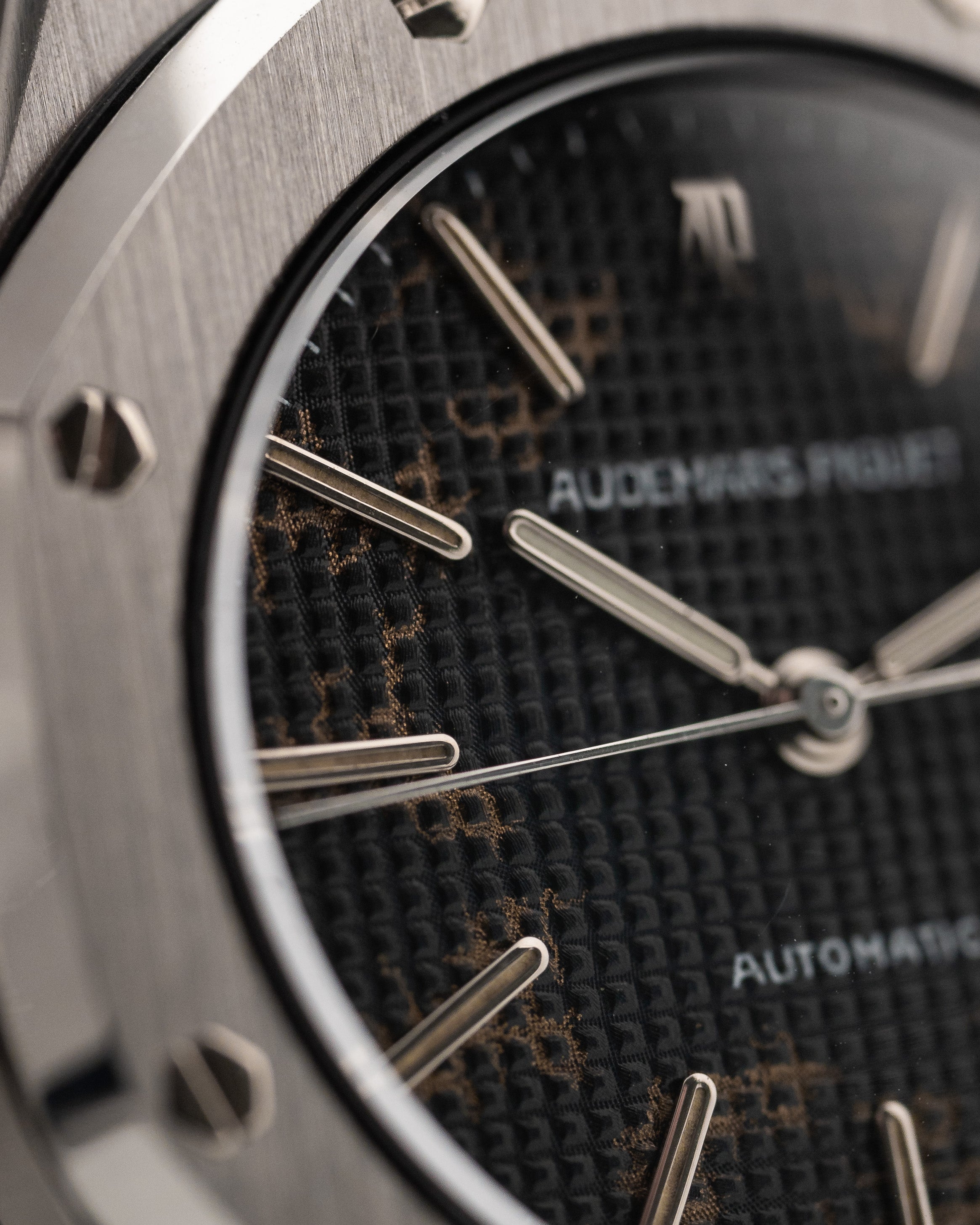 This steel 35mm reference 4100ST is in a condition that will make any collector sweat. The black petit-tapisserie dial, made by Stern, bears the old-style Audemars Piguet signature and some artful patina around the hour markers is in good condition.