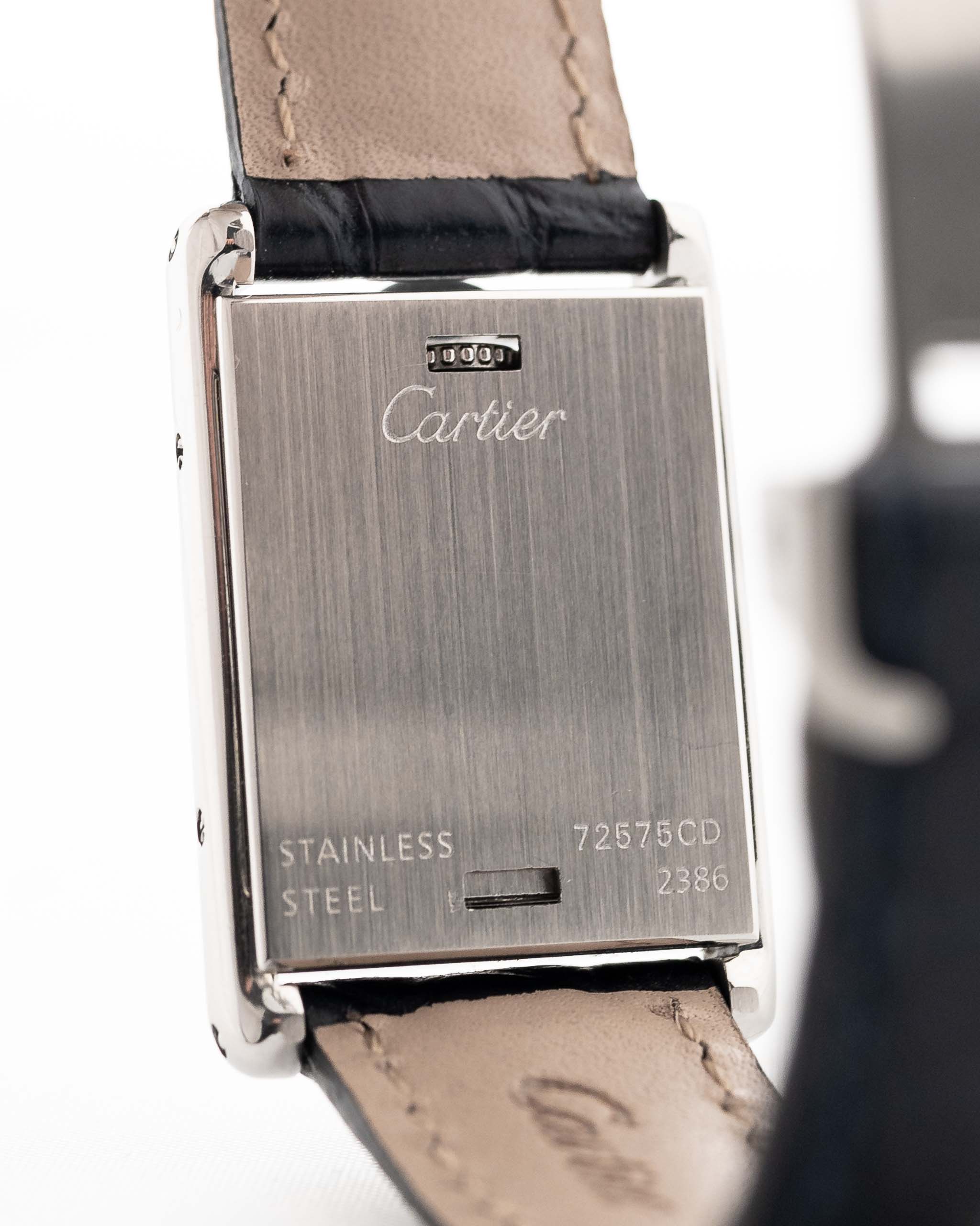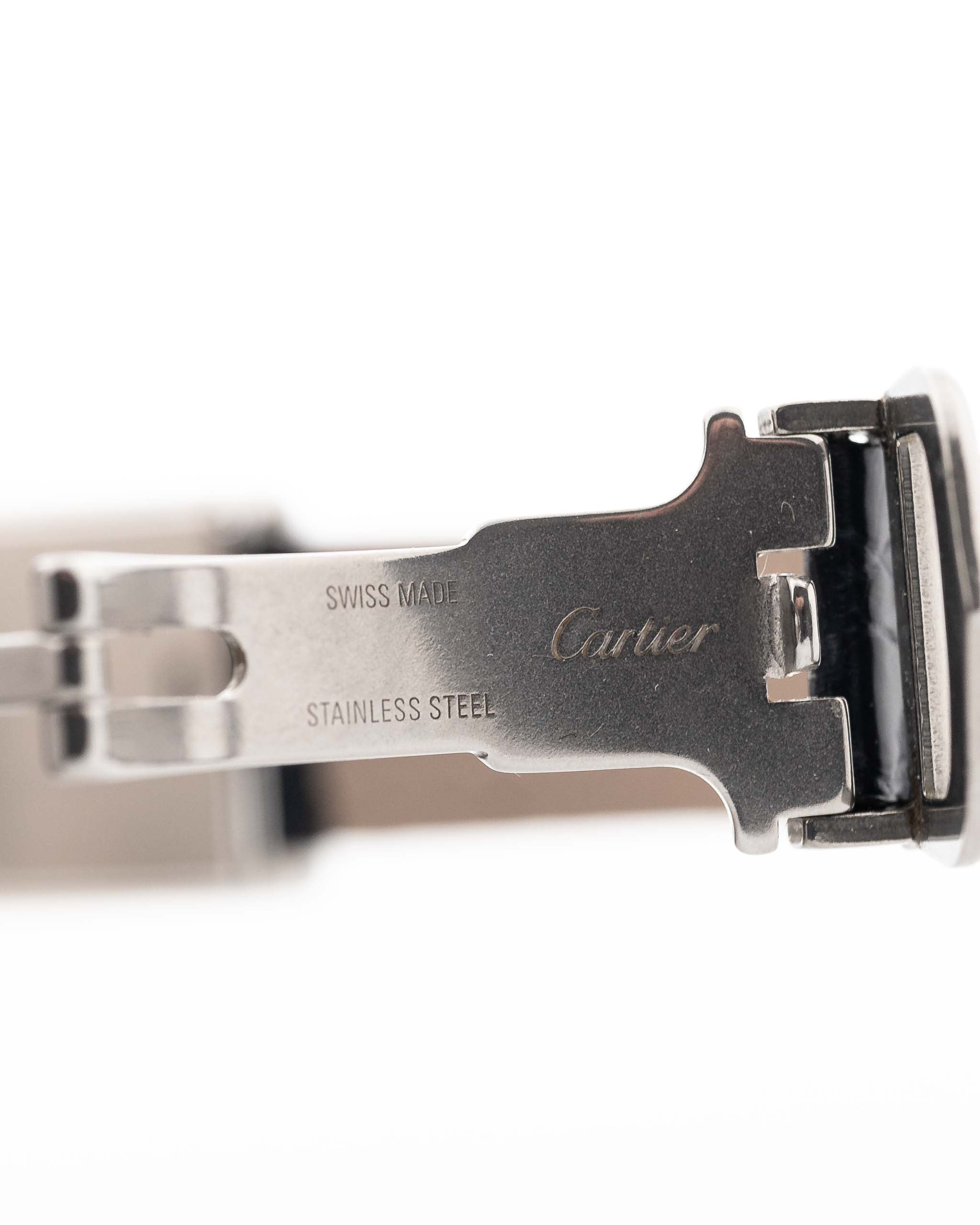 The stainless steel case is slim, balanced, and unmistakably Cartier. Its white dial with blued sword hands and minimalist design speaks to refined taste, while the original blue Cartier leather strap and deployant clasp complete the signature look.