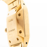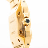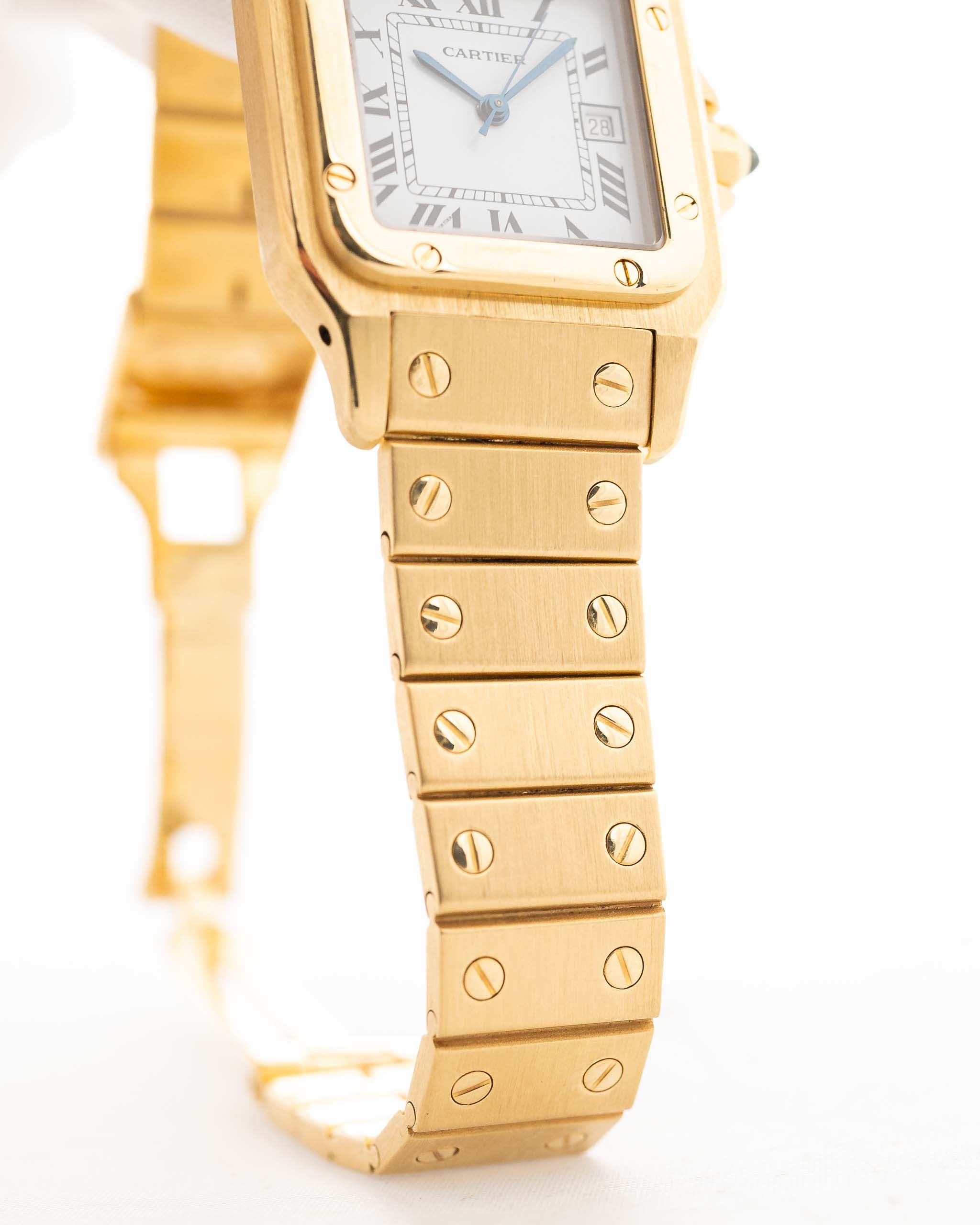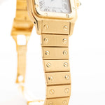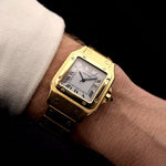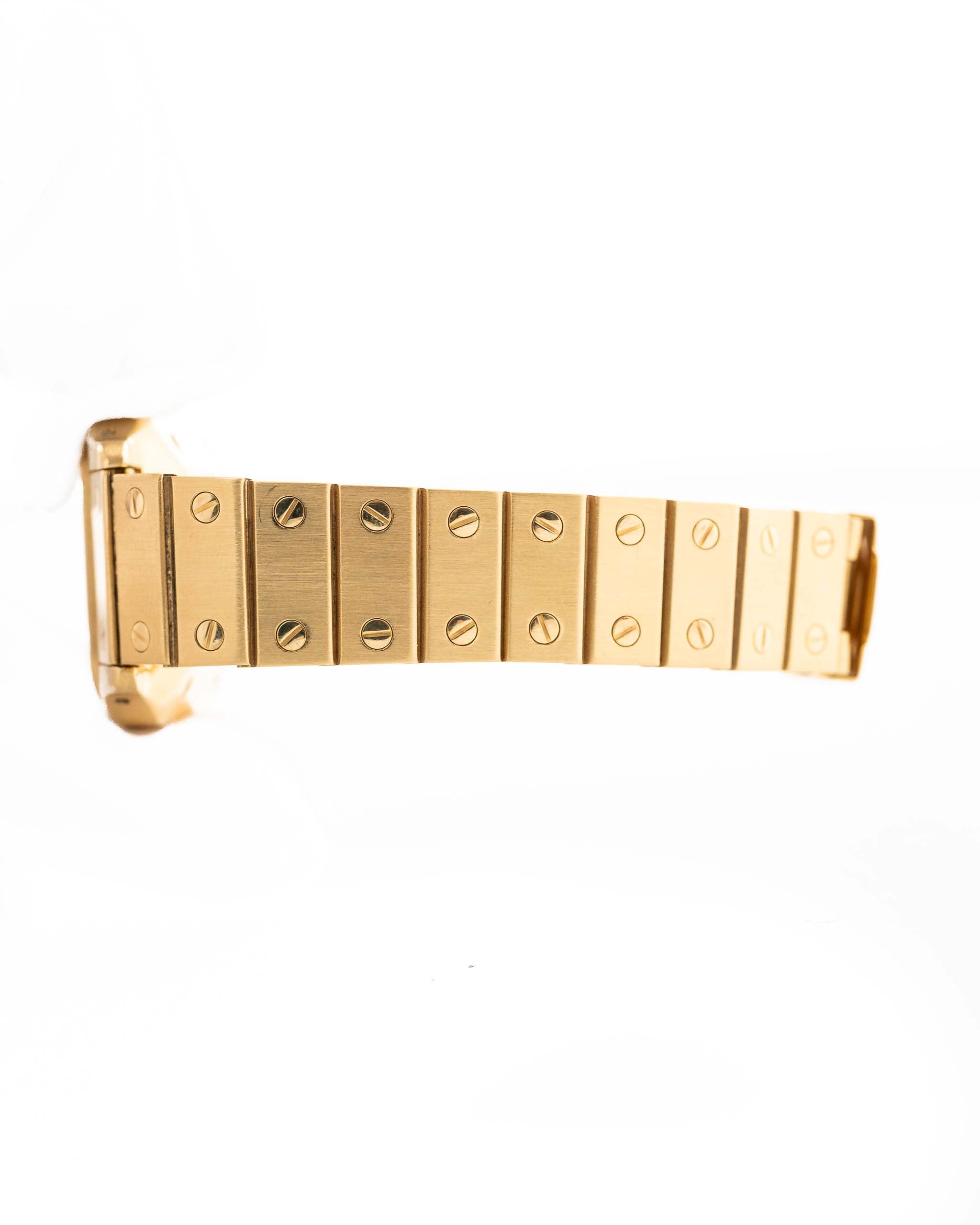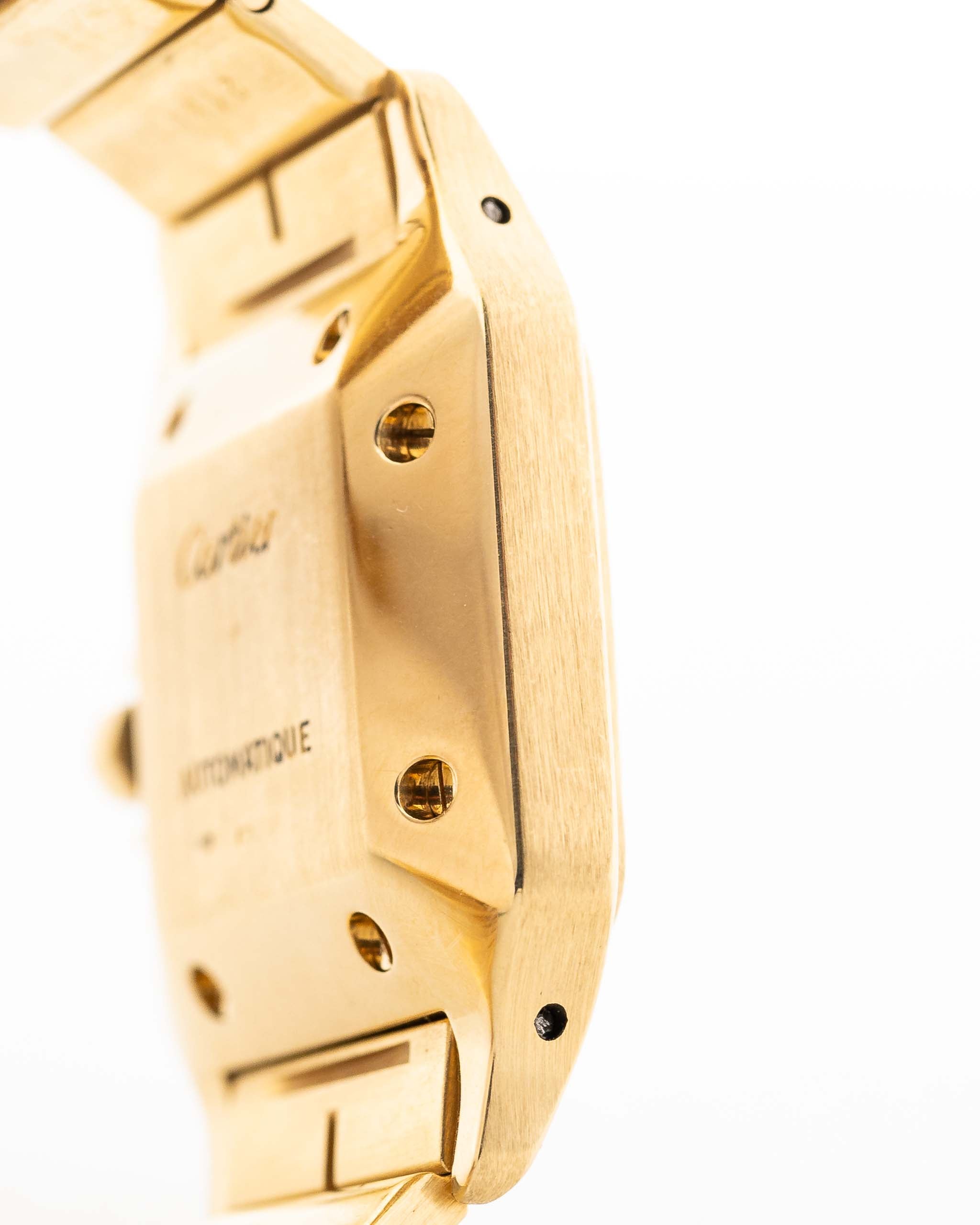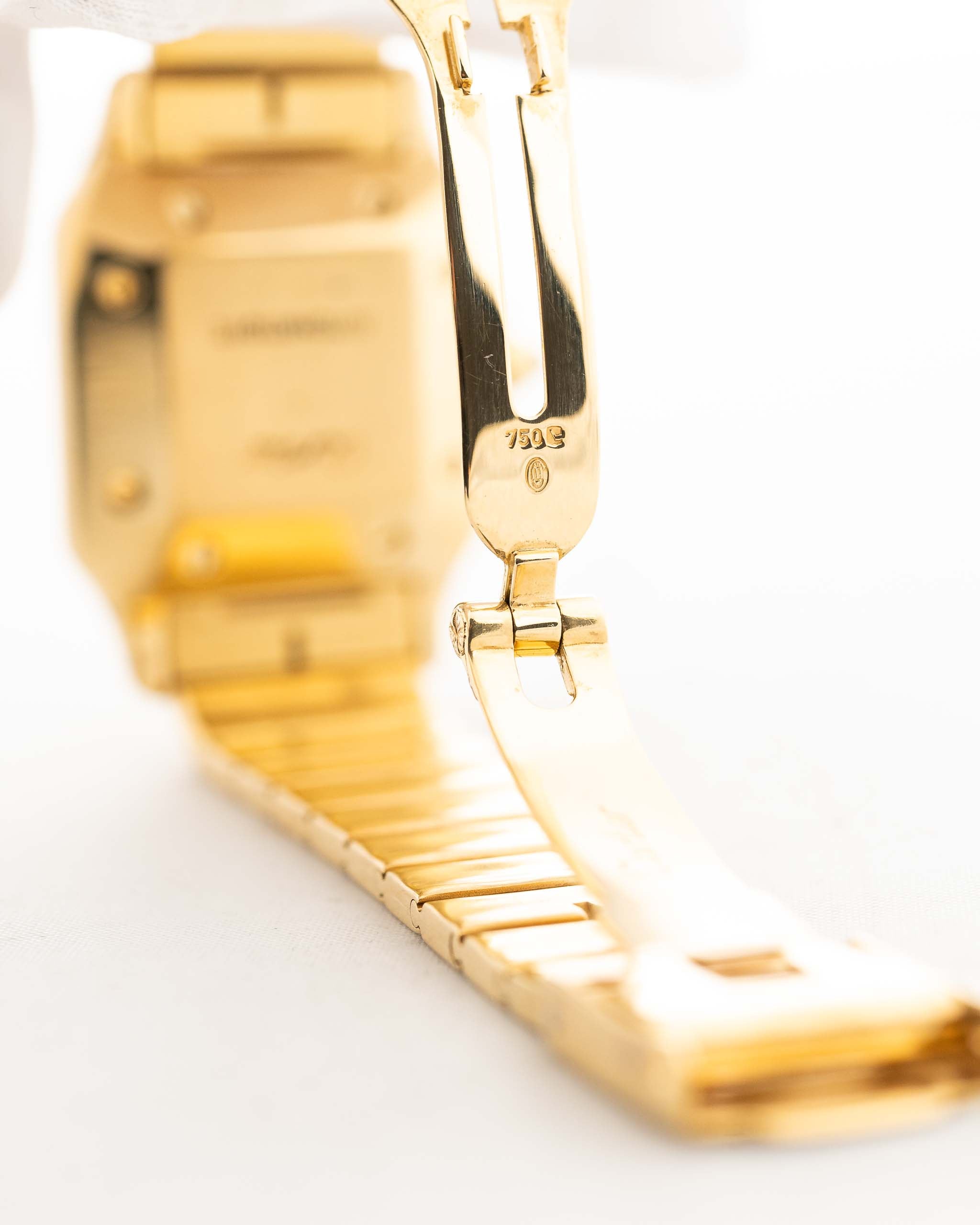 Closeup Photo of a Vintage Cartier Santos Carrée 2964 from the 1980s. In Excellent condition, 27mm case in Yellow Gold with Automatic movement, Original white dial and Gold bracelet.