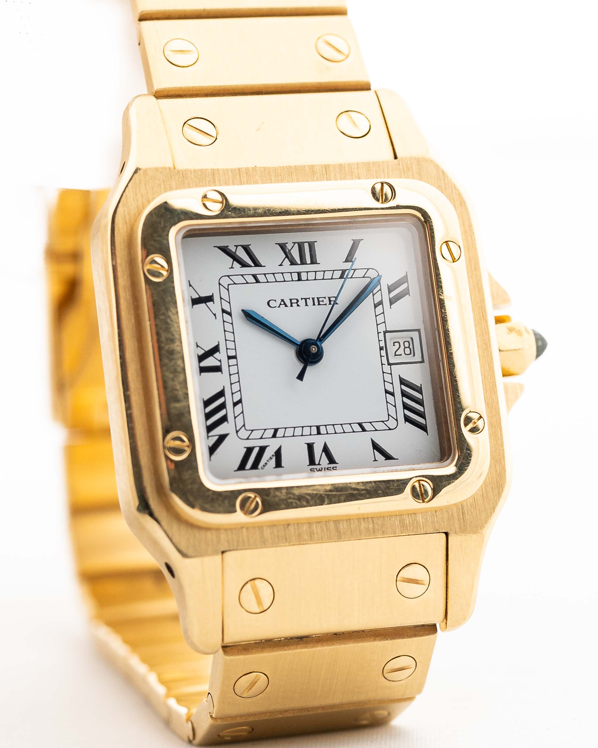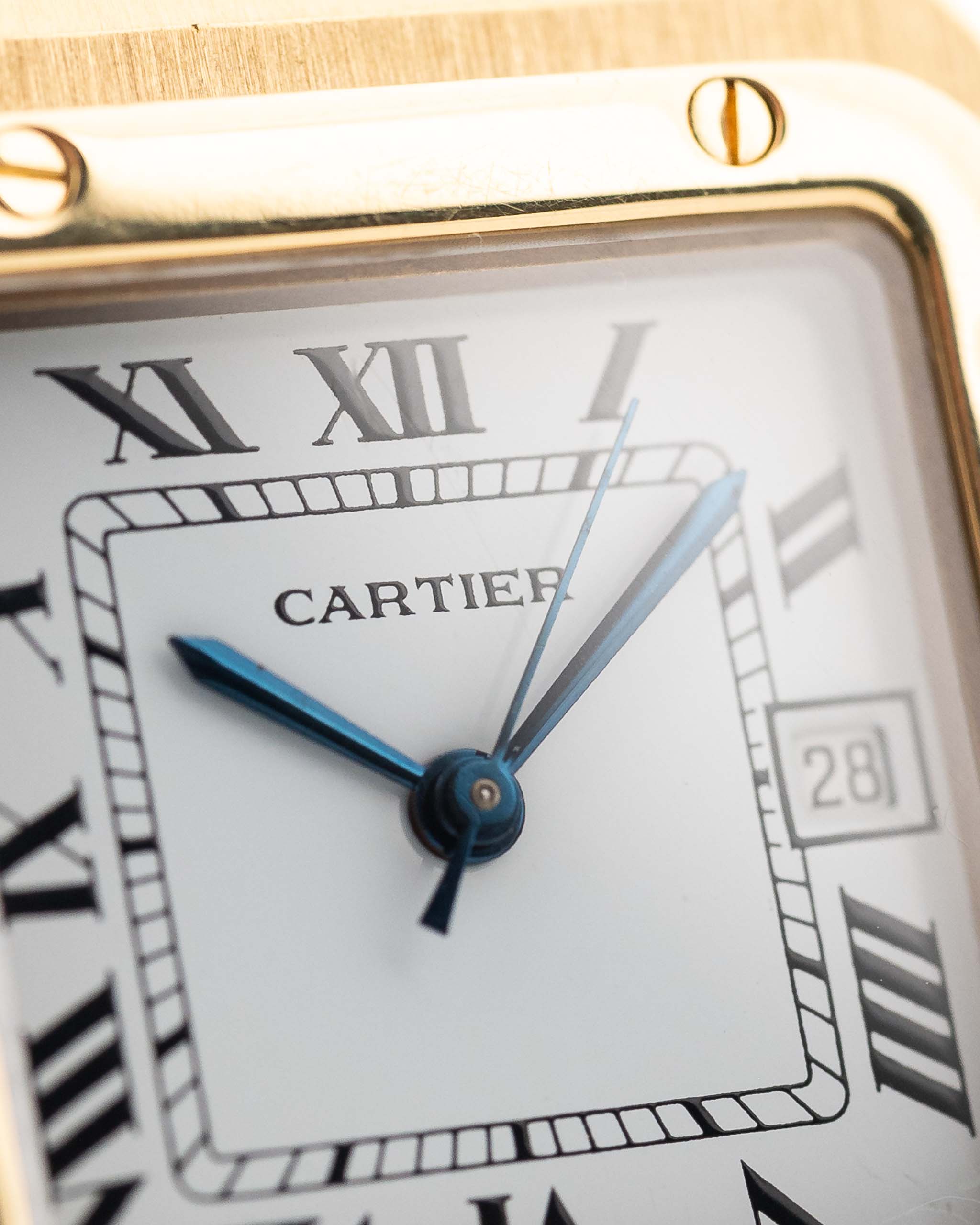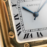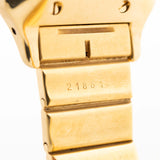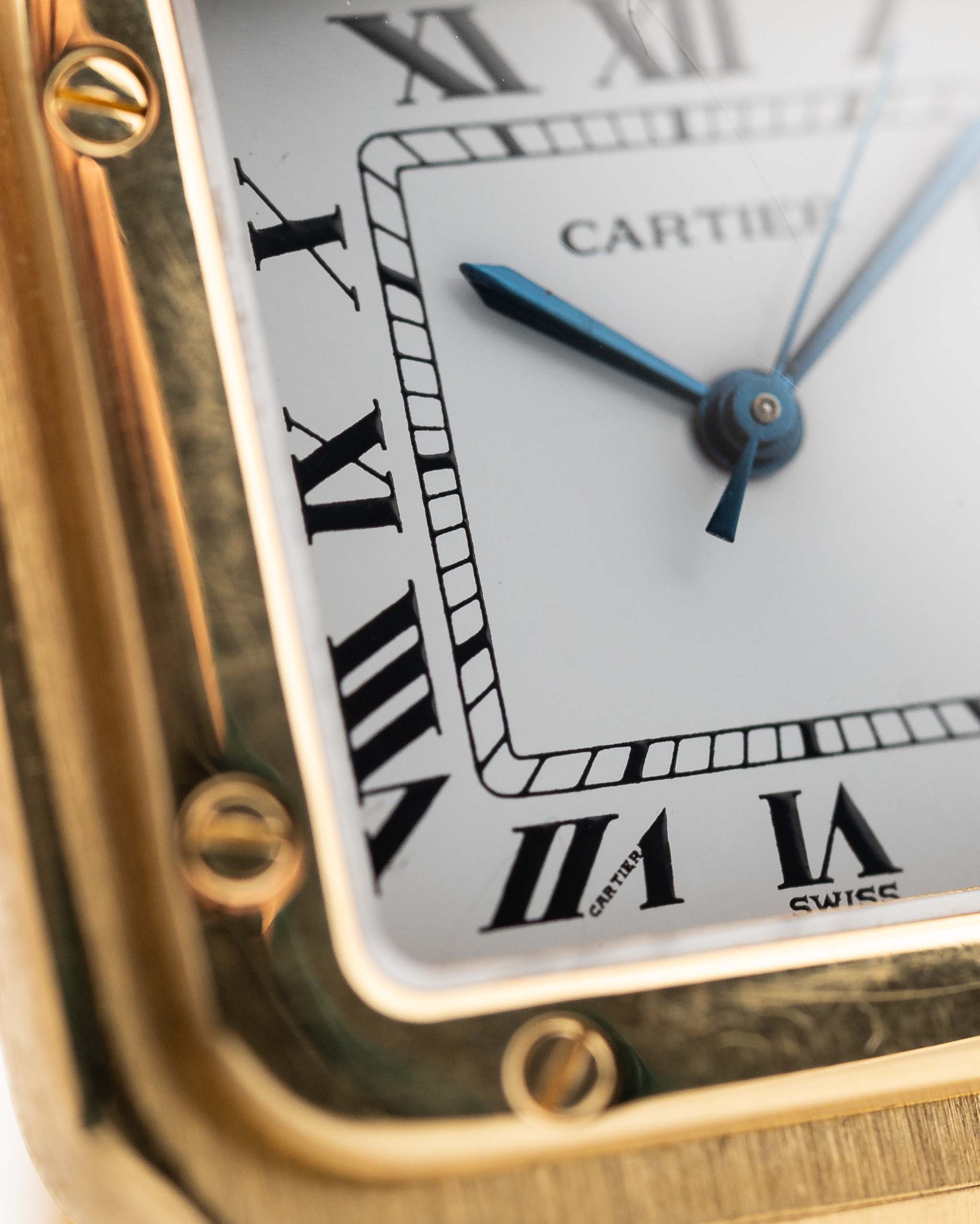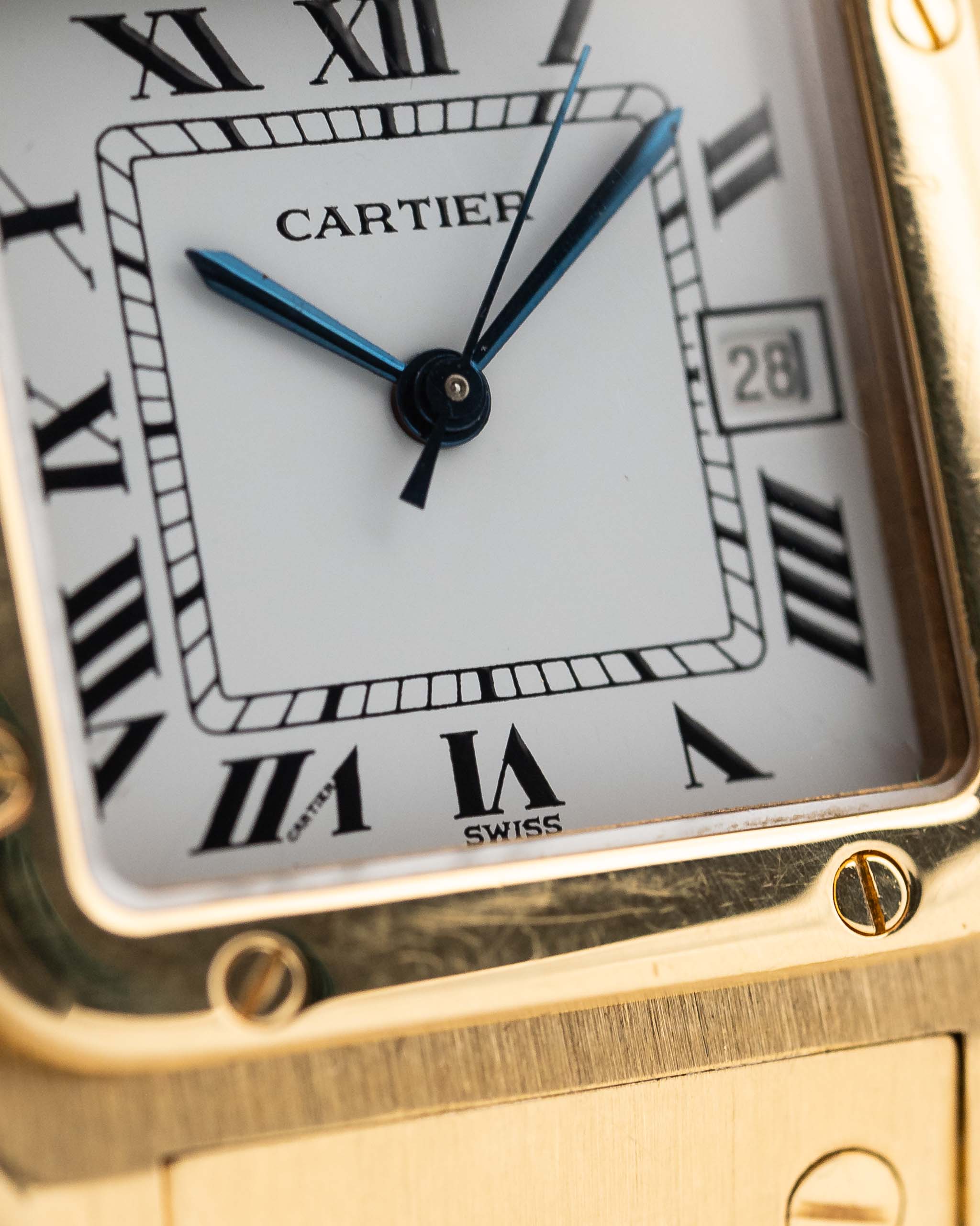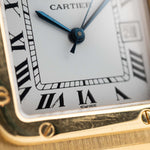 Closeup Photo of a Vintage Cartier Santos Carrée 2964 Dial from the 1980s. In Excellent condition, 27mm case in Yellow Gold with Automatic movement, Original white dial and Gold bracelet.