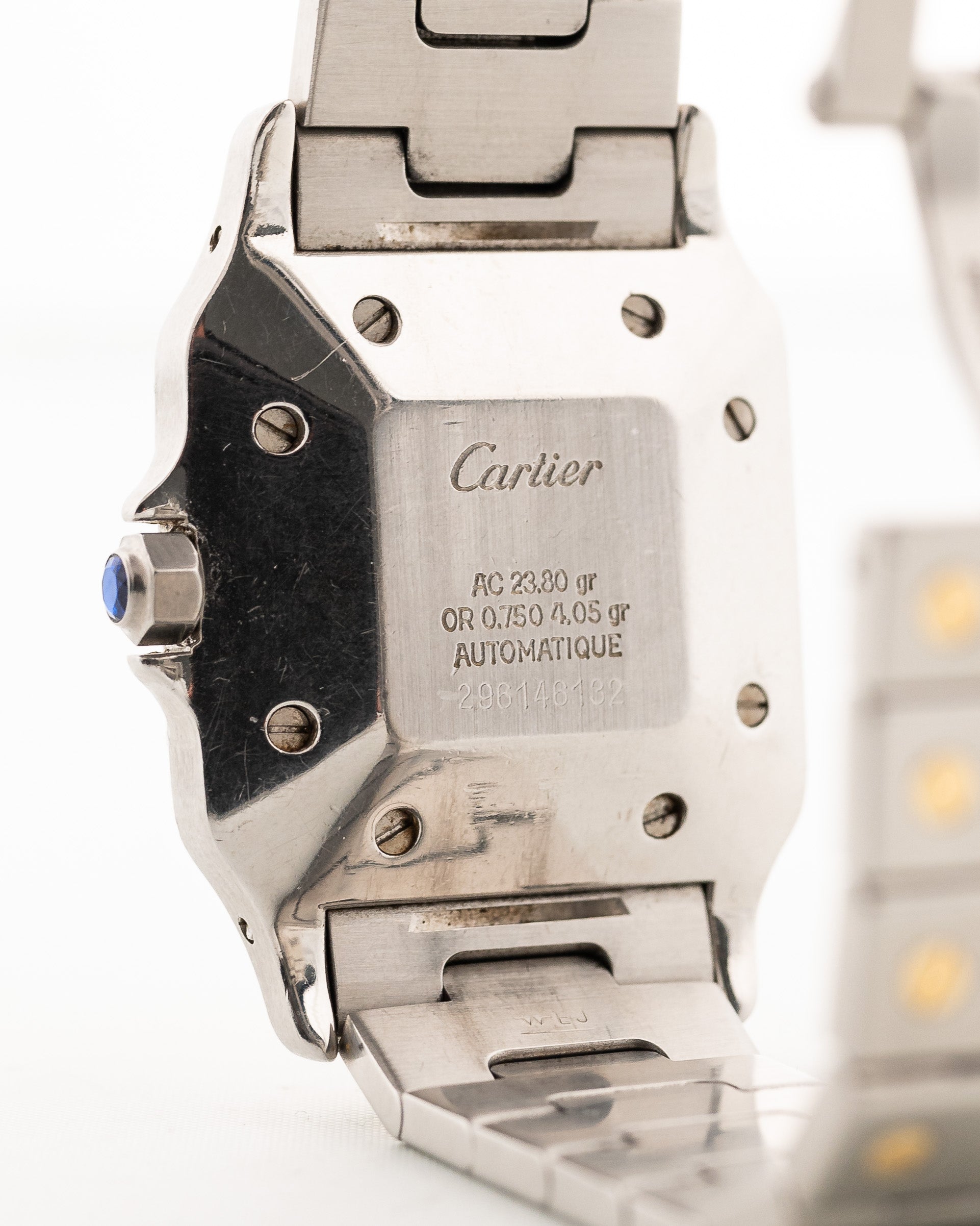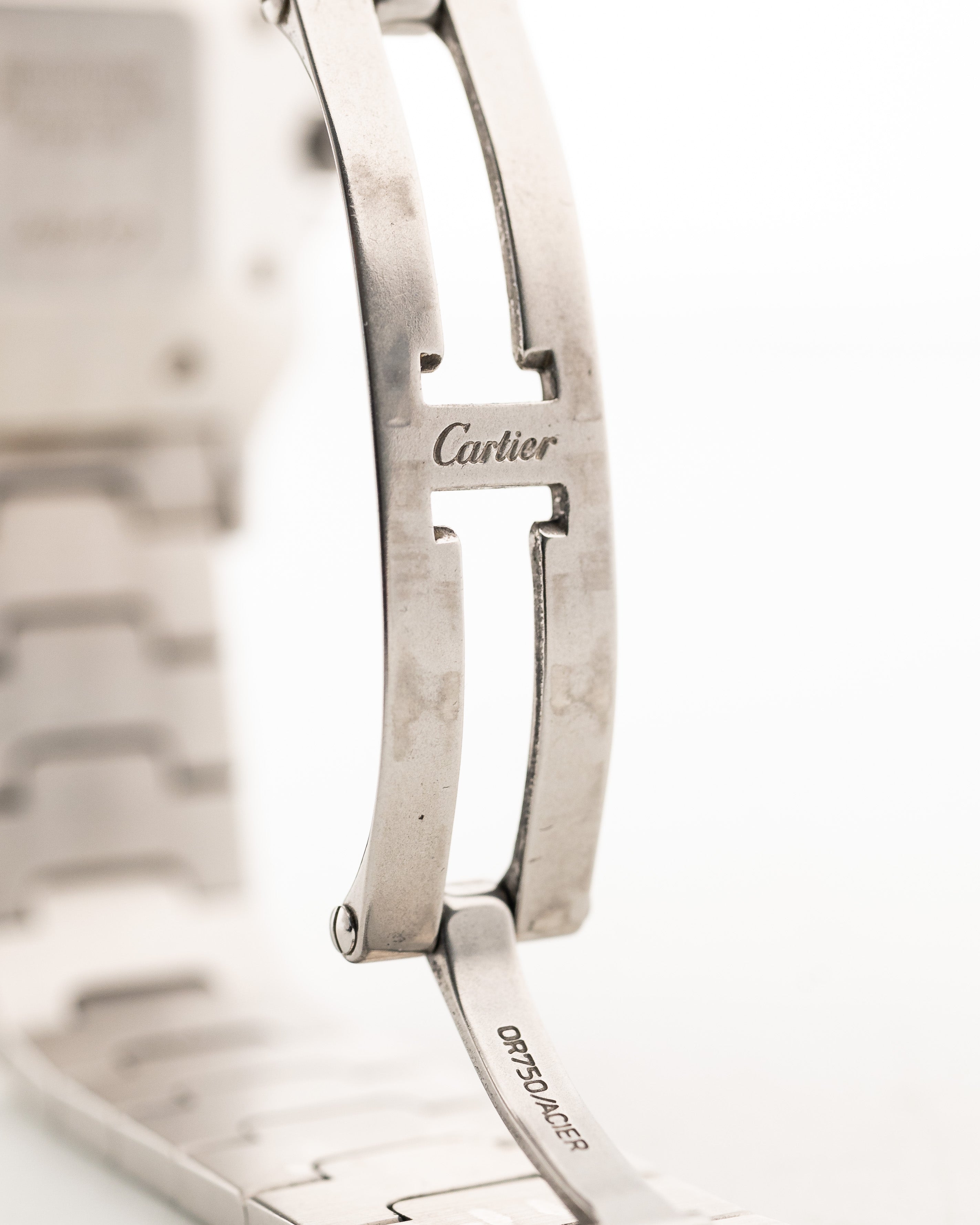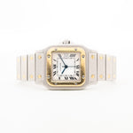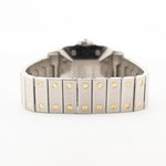 This two-tone stainless steel Cartier Santos Carrée cuts a striking figure with its white dial, blued steel hands, and of course, the 18k gold accents.