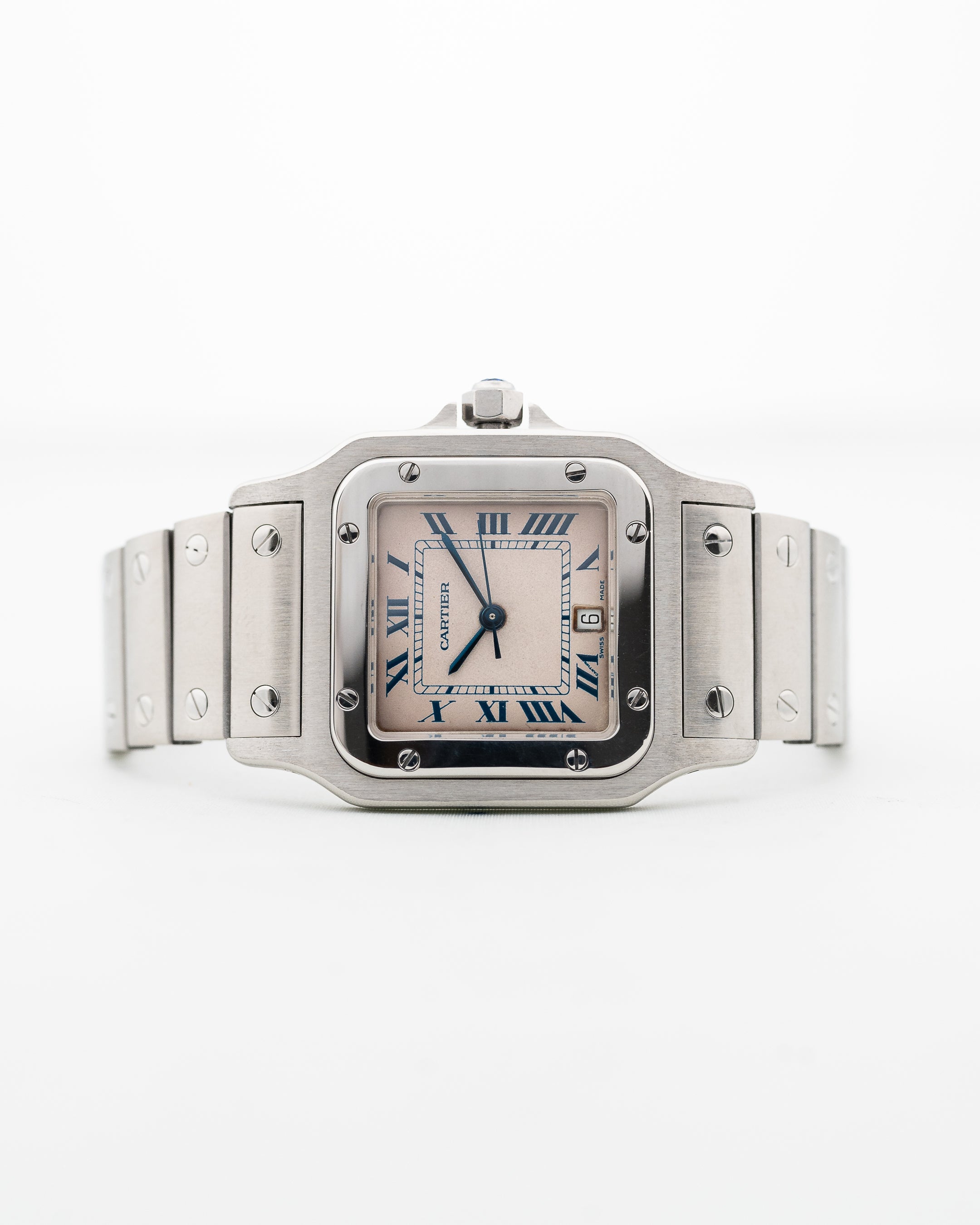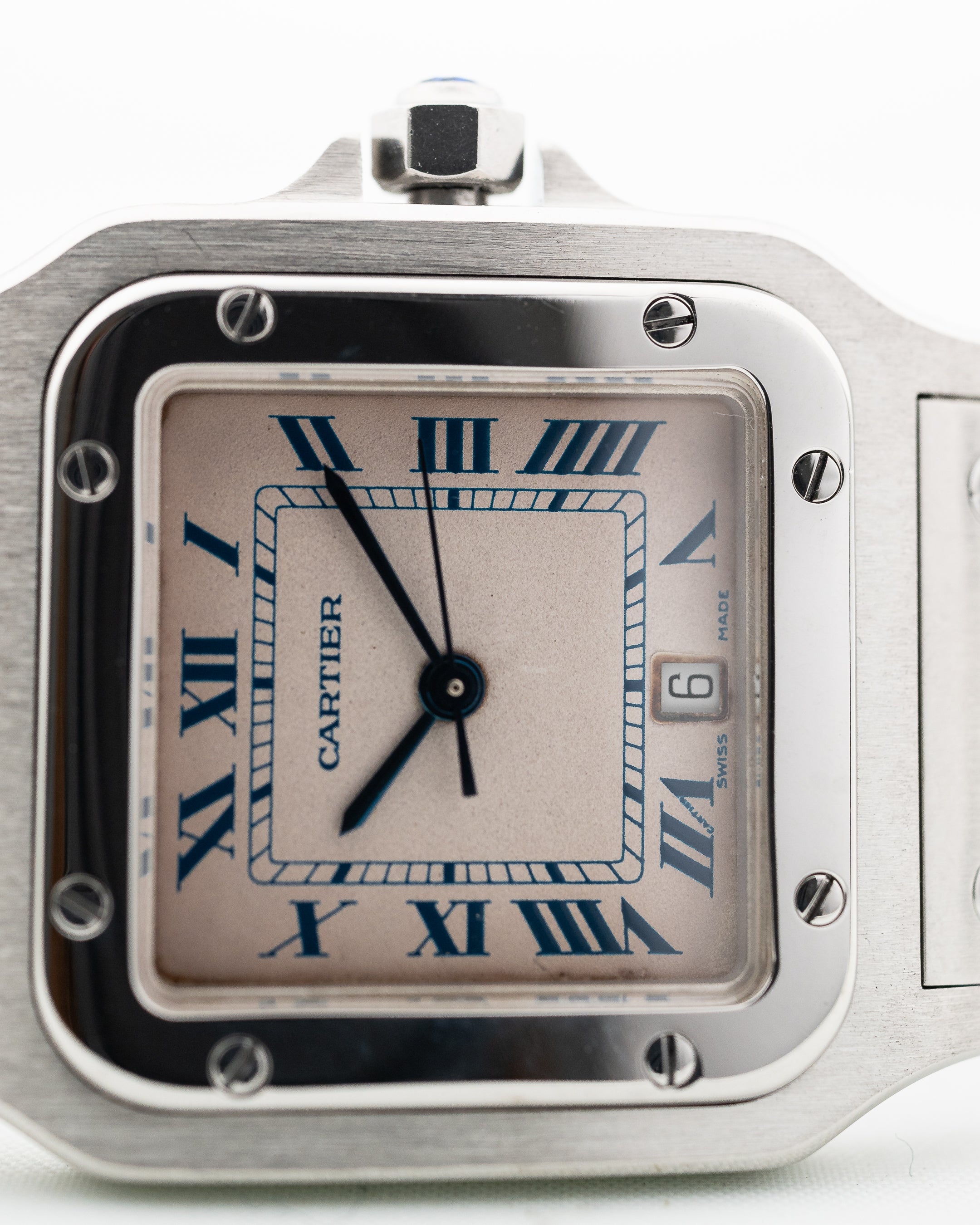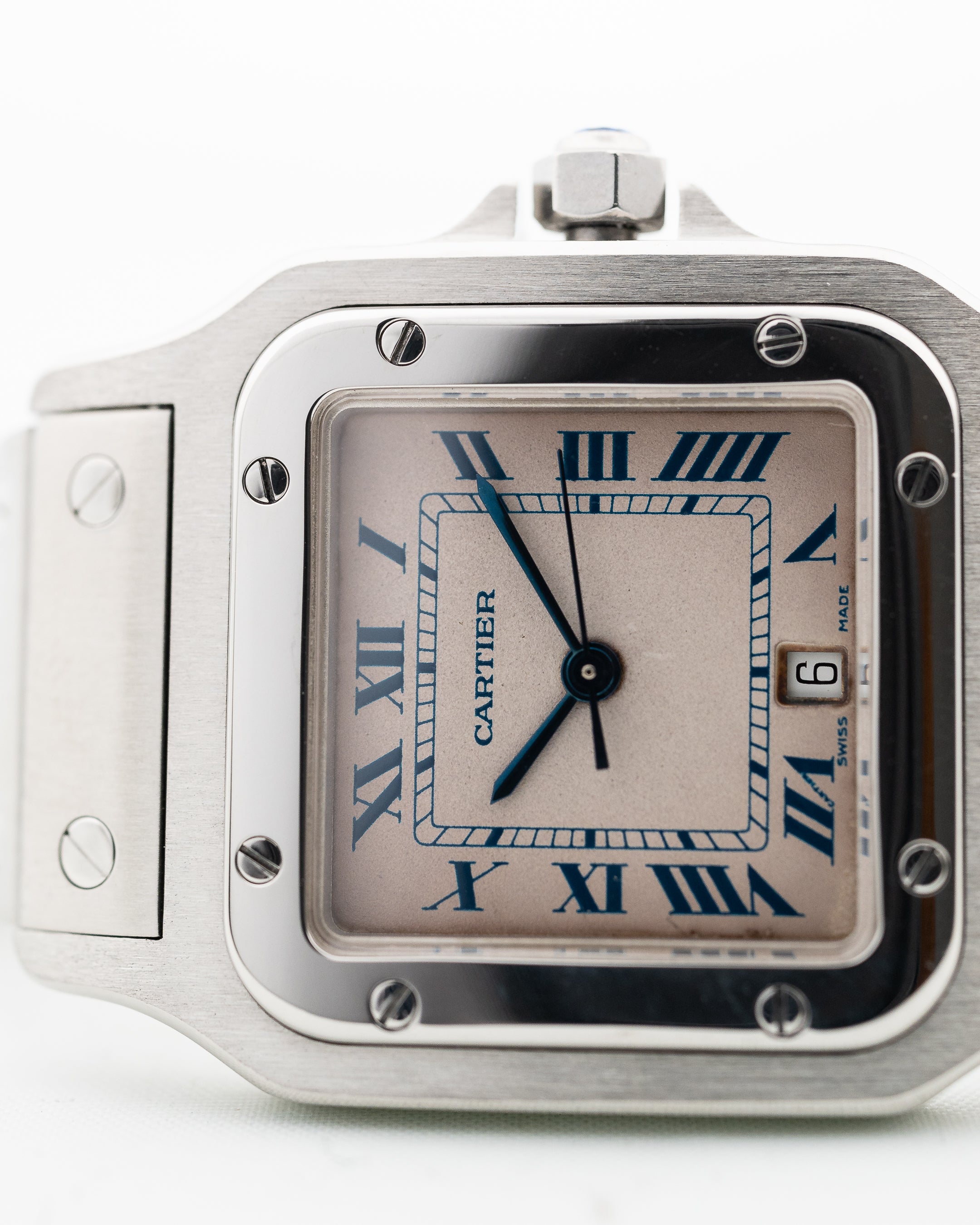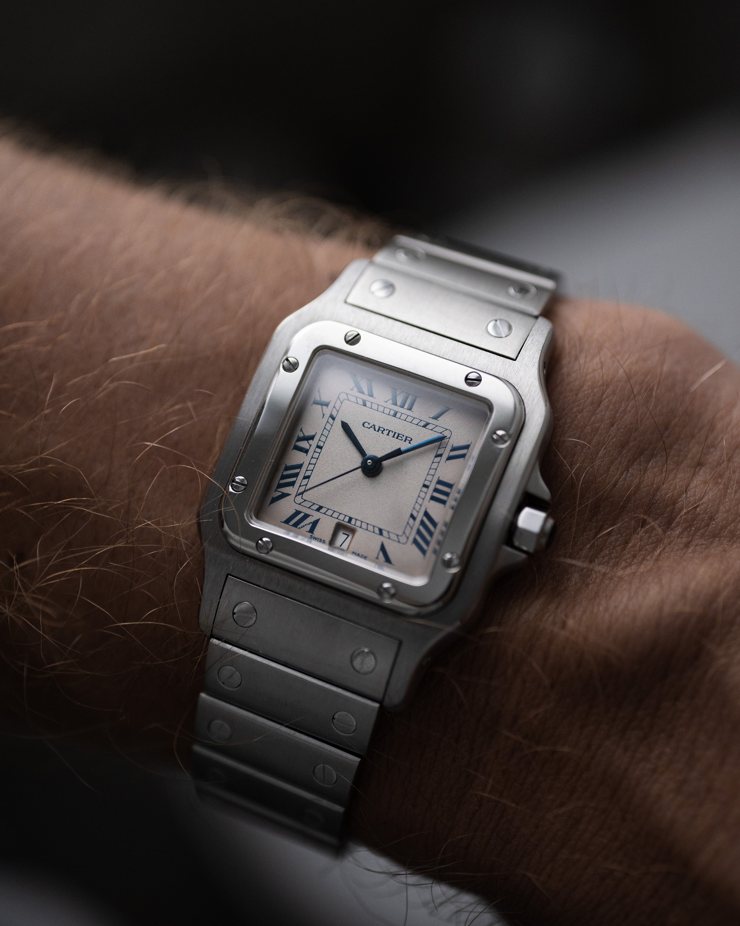 This stainless steel Cartier Santos Galbée cuts a striking figure with its beautiful dial, blued steel hands, and of course, the blue Roman numerals.