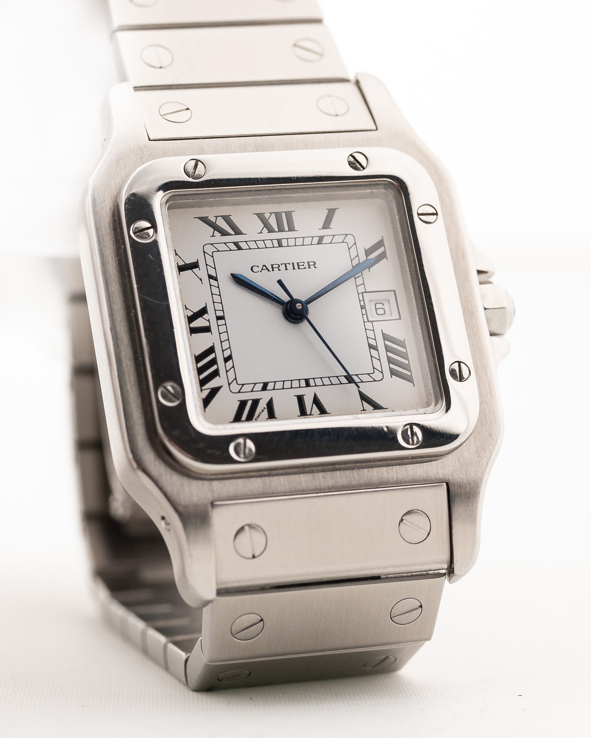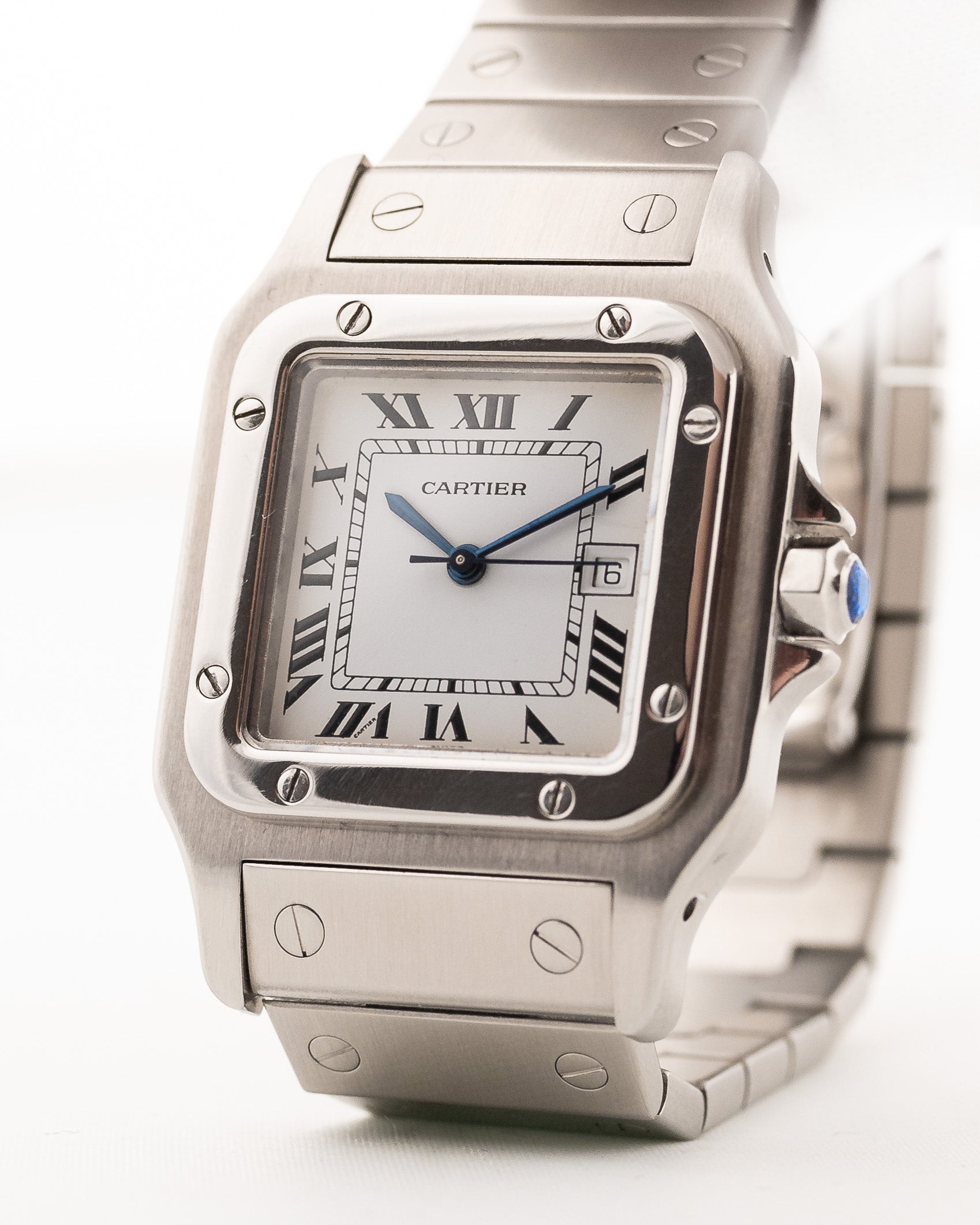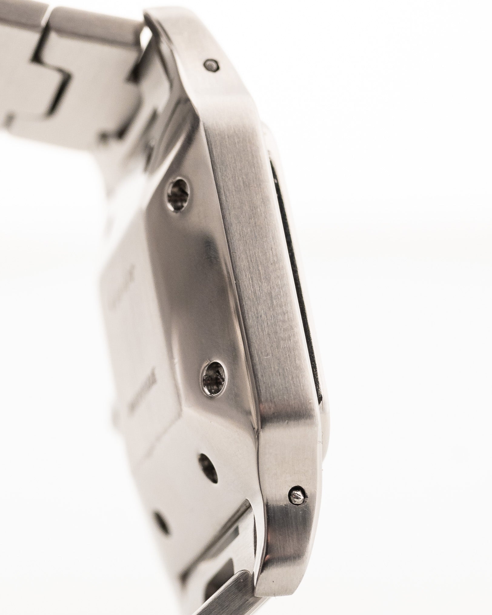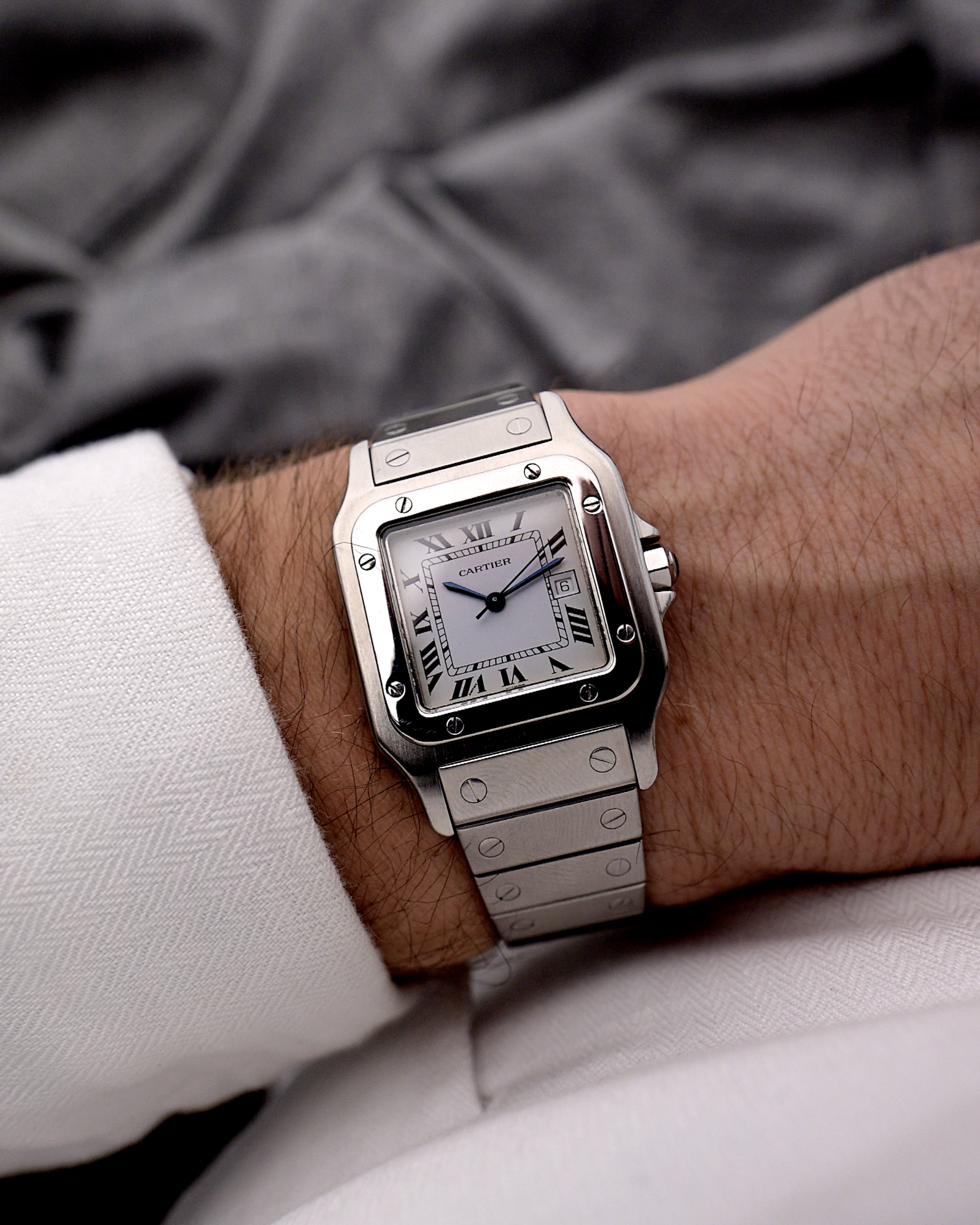 This stainless steel Cartier Santos Carrée cuts a striking figure with its white dial, blued steel hands.