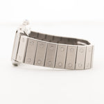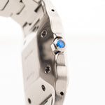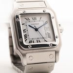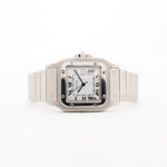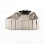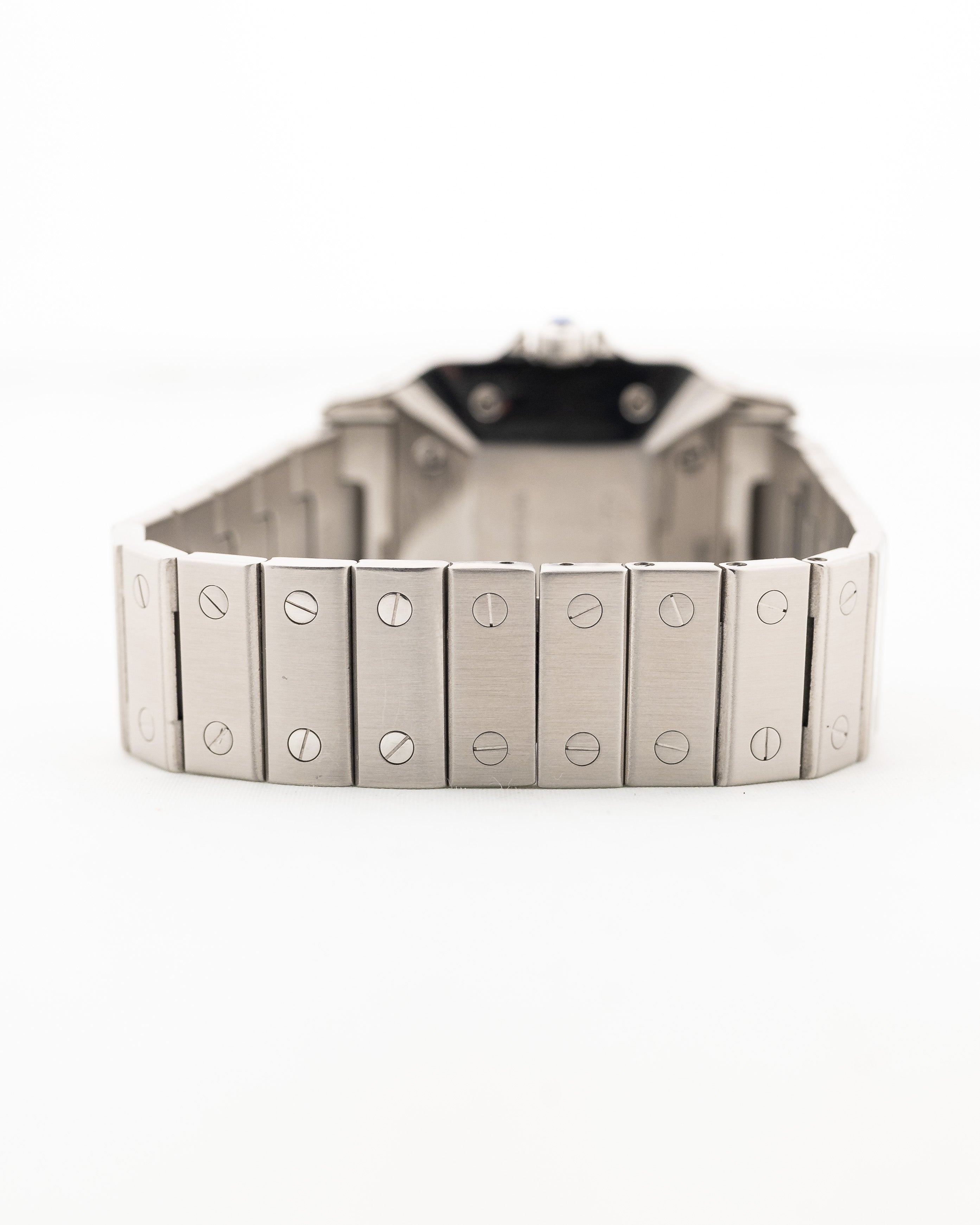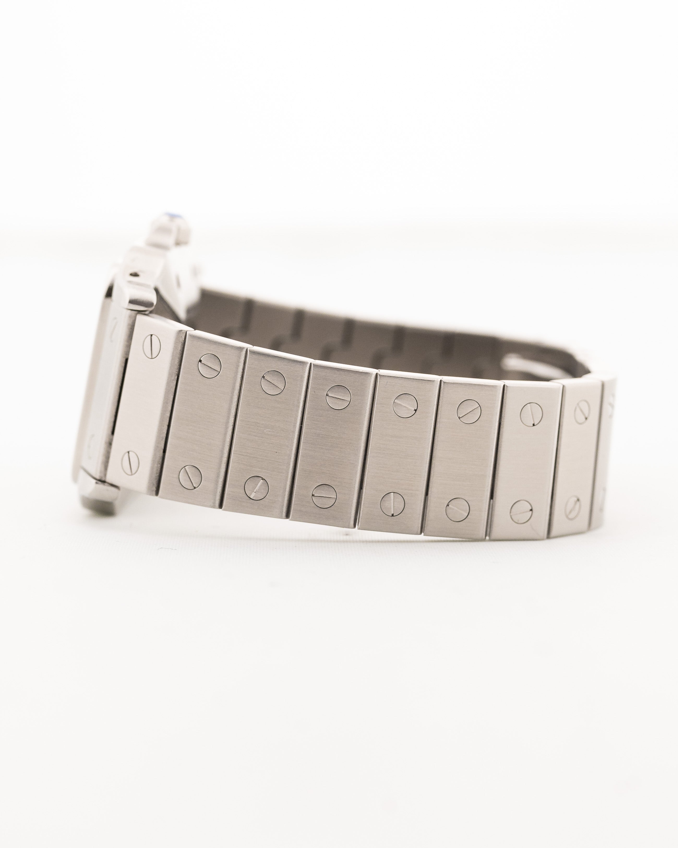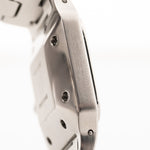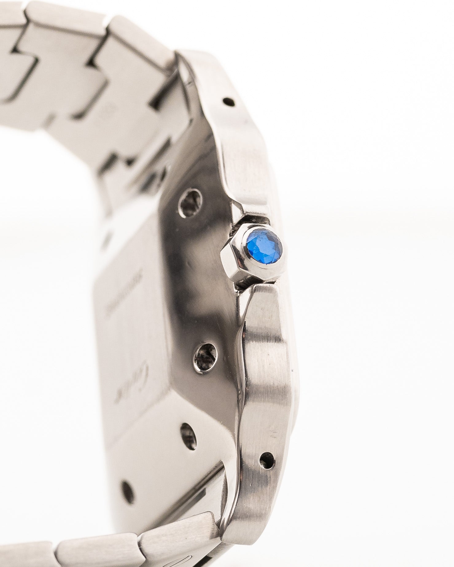 This stainless steel Cartier Santos Carrée cuts a striking figure with its white dial, blued steel hands.