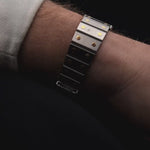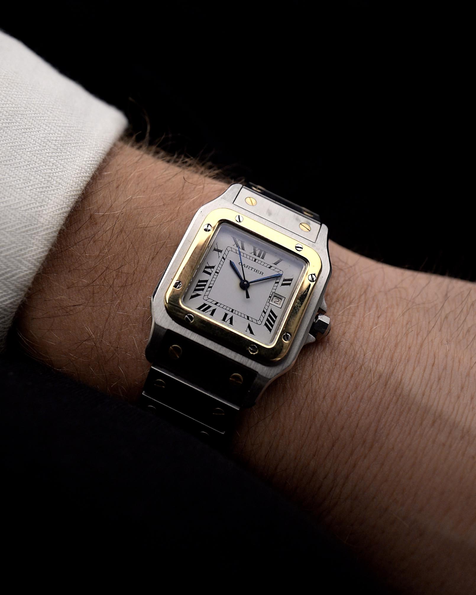 This two-tone stainless steel Cartier Santos Carrée cuts a striking figure with its white dial, blued steel hands, and of course, the 18k gold accents.